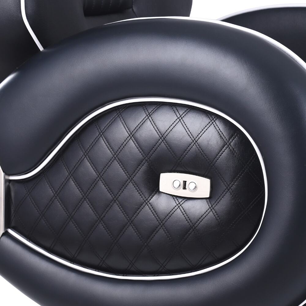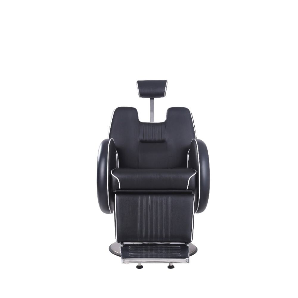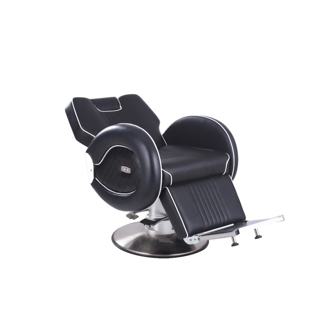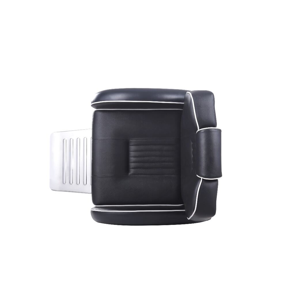 This barber chair is a stunning combination of sophistication and practicality. Crafted with sleek black leather and accentuated by crisp white piping, it exudes an air of modern elegance. The chair boasts a meticulously designed ergonomic structure, with a well - padded backrest, plush armrests, and a comfortable footrest, all ensuring clients enjoy a supremely relaxing experience while getting their hair done.It comes with a smoothly adjustable base, enabling effortless adjustments in height and recline angle.