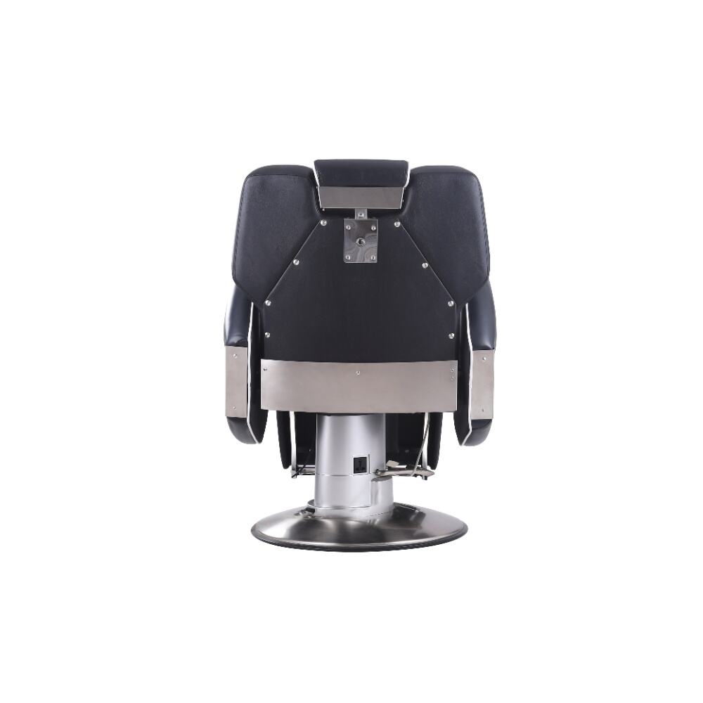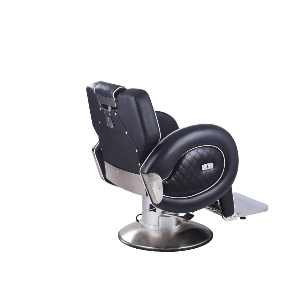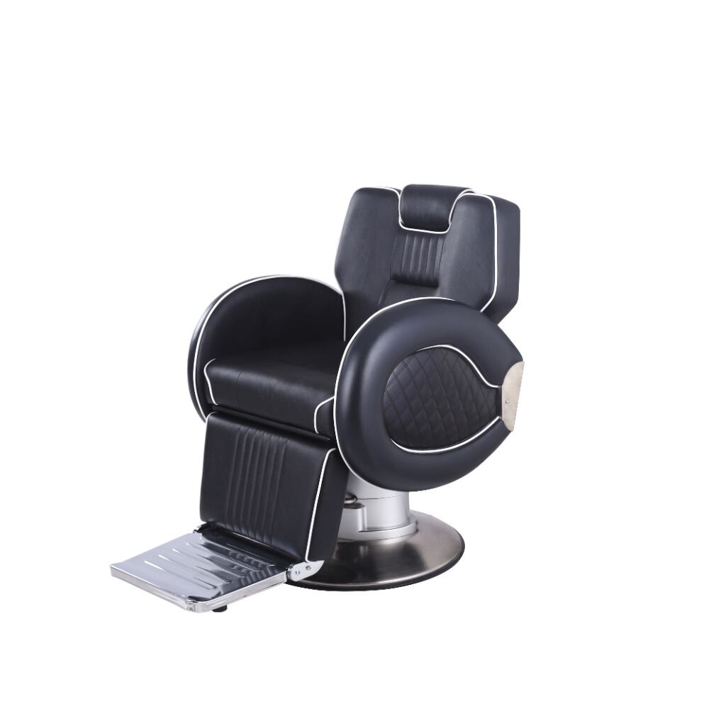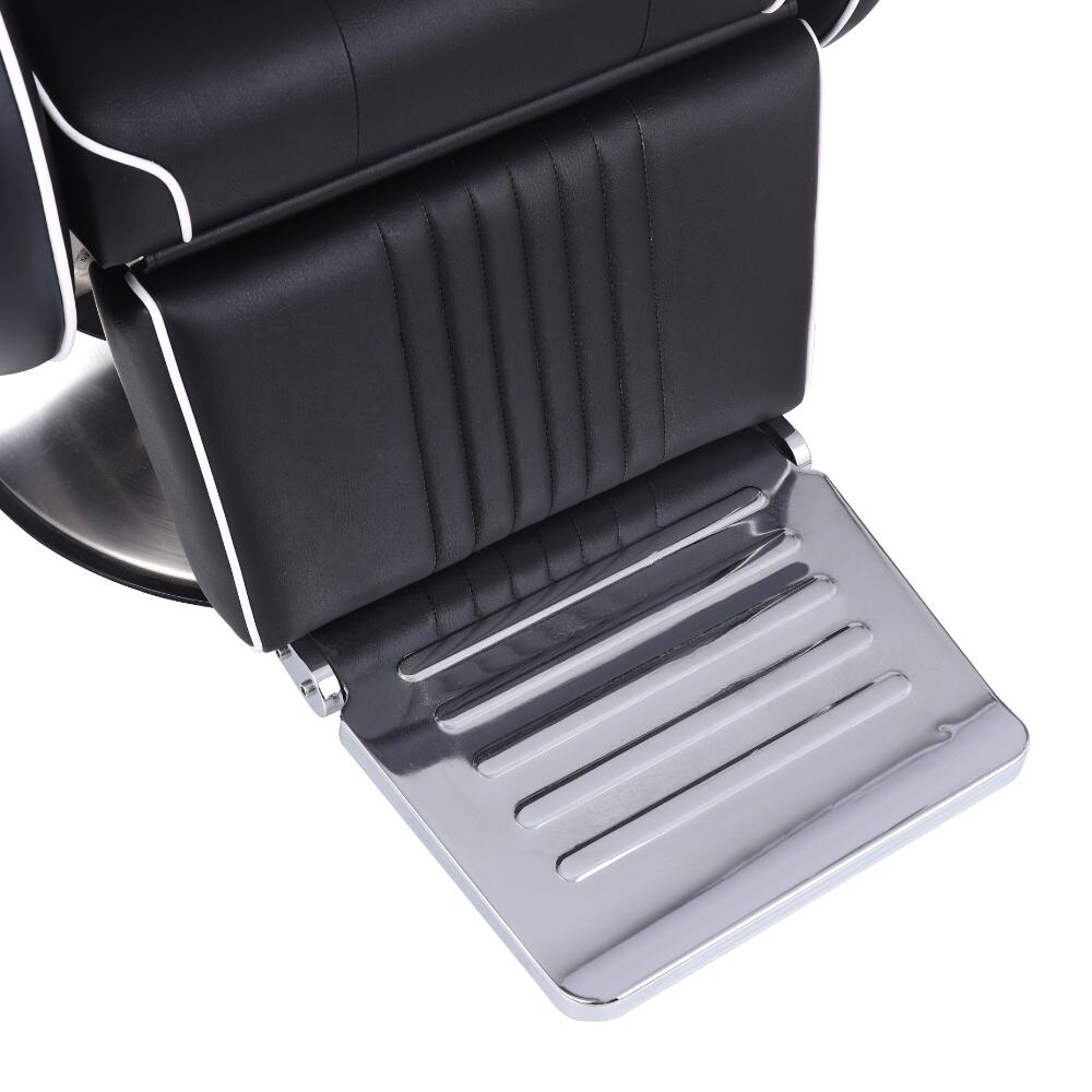 This barber chair is a stunning combination of sophistication and practicality. Crafted with sleek black leather and accentuated by crisp white piping, it exudes an air of modern elegance. The chair boasts a meticulously designed ergonomic structure, with a well - padded backrest, plush armrests, and a comfortable footrest, all ensuring clients enjoy a supremely relaxing experience while getting their hair done.It comes with a smoothly adjustable base, enabling effortless adjustments in height and recline angle. This not only adds to the barber's ease of use but also enhances the client's comfort. The robust, shiny metallic base not only contributes to its visual charm but also guarantees exceptional stability. Whether it's a simple haircut or a complex styling service, this barber chair delivers the utmost in comfort and style, making every grooming session a delightful one.