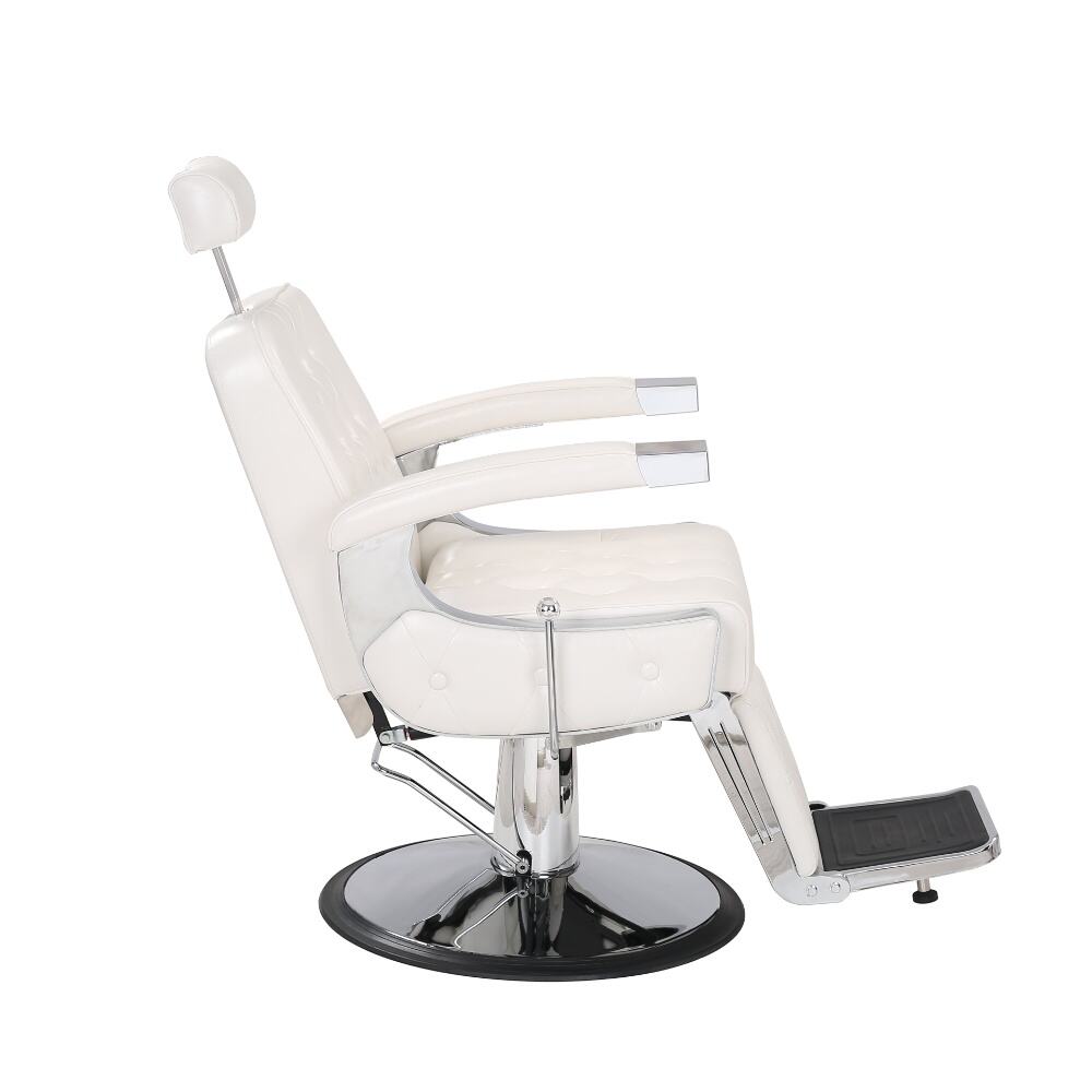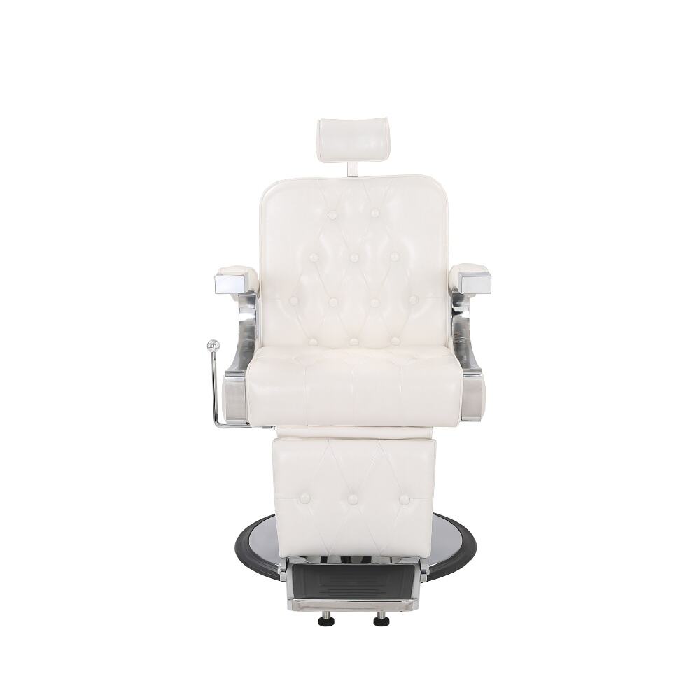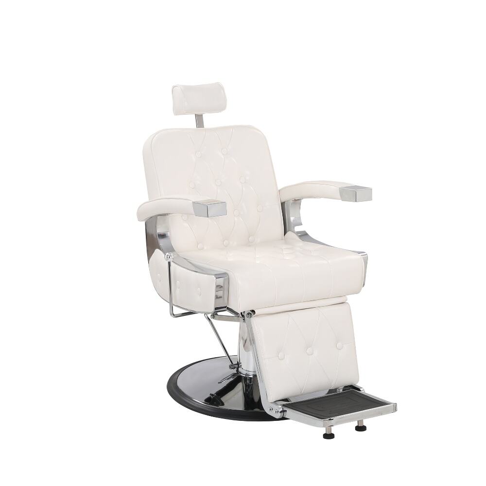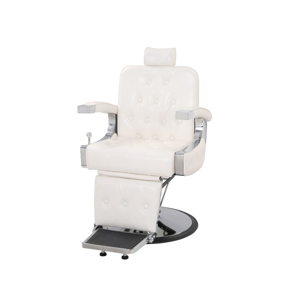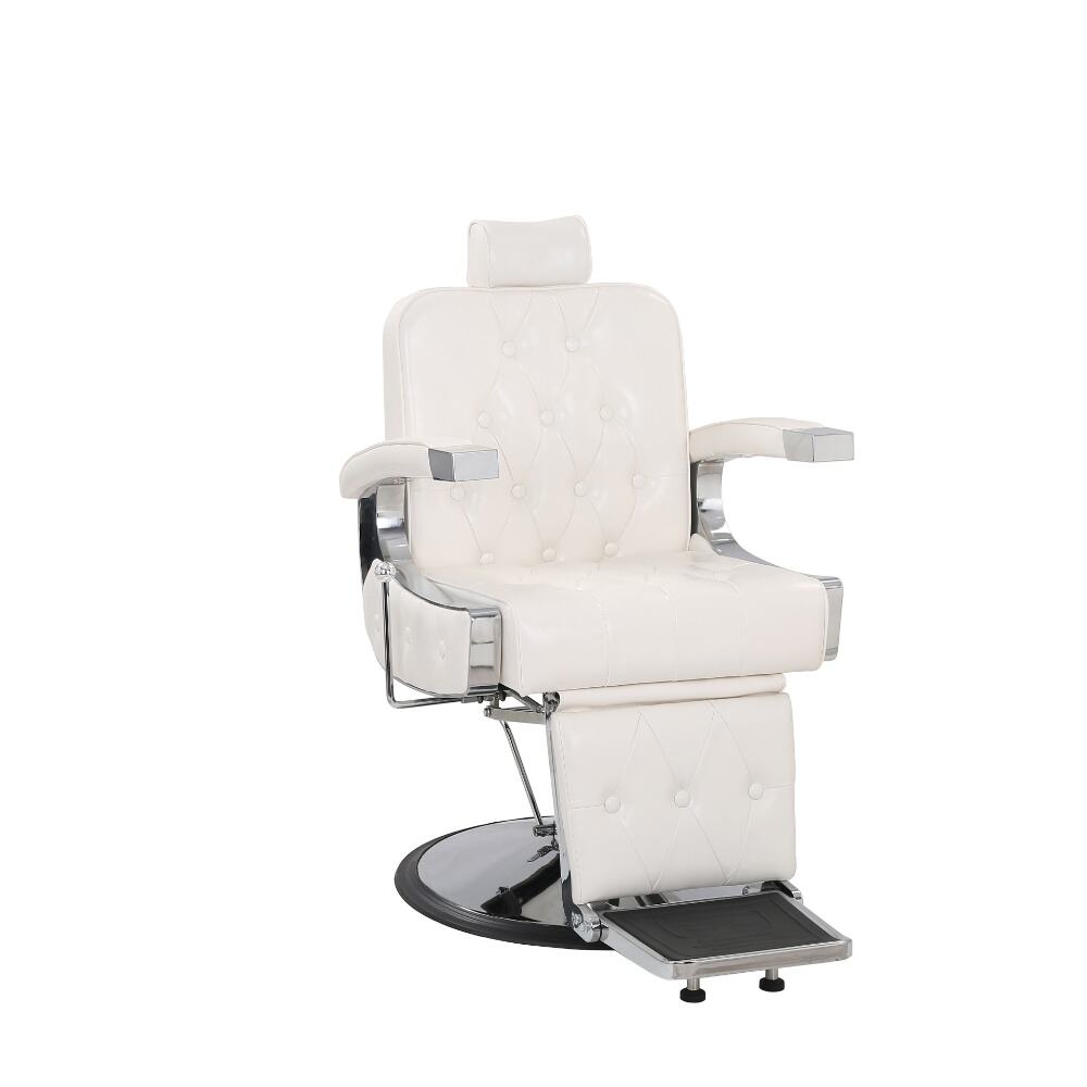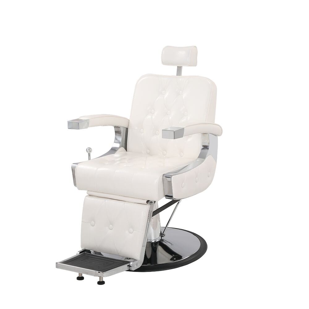This barber chair is a masterpiece of elegance and comfort. Upholstered in pristine white leather with a stylish tufted design, it brings a touch of luxury to any barbershop. The chair features a high, cushioned backrest and comfortable armrests, ensuring clients can relax throughout their grooming experience.It comes with an adjustable base that allows for easy height and recline adjustments, making it convenient for both barbers and clients. The shiny metallic elements add a modern touch to its classic look, while the sturdy base ensures stability. Whether for a simple haircut or a more elaborate styling session, this chair combines comfort, style, and functionality seamlessly.