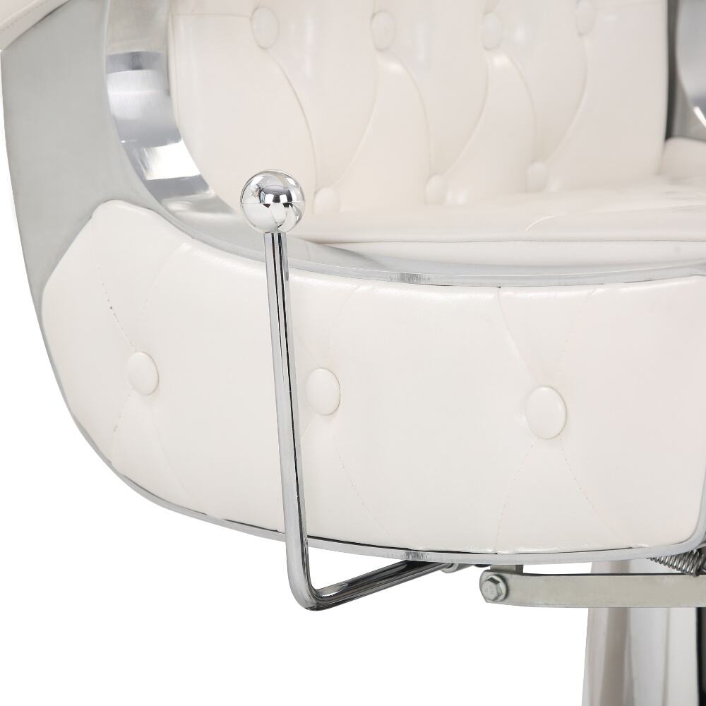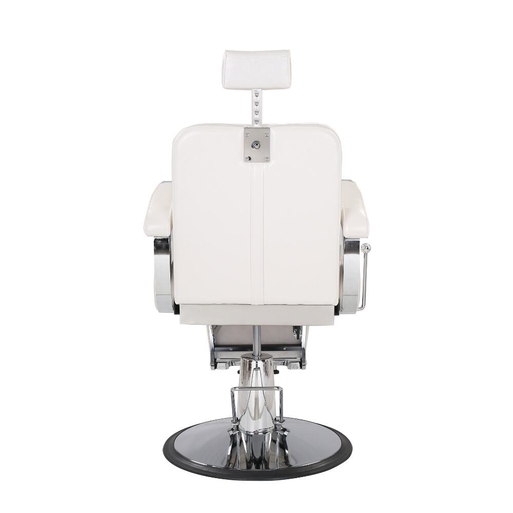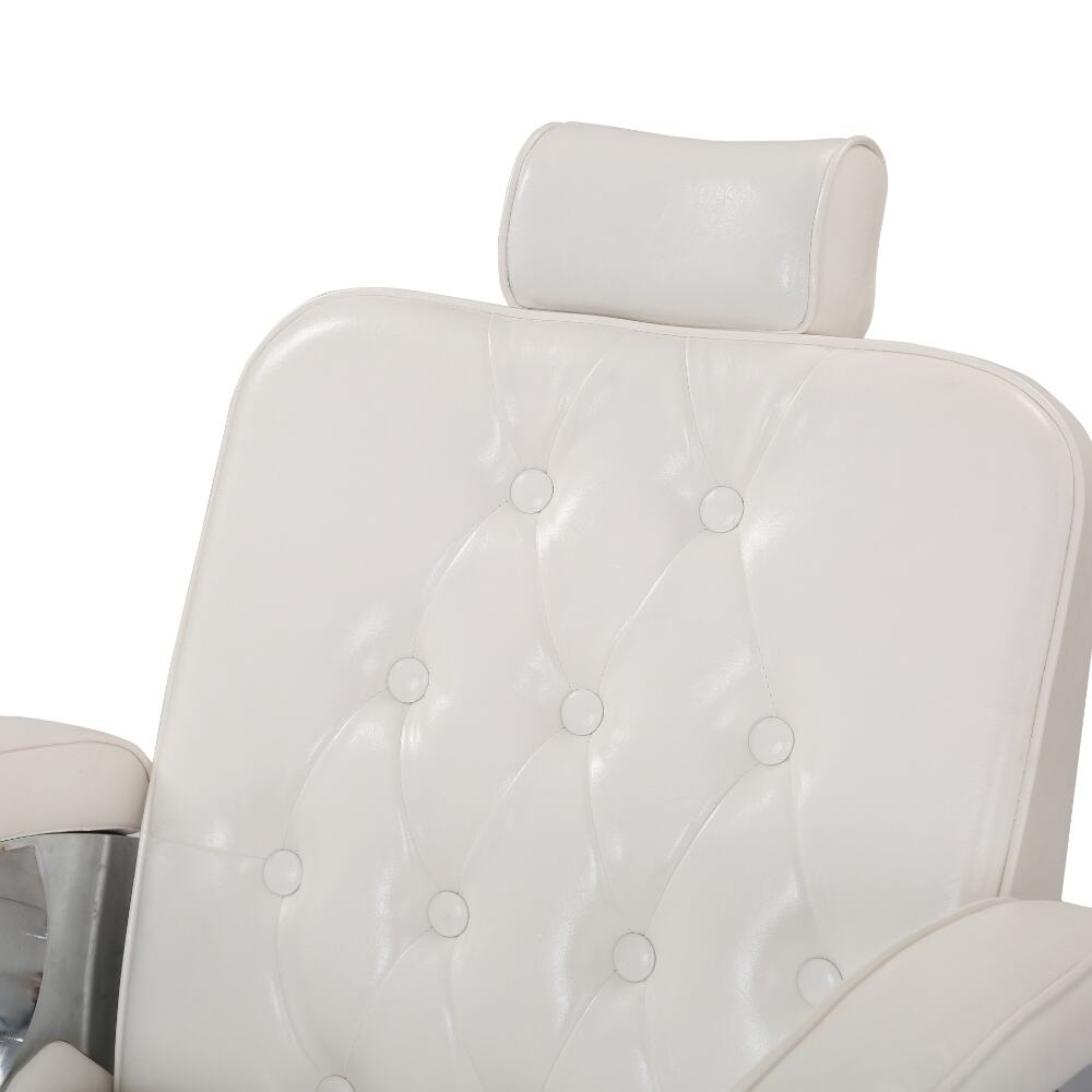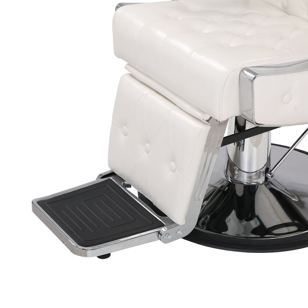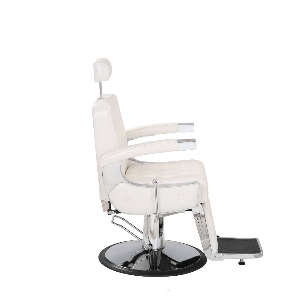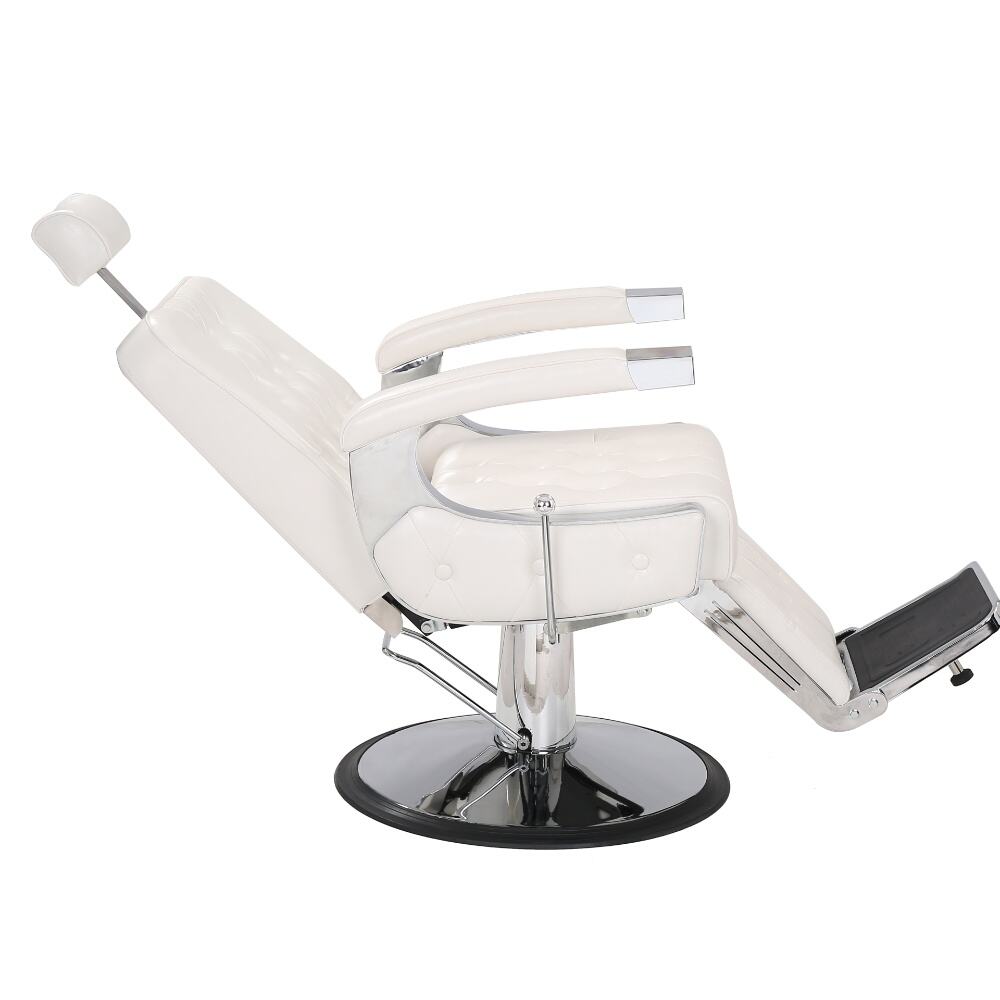 This barber chair is a masterpiece of elegance and comfort. Upholstered in pristine white leather with a stylish tufted design, it brings a touch of luxury to any barbershop. The chair features a high, cushioned backrest and comfortable armrests, ensuring clients can relax throughout their grooming experience.It comes with an adjustable base that allows for easy height and recline adjustments, making it convenient for both barbers and clients. The shiny metallic elements add a modern touch to its classic look, while the sturdy base ensures stability. Whether for a simple haircut or a more elaborate styling session, this chair combines comfort, style, and functionality seamlessly.