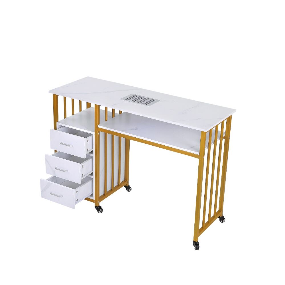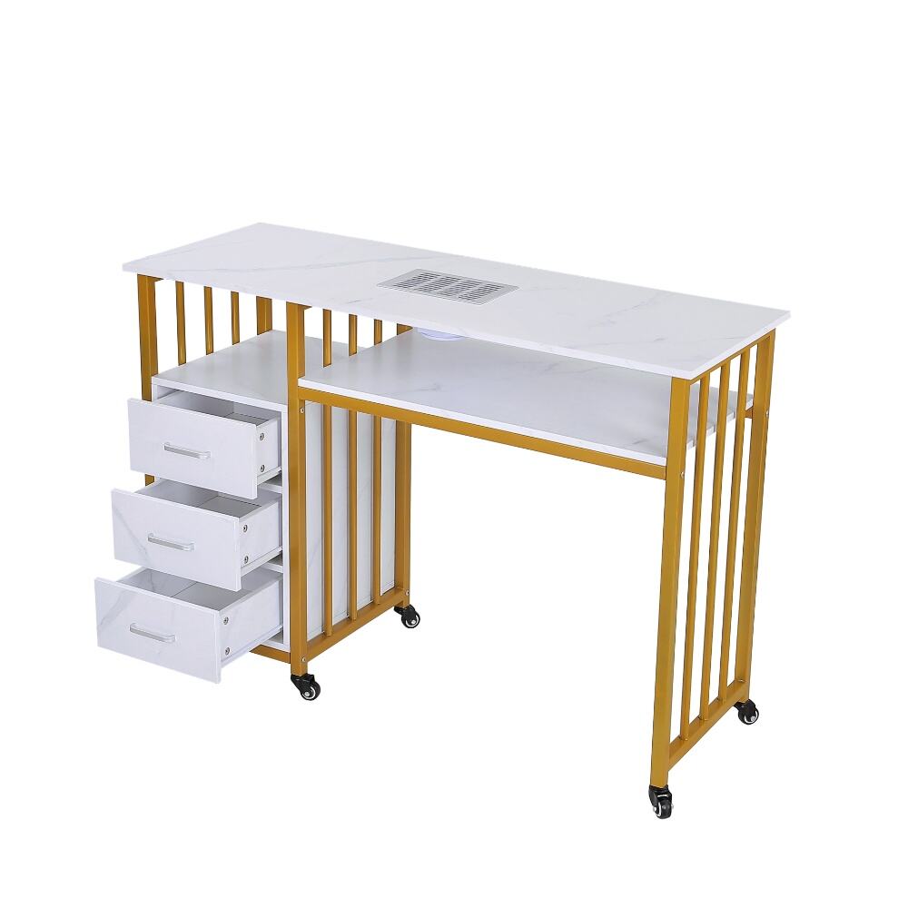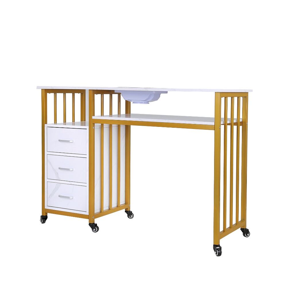 This elegant and versatile nail desk, a perfect fusion of modern design and practical functionality for both professional salons and personal nail care spaces.Featuring a sleek white marble-patterned top paired with a stylish gold metal frame, this desk exudes a sense of luxury and contemporary charm. It comes with an integrated nail dust collector and a spacious lower shelf, ensuring a clean and well-organized workspace during nail treatments.The three-drawer storage unit, with its matching marble finish, provides ample space for nail polishes, tools, and accessories, keeping your essentials neatly arranged and easily accessible. Equipped with smooth-rolling wheels, the desk offers exceptional mobility, allowing you to reposition it effortlessly as needed.Combining durability, aesthetic appeal, and smart storage solutions, this nail desk is an excellent choice for anyone looking to elevate their nail care experience with a touch of sophistication and efficiency.