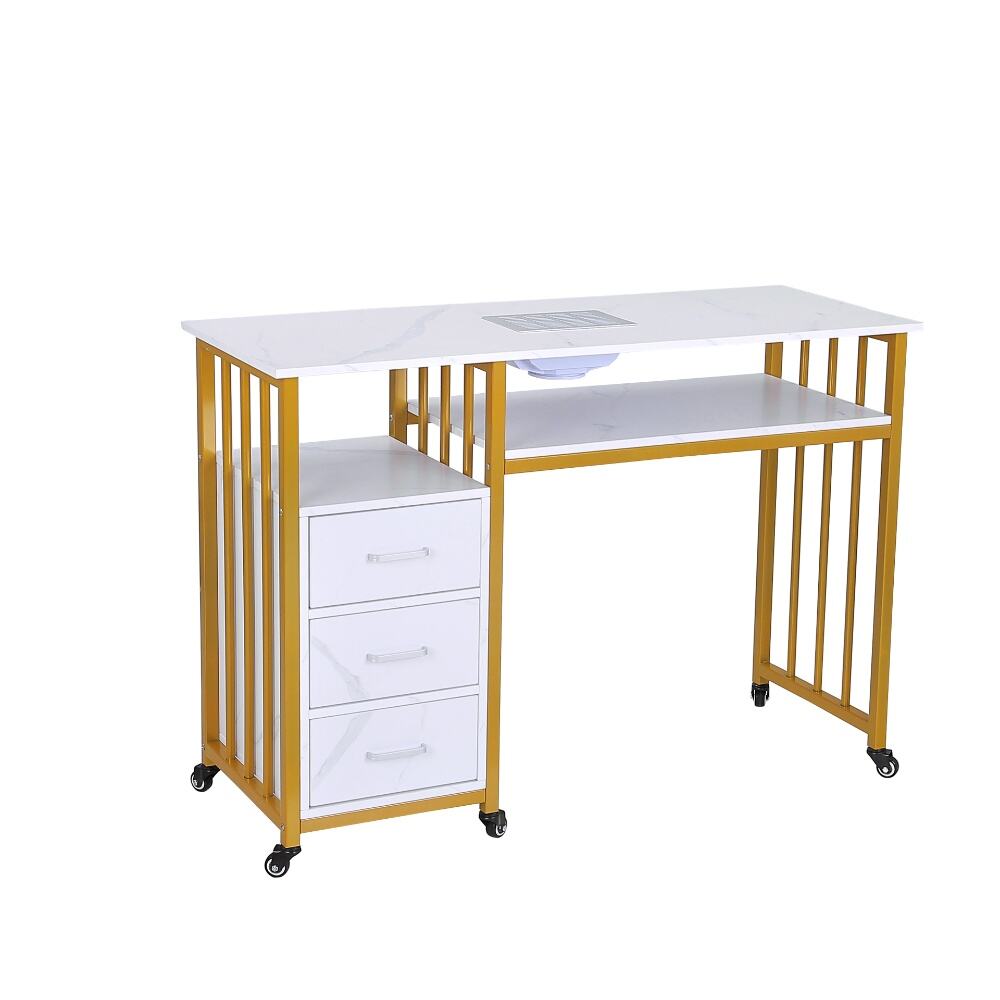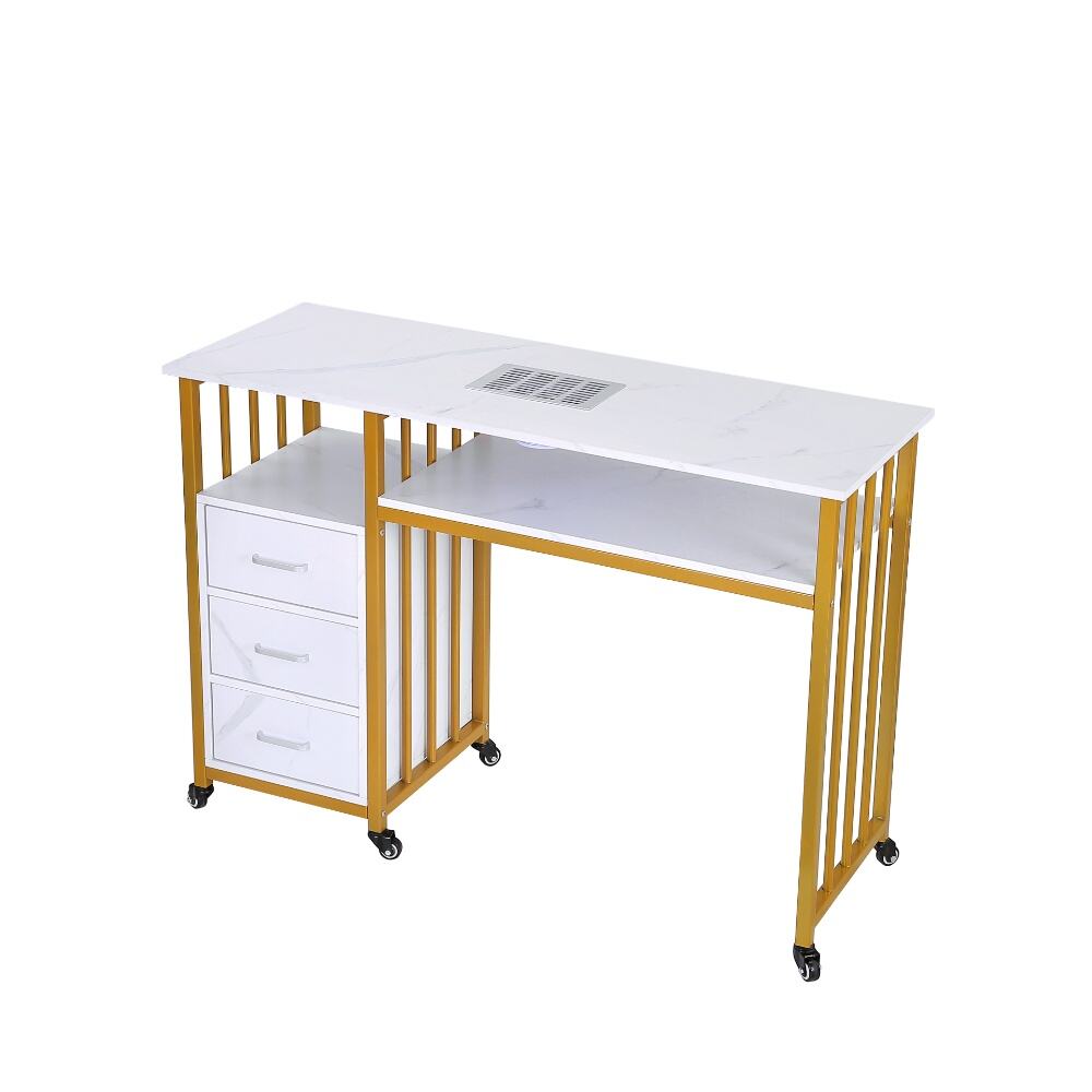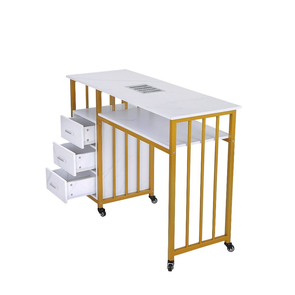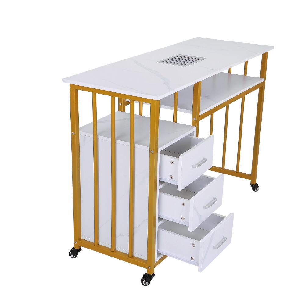 This elegant and versatile nail desk, a perfect fusion of modern design and practical functionality for both professional salons and personal nail care spaces.Featuring a sleek white marble-patterned top paired with a stylish gold metal frame, this desk exudes a sense of luxury and contemporary charm. It comes with an integrated nail dust collector and a spacious lower shelf, ensuring a clean and well-organized workspace during nail treatments.The three-drawer storage unit, with its matching marble finish, provides ample space for nail polishes, tools, and accessories, keeping your essentials neatly arranged and easily accessible. Equipped with smooth-rolling wheels, the desk offers exceptional mobility, allowing you to reposition it effortlessly as needed.Combining durability, aesthetic appeal, and smart storage solutions, this nail desk is an excellent choice for anyone looking to elevate their nail care experience with a touch of sophistication and efficiency.