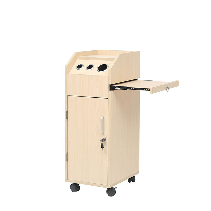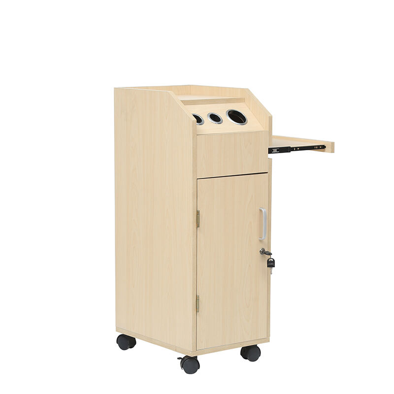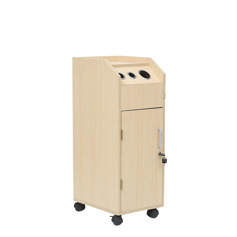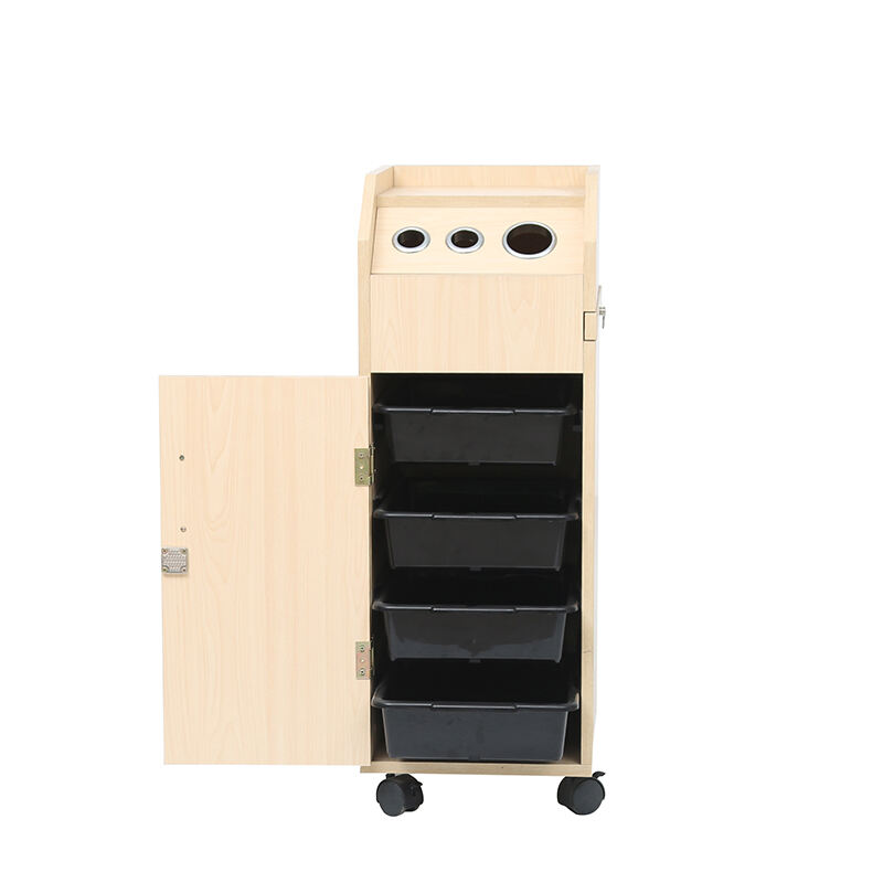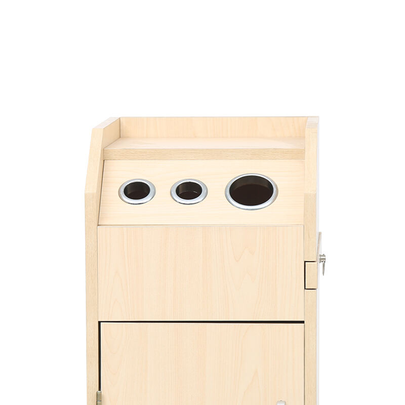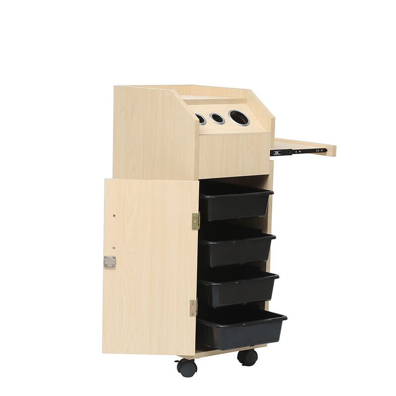 This hairdressing trolley is a practical and versatile tool for salons. Crafted with light wood-grain material, it features a sleek and professional design.It comes with multiple storage solutions: four black trays behind the cabinet door for organizing various hairdressing tools, products, or accessories.