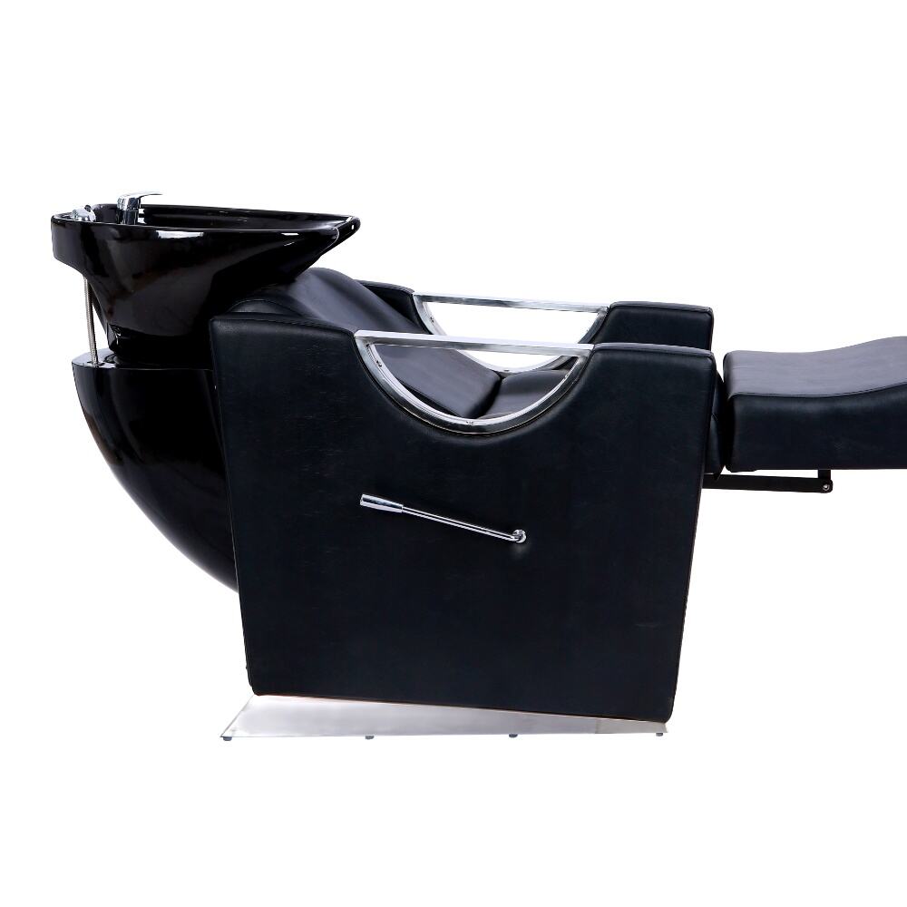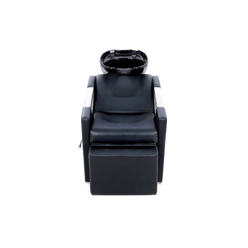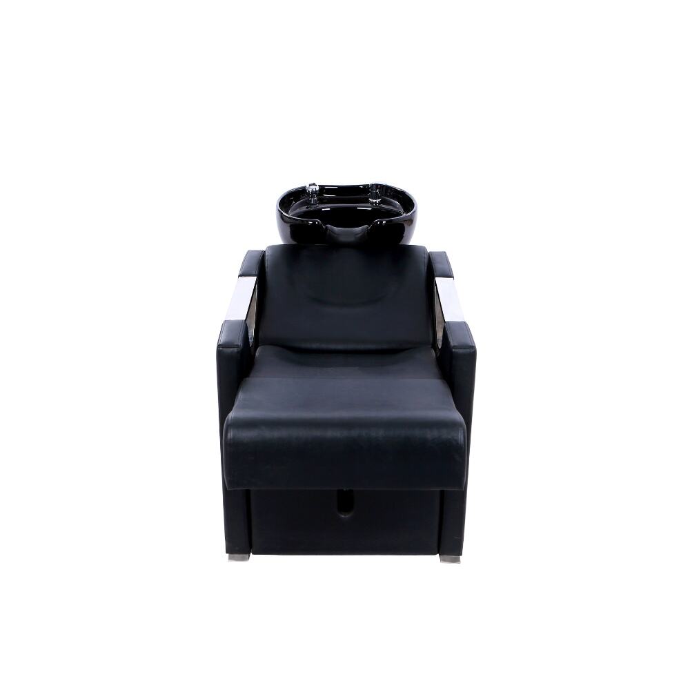 This shampoo chair, a perfect combination of modern design, comfort, and practicality for salons.Upholstered in premium black leather, it features a contoured seat and backrest that provide exceptional comfort for clients during hair washing. The sleek black shampoo bowl, equipped with polished fixtures, ensures a smooth and efficient washing process. Stainless-steel accents on the armrests and base add a touch of modern sophistication and durability.Designed with user convenience in mind, the integrated footrest enhances relaxation, while the robust structure guarantees long-term use. This chair is an excellent choice for salons that want to offer a comfortable, stylish, and functional hair-washing experience, blending contemporary aesthetics with everyday usability.