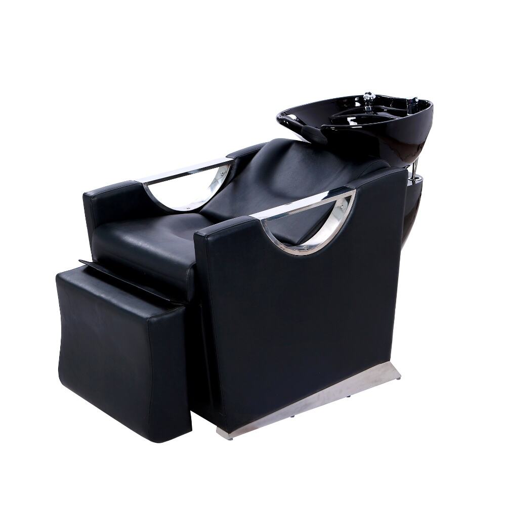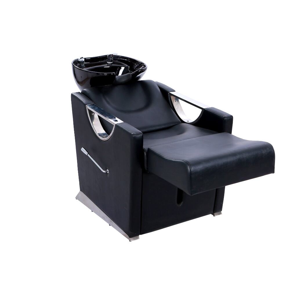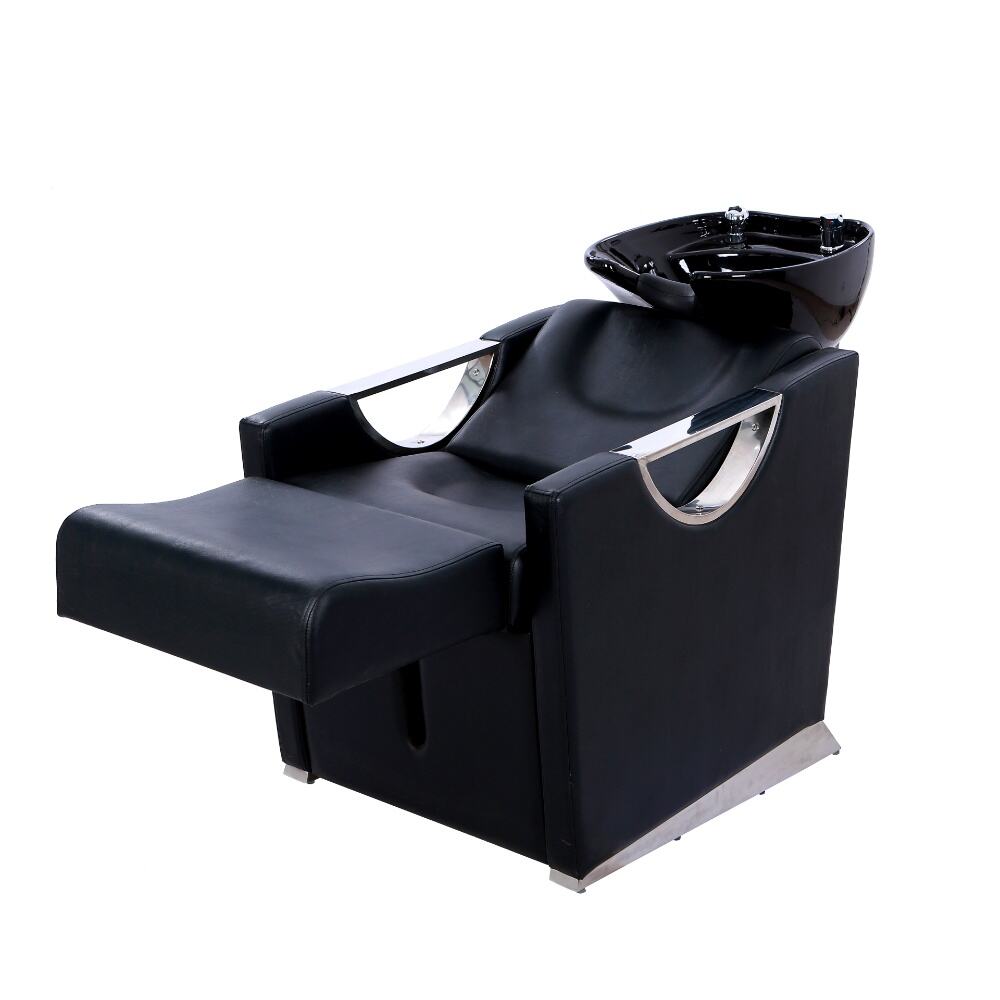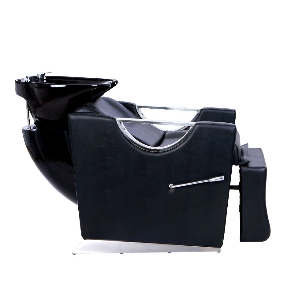 This shampoo chair, a perfect combination of modern design, comfort, and practicality for salons.Upholstered in premium black leather, it features a contoured seat and backrest that provide exceptional comfort for clients during hair washing. The sleek black shampoo bowl, equipped with polished fixtures, ensures a smooth and efficient washing process. Stainless-steel accents on the armrests and base add a touch of modern sophistication and durability.Designed with user convenience in mind, the integrated footrest enhances relaxation, while the robust structure guarantees long-term use. This chair is an excellent choice for salons that want to offer a comfortable, stylish, and functional hair-washing experience, blending contemporary aesthetics with everyday usability.