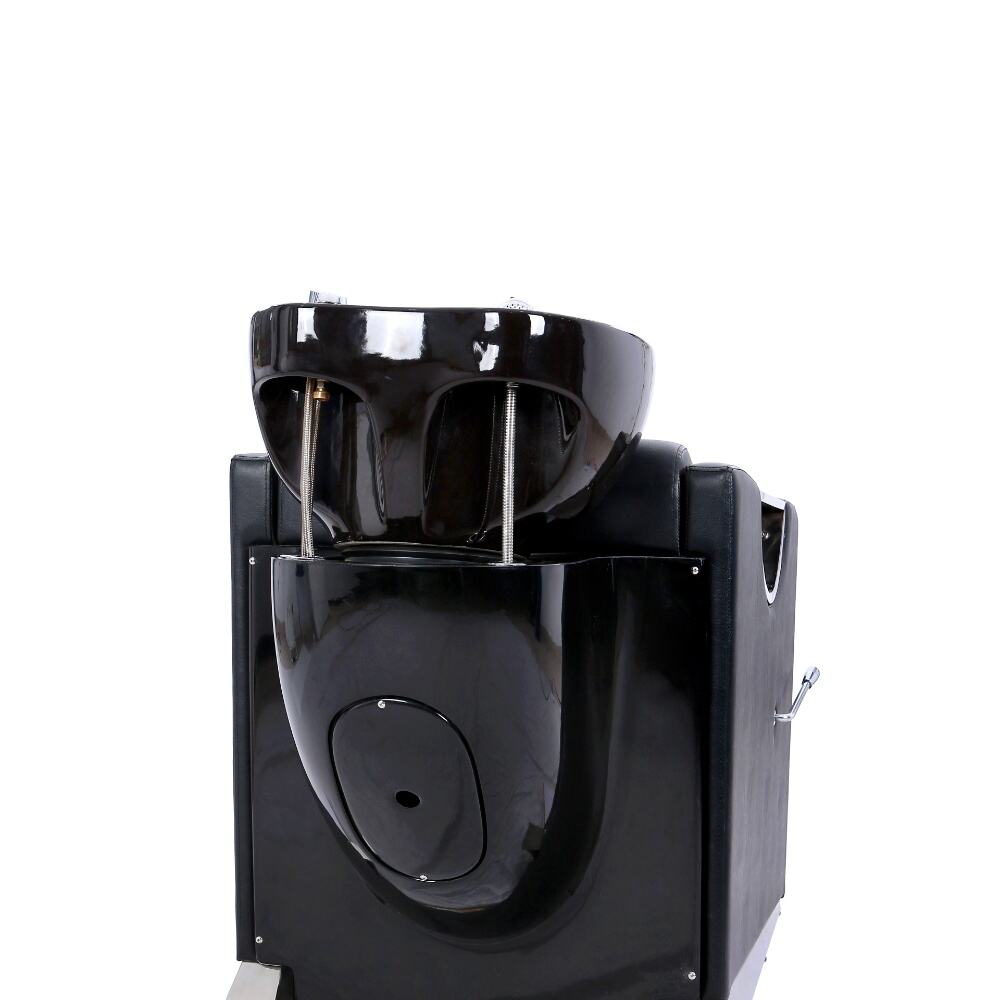 This shampoo chair, a perfect combination of modern design, comfort, and practicality for salons.Upholstered in premium black leather, it features a contoured seat and backrest that provide exceptional comfort for clients during hair washing. The sleek black shampoo bowl, equipped with polished fixtures, ensures a smooth and efficient washing process.
