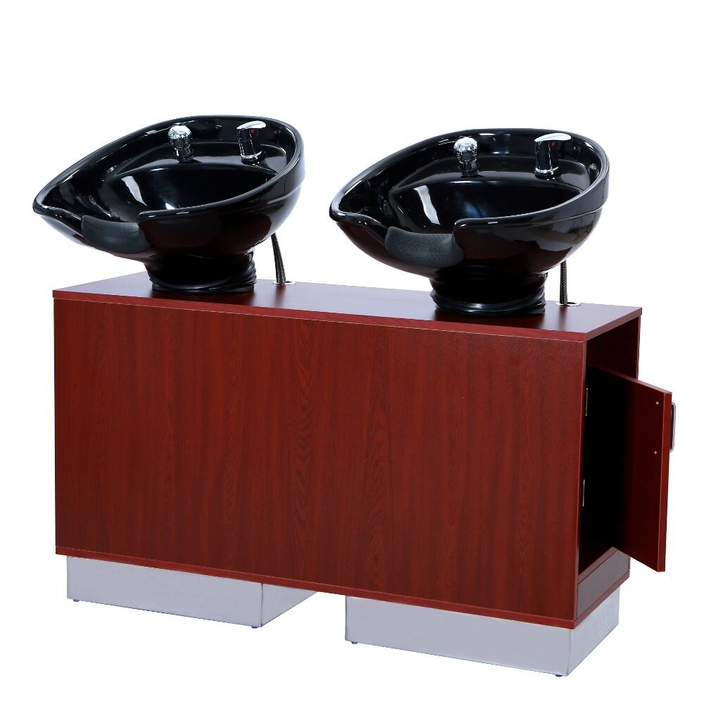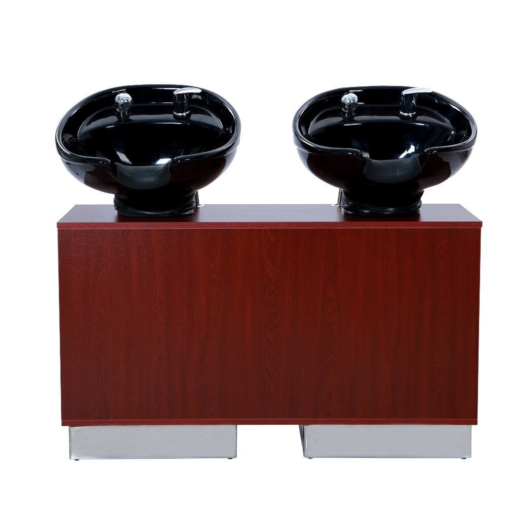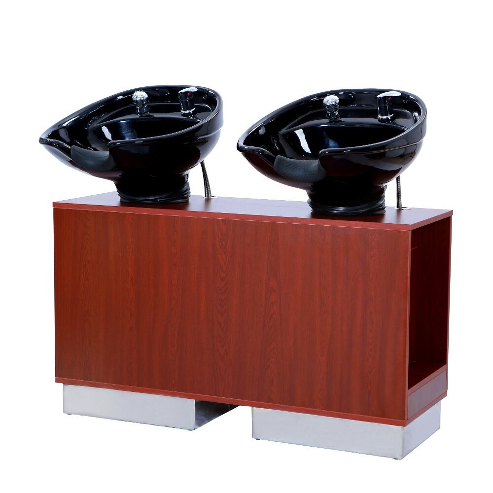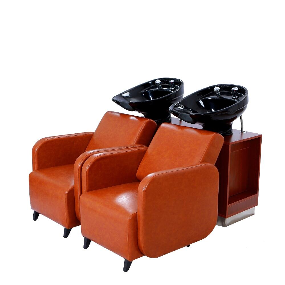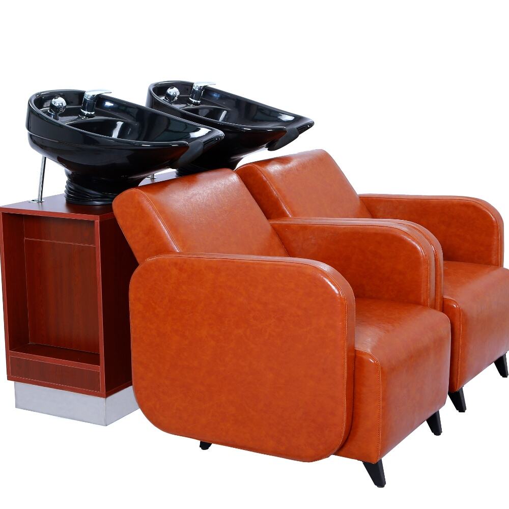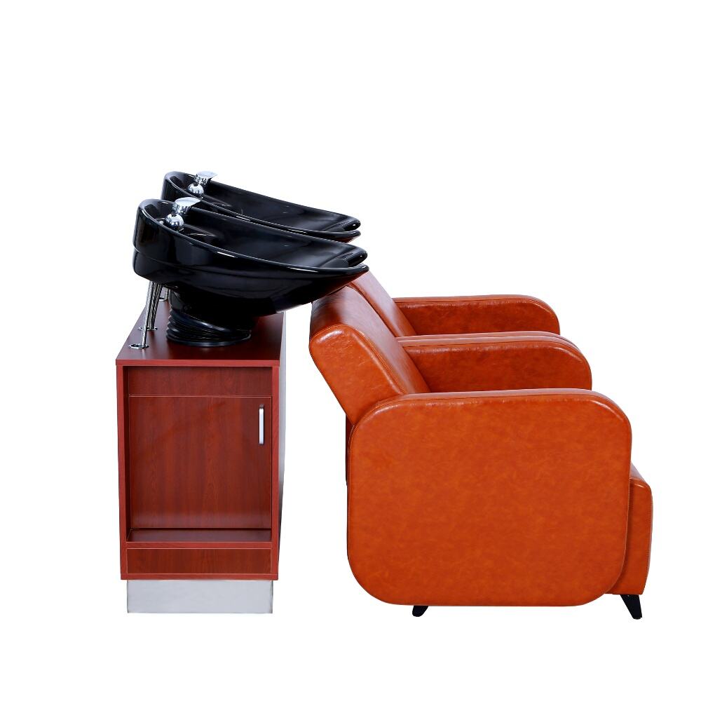 This dual shampoo chair setup, a perfect blend of style, comfort, and efficiency for busy salons.Featuring two chairs upholstered in rich, orange leather with a sleek, modern design, it offers clients a cozy and inviting space to relax. The glossy black shampoo bowls, paired with polished fixtures, ensure a seamless and hygienic hair-washing experience. The accompanying wooden storage unit adds functionality, providing space for salon essentials while complementing the overall aesthetic.Designed to maximize salon capacity without compromising on comfort, this dual setup is ideal for salons that prioritize both client satisfaction and operational efficiency. The bold color palette and contemporary lines make it a visually striking addition, enhancing the salon’s ambiance while delivering a top-notch hair-washing service.
