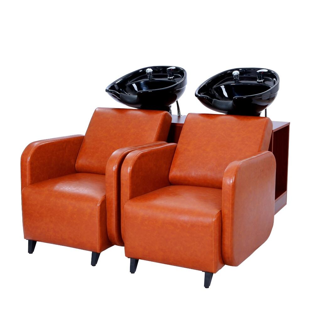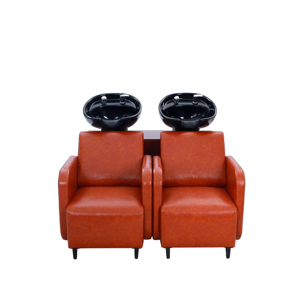 This dual shampoo chair setup, a perfect blend of style, comfort, and efficiency for busy salons.Featuring two chairs upholstered in rich, orange leather with a sleek, modern design, it offers clients a cozy and inviting space to relax.