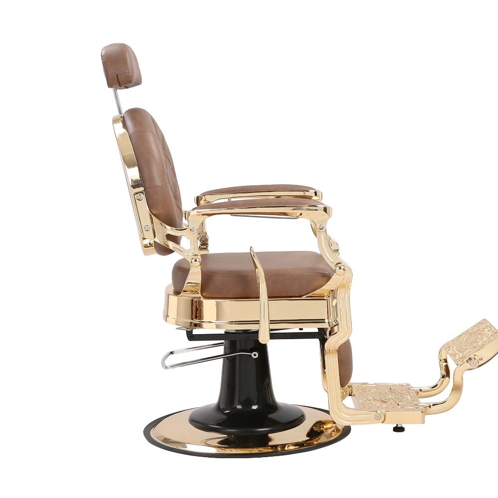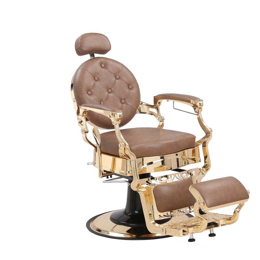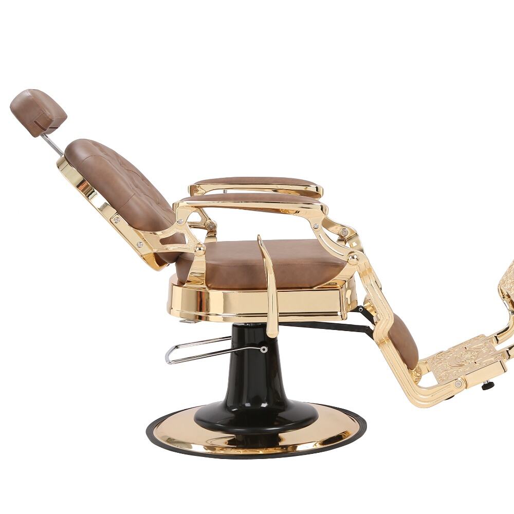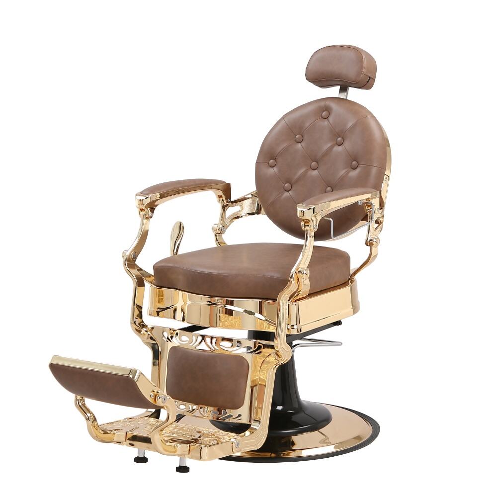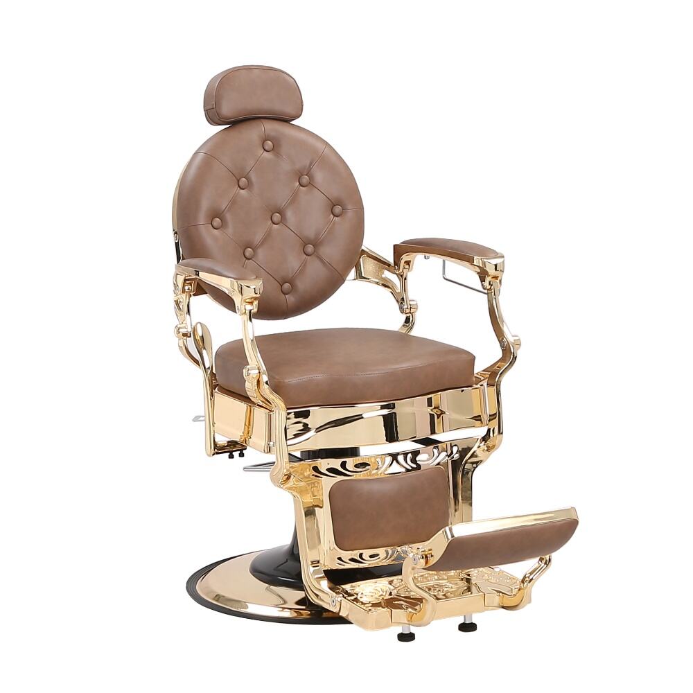 This barber chair is a perfect blend of luxury and functionality.Crafted with a shiny gold - toned metal frame, it exudes an air of opulence. The seat and backrest are upholstered in premium brown leather, featuring a tufted design that not only looks stylish but also offers exceptional comfort.Equipped with adjustable parts like the headrest and footrest, it can accommodate various clients' needs, ensuring a comfortable experience during haircuts. Whether in a high - end barbershop or a stylish salon, this chair is sure to elevate the grooming experience and become a standout piece.