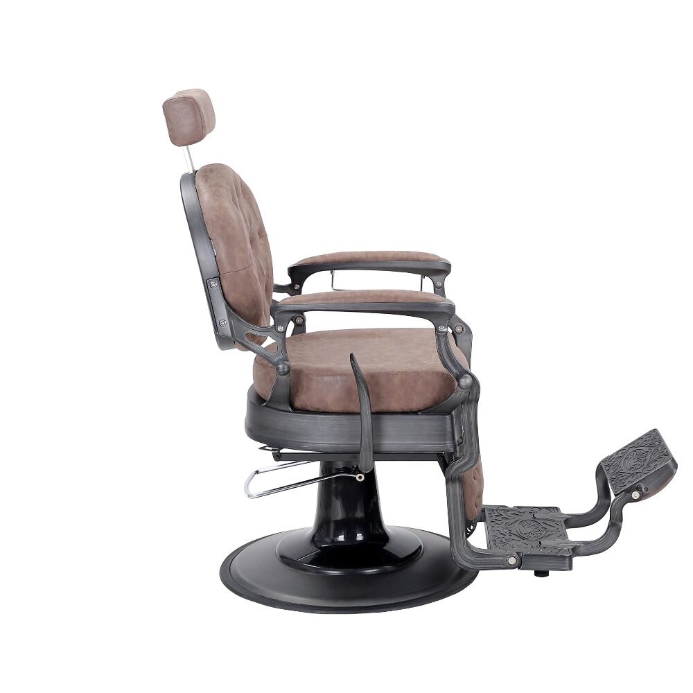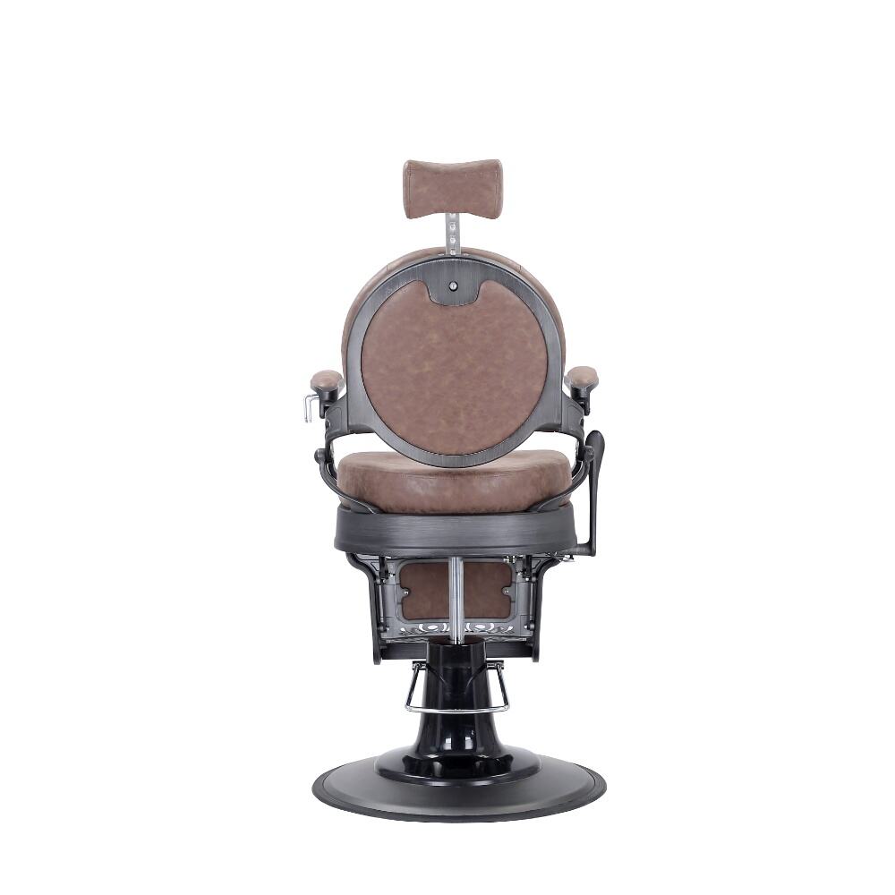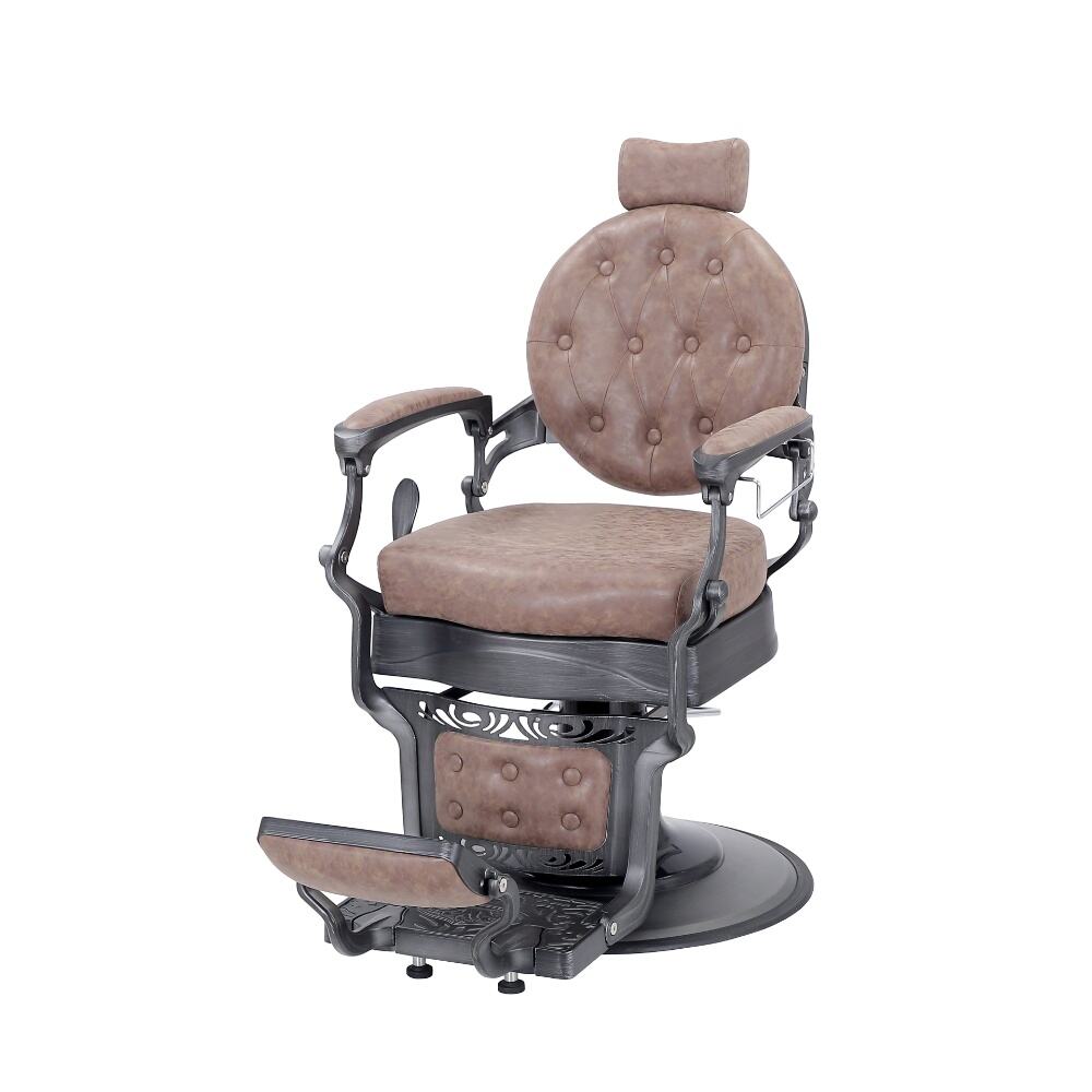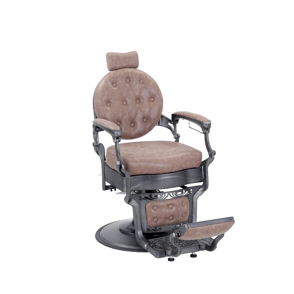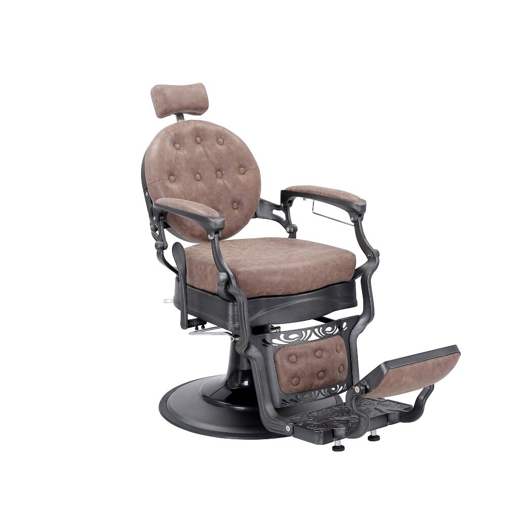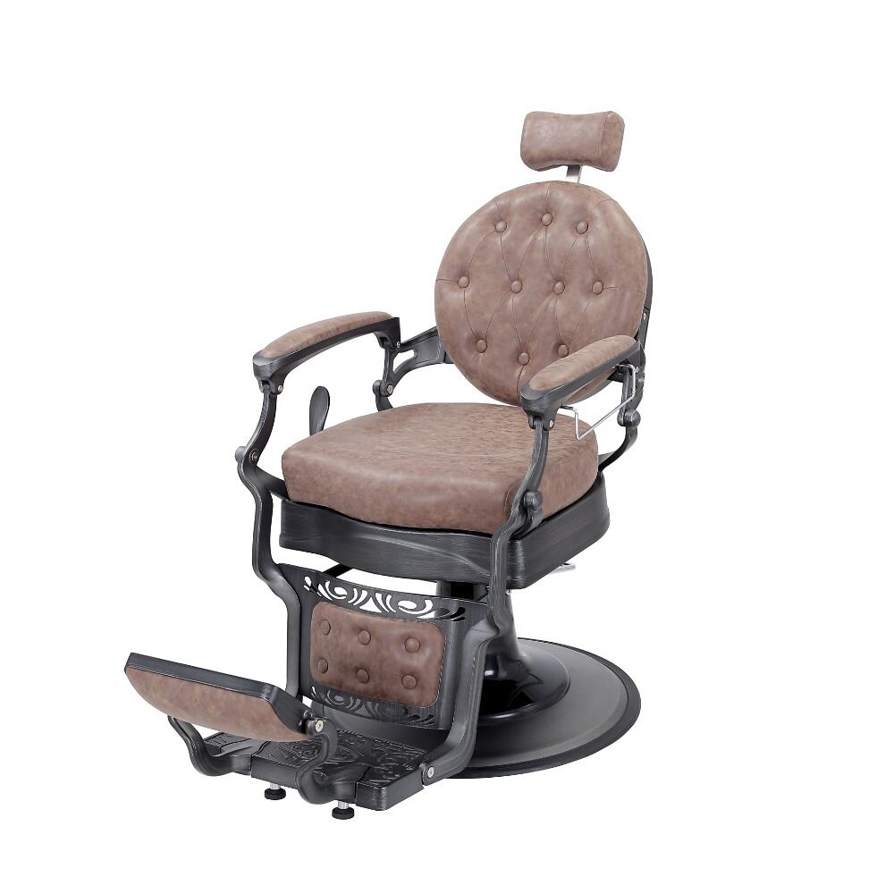 This barber chair is a magnificent blend of luxury and functionality.It showcases a gleaming gold - toned metal frame that exudes an air of grandeur. The seat and backrest are upholstered in exquisite dark green leather, with a tufted design that not only looks stylish but also ensures superior comfort.Equipped with adjustable parts such as the headrest and footrest, it can cater to the diverse needs of different clients, guaranteeing a comfortable experience during haircuts. Whether placed in a high - end barbershop or a chic salon, this chair is bound to elevate the grooming experience and stand out as a remarkable piece.