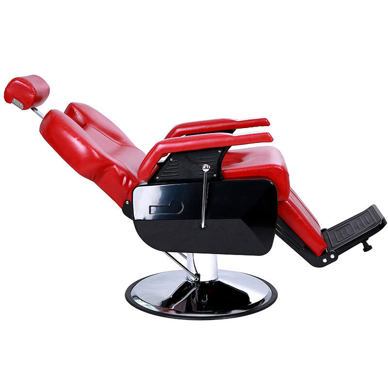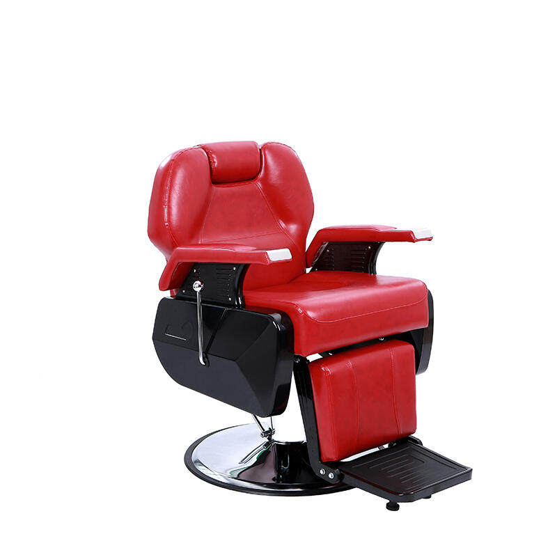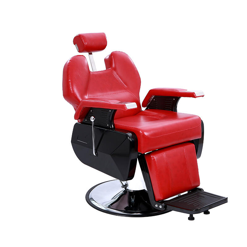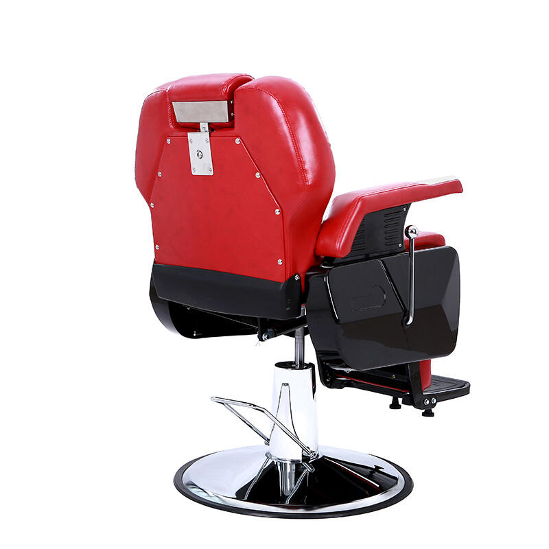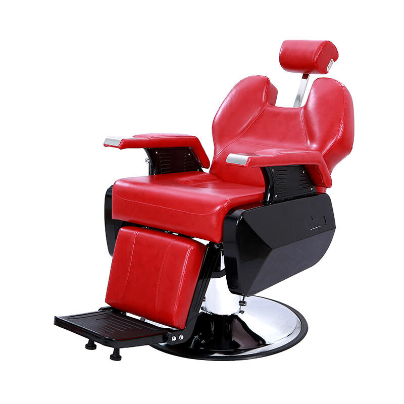 This barber chair, with bright red as the main color, with black parts and metal base, looks stylish and has a great visual impact. It is made of high-quality leather, soft and comfortable to the touch, which can bring customers a pleasant sitting experience.In terms of functional design, adjustable headrests, backrests and other parts can flexibly adapt to the body shape and needs of different customers, so that customers can maintain a comfortable posture during the haircut. The rotating base at the bottom is convenient for hairdressers to serve customers from all angles, and the foot pedal design is also very considerate, which further improves the convenience and comfort of use. It is an ideal choice for hair salons to improve service quality.