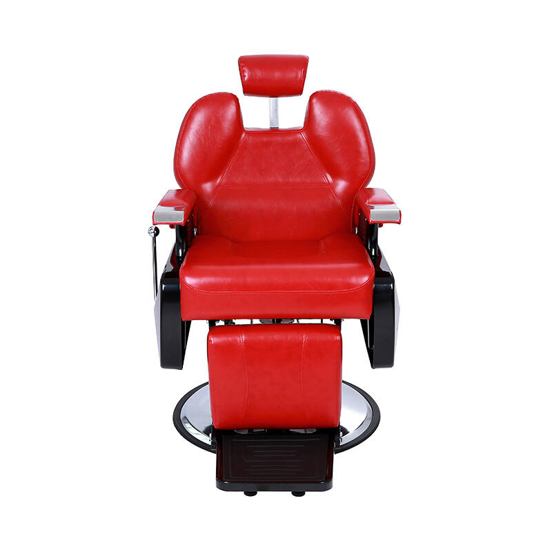 This barber chair, with bright red as the main color, with black parts and metal base, looks stylish and has a great visual impact. It is made of high-quality leather, soft and comfortable to the touch, which can bring customers a pleasant sitting experience.In terms of functional design, adjustable headrests, backrests and other parts can flexibly adapt to the body shape and needs of different customers, so that customers can maintain a comfortable posture during the haircut.
