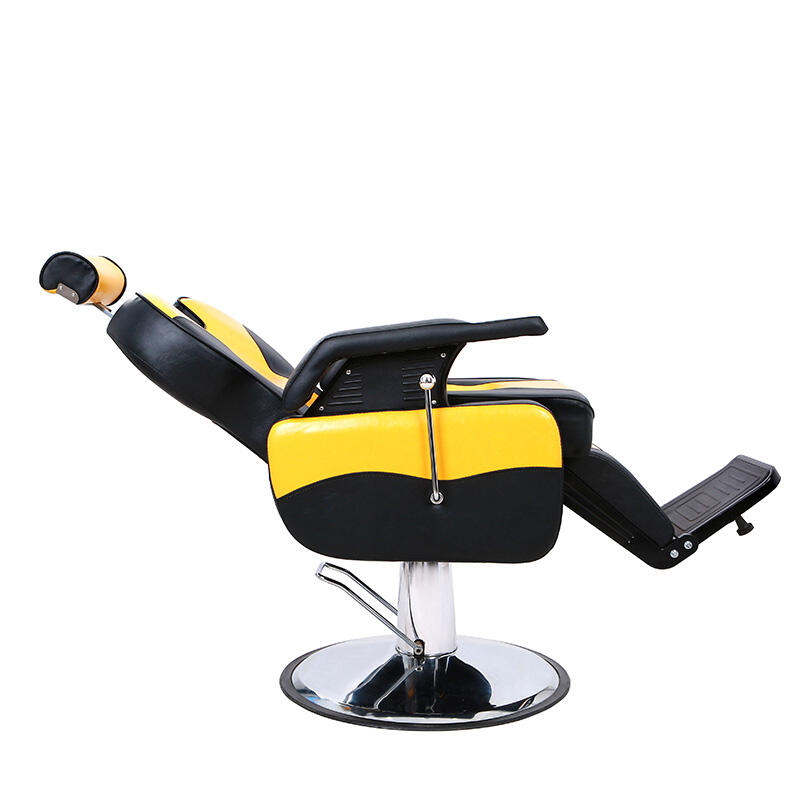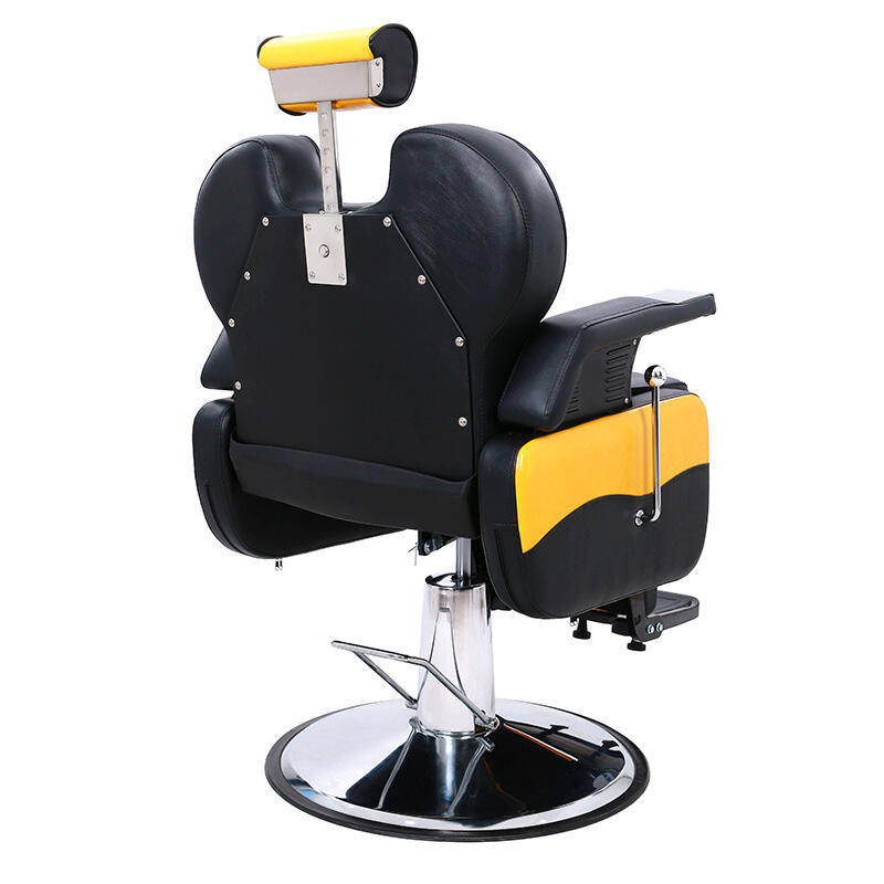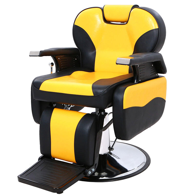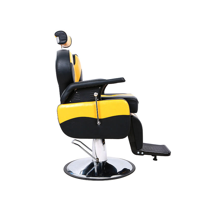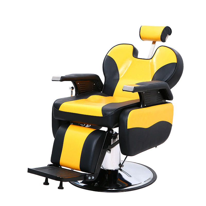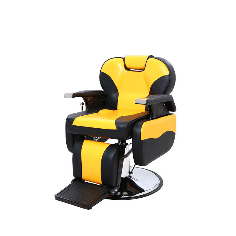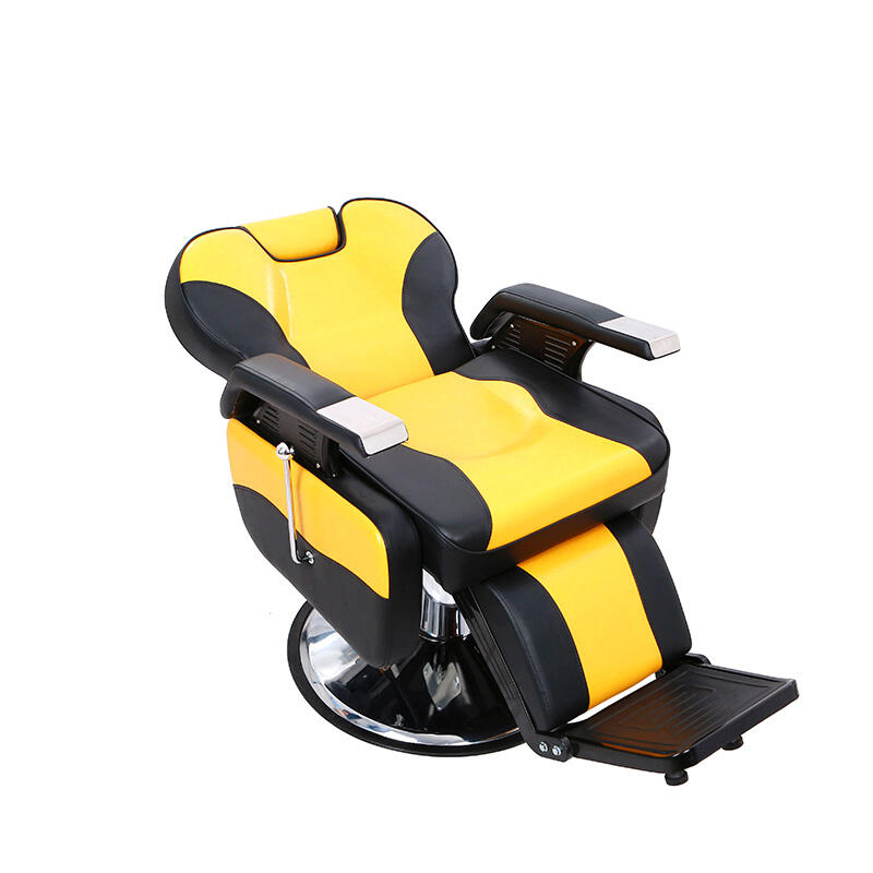 This barber chair creates an eye-catching visual effect with yellow and black contrasting colors, adding fashion vitality to the hairdressing scene. The seat is made of comfortable leather, which fits the curve of the human body, so that customers can have a comfortable experience during the haircut. The equipped adjustment device can flexibly change the height and angle of the seat, which is convenient for hairdressers to operate. The stable metal base ensures the stability of use, which is the ideal choice for hair salons to improve the service texture and space style.