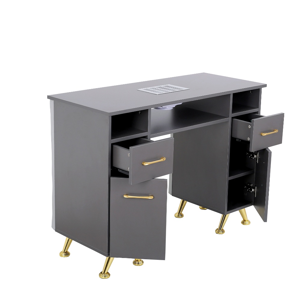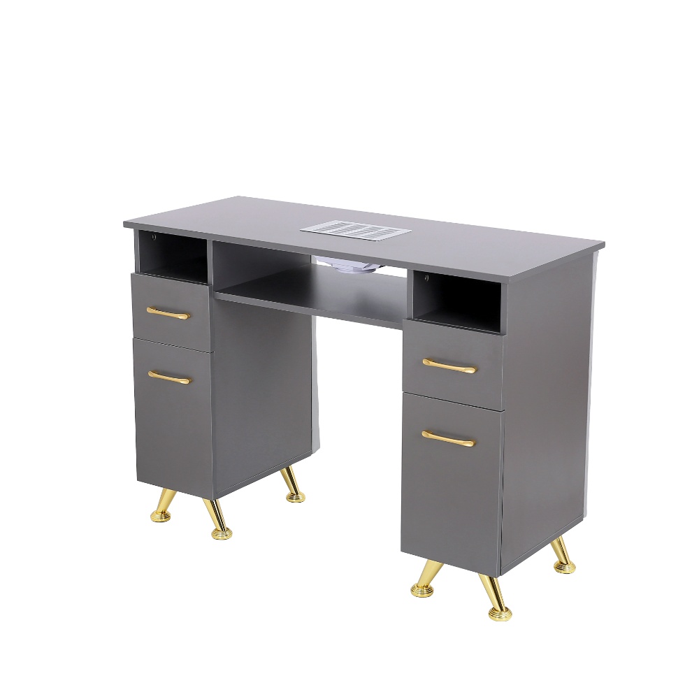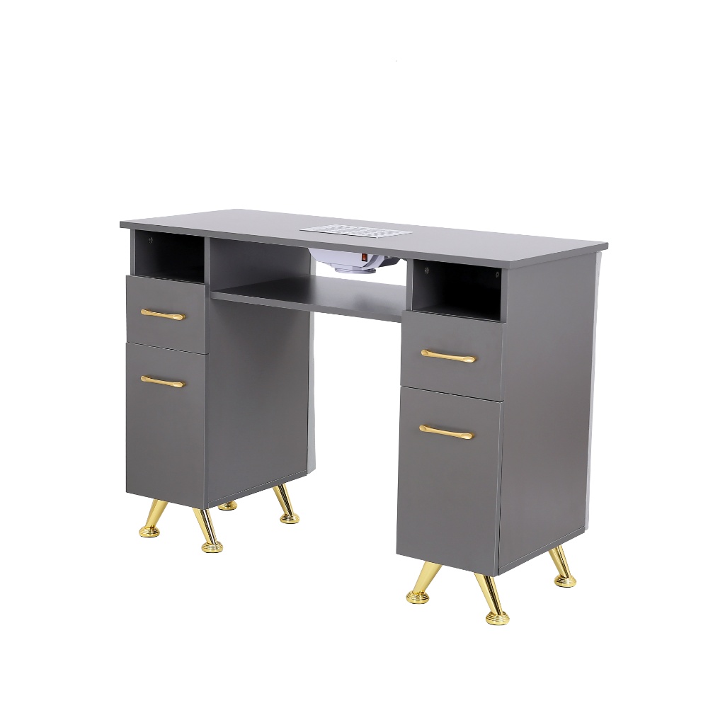 Αυτό το στιλάτο και λειτουργικό θρανίο για νύχια αποτελεί την ιδανική προσθήκη σε οποιοδήποτε κέντρο νυχιών ή προσωπικό χώρο φροντίδας νυχιών. Δημιουργημένο με μια κομψή γκρίζα επίστρωση και διακοσμημένο με ελκύστηκες χρυσές λαβές και πόδια, εκπέμπει μια σύγχρονη και πολυτελή αίσθηση. Το θρανίο διαθέτει ευρύχωρη αποθήκευση με πολλά συρτάρια και στις δύο πλευρές, προσφέροντας πλέονα χώρο για βερνίκια, εργαλεία και αξεσουάρ νυχιών, διατηρώντας τον χώρο εργασίας σας οργανωμένο και χωρίς αταξία. Στο κέντρο υπάρχει ένα άνετο υποστήριγμα καρπών και ενσωματωμένος συλλέκτης σκόνης νυχιών, εξασφαλίζοντας καθαρή και άνετη εμπειρία κατά τη διάρκεια των περιποιήσεων νυχιών. Η ανοιχτή ράφι και οι υποδιαιρέσεις προσφέρουν επιπλέον χώρο για εύκολη πρόσβαση σε αντικείμενα που χρησιμοποιούνται συχνά. Σχεδιασμένο για αισθητική και πρακτικότητα, αυτό το θρανίο νυχιών συνδυάζει ανθεκτικότητα με κομψή εμφάνιση, αποτελώντας την ιδανική επιλογή για επαγγελματίες και λάτρεις της φροντίδας νυχιών που αναζητούν αποτελεσματικότητα και στυλ.