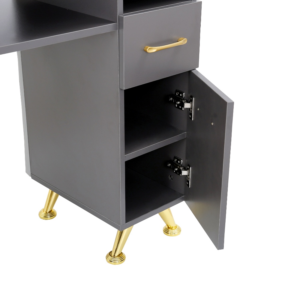 Αυτός ο στιλάτος και λειτουργικός πάγκος για νύχια, ιδανική προσθήκη σε οποιοδήποτε κομμωτήριο νυχιών ή προσωπικό χώρο φροντίδας νυχιών. Κατασκευασμένος με λεία γκρίζα επίστρωση και διακοσμημένος με ελεγαντικές χρυσές λαβές και πόδια, εκπέμπει μια σύγχρονη και πολυτελή αίσθηση.