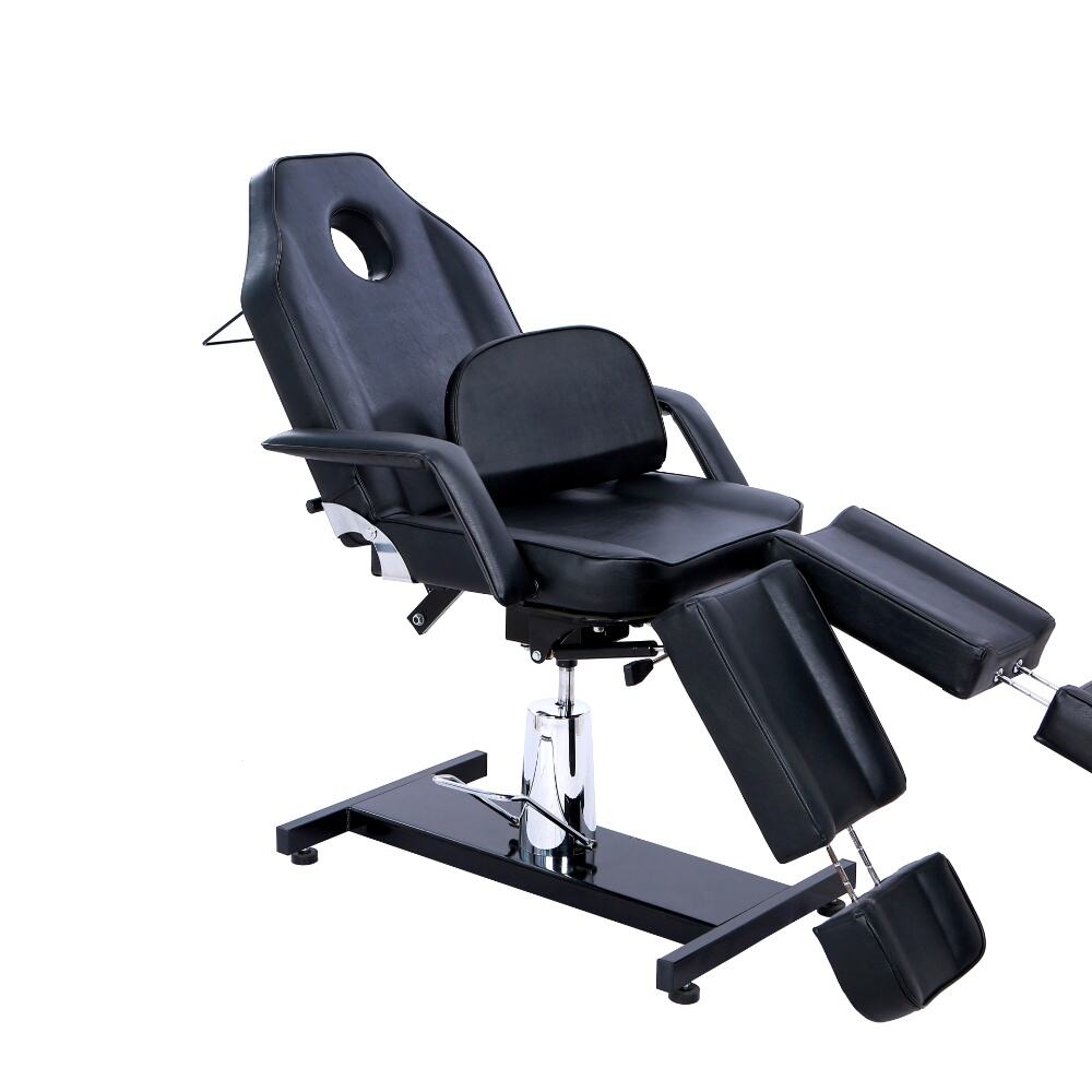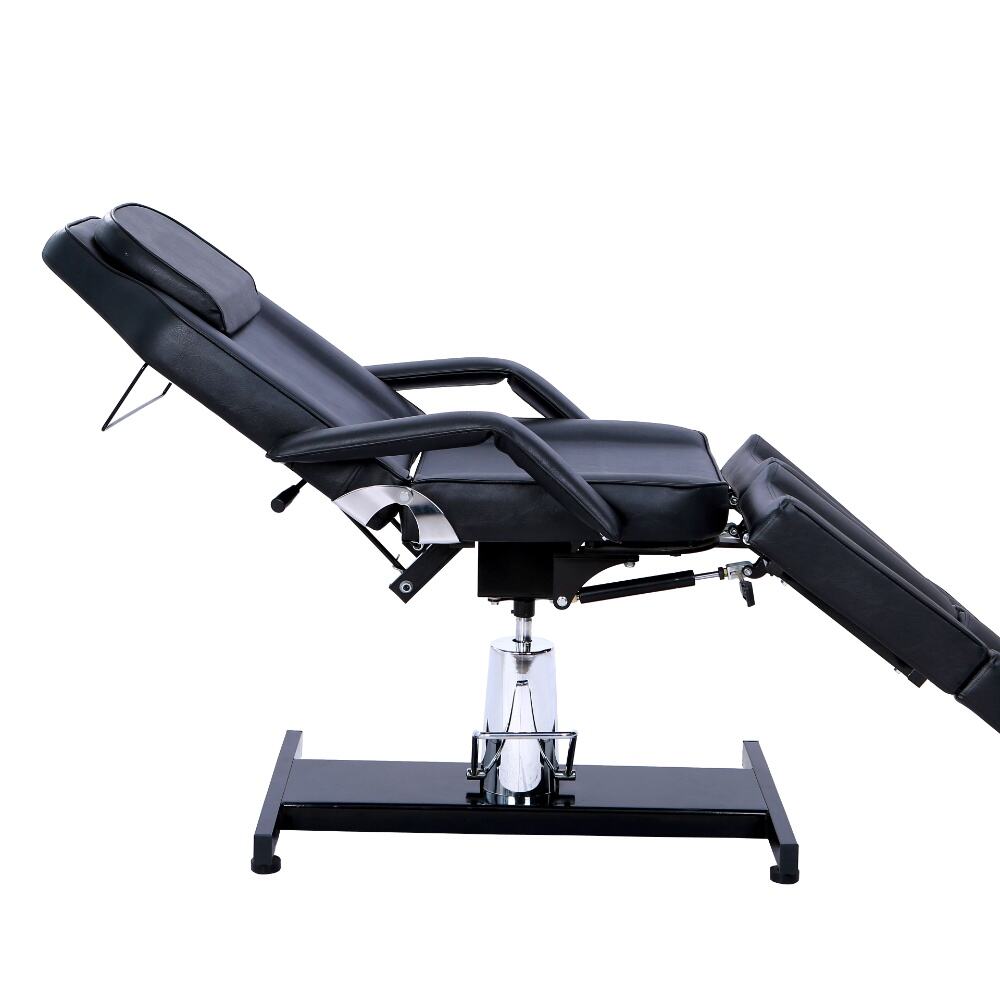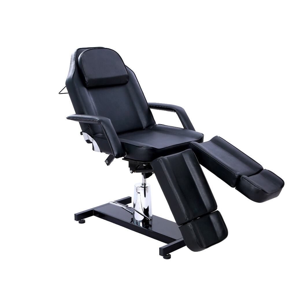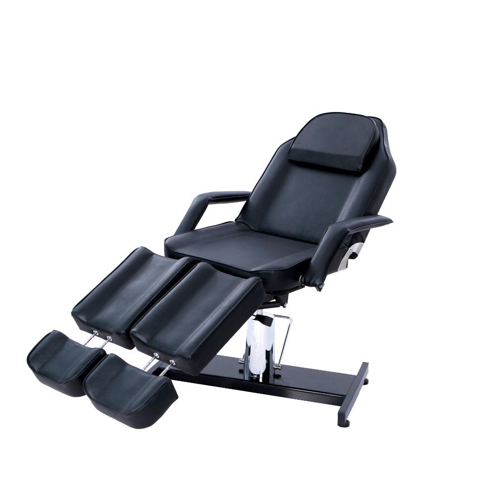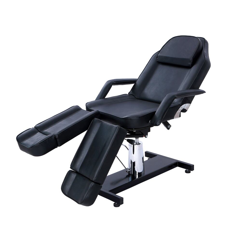 This exceptional massage chair-bed, a perfect fusion of comfort, versatility, and sleek design tailored to enhance every therapeutic experience.Upholstered in premium black leather, it offers a plush and supportive surface that ensures clients’ utmost comfort during massages, pedicures, or other wellness treatments. The chair features a multi-segment adjustable design—the backrest can be reclined to various angles, and the split footrest allows for precise positioning, accommodating different body types and treatment requirements with ease.Its robust construction includes a polished metal hydraulic system, enabling smooth and effortless height adjustments to suit therapists’ working preferences. The sleek black frame with chrome accents adds a touch of modern elegance, making it a stylish addition to any spa, salon, or massage studio.Whether you’re providing deep tissue massages, reflexology, or beauty services, this massage chair-bed delivers unparalleled functionality and comfort, ensuring both therapists and clients enjoy a superior experience. It’s an investment that combines practicality with aesthetic appeal, elevating the professionalism of your wellness establishment.