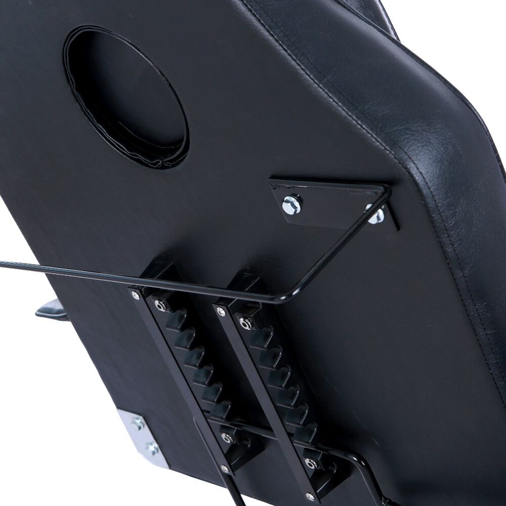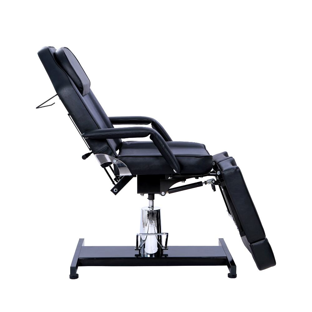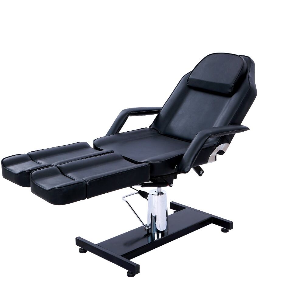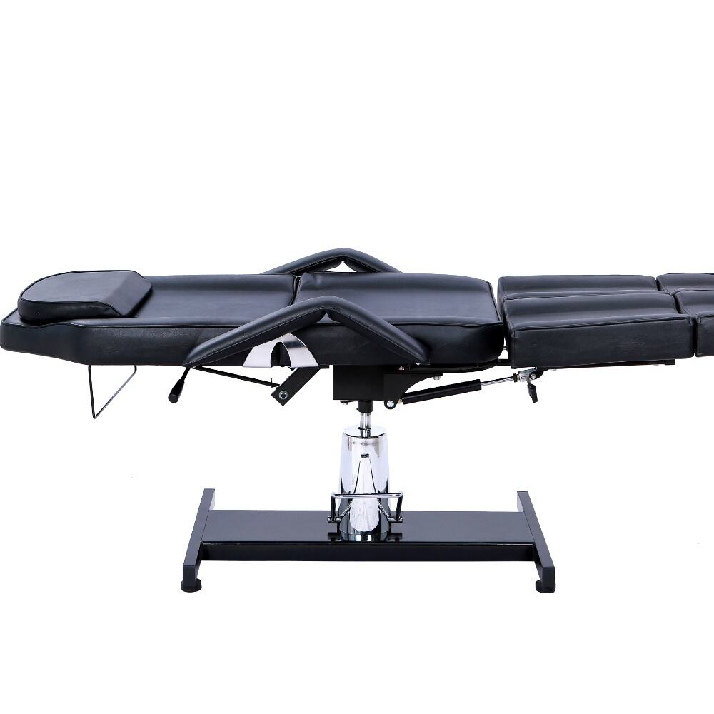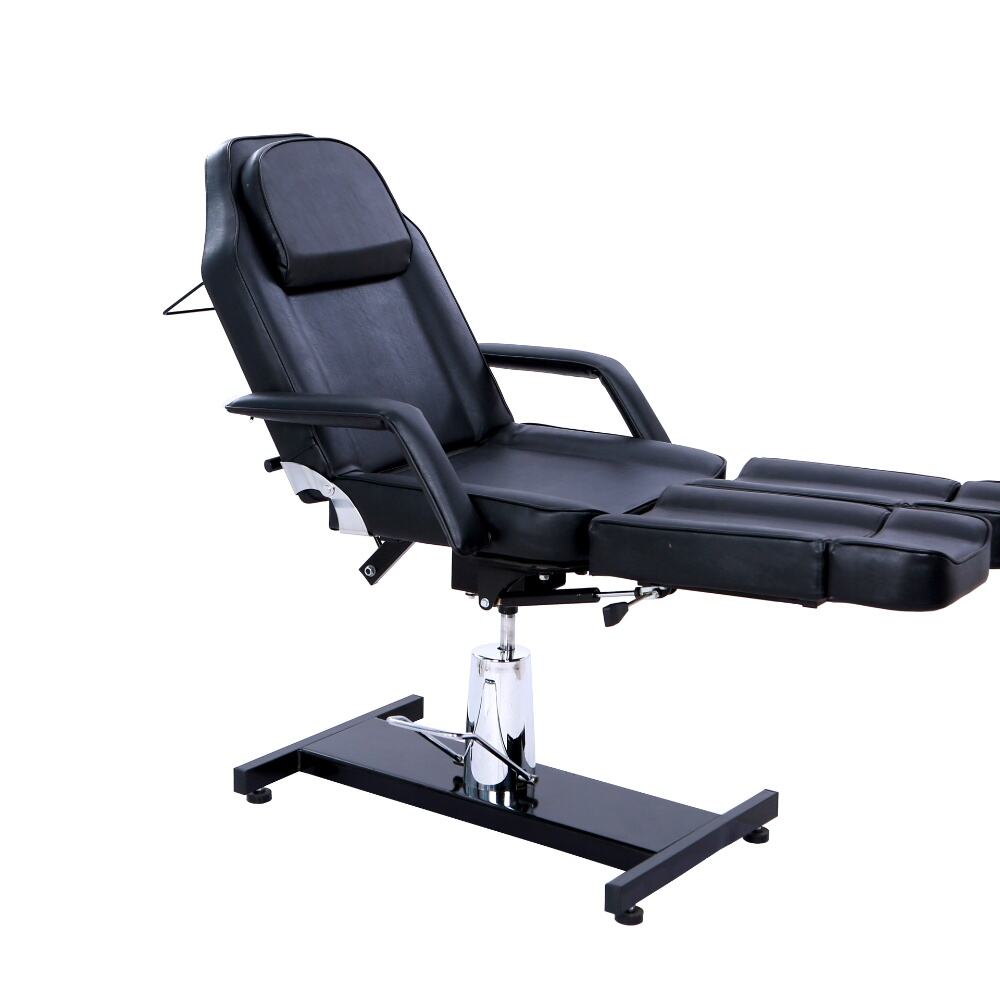 This exceptional massage chair-bed, a perfect fusion of comfort, versatility, and sleek design tailored to enhance every therapeutic experience.Upholstered in premium black leather, it offers a plush and supportive surface that ensures clients’ utmost comfort during massages, pedicures, or other wellness treatments. The chair features a multi-segment adjustable design—the backrest can be reclined to various angles, and the split footrest allows for precise positioning, accommodating different body types and treatment requirements with ease.Its robust construction includes a polished metal hydraulic system, enabling smooth and effortless height adjustments to suit therapists’ working preferences. The sleek black frame with chrome accents adds a touch of modern elegance, making it a stylish addition to any spa, salon, or massage studio.Whether you’re providing deep tissue massages, reflexology, or beauty services, this massage chair-bed delivers unparalleled functionality and comfort, ensuring both therapists and clients enjoy a superior experience. It’s an investment that combines practicality with aesthetic appeal, elevating the professionalism of your wellness establishment.