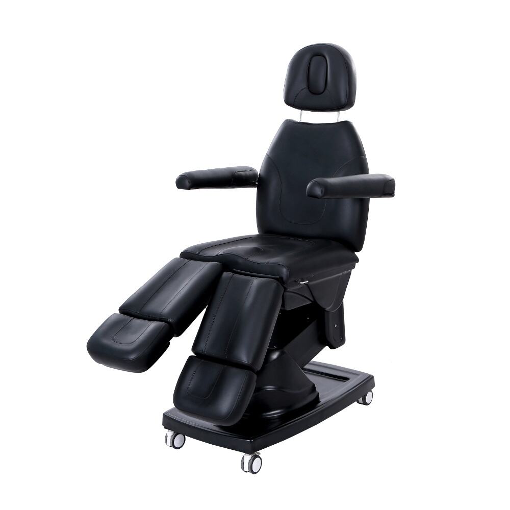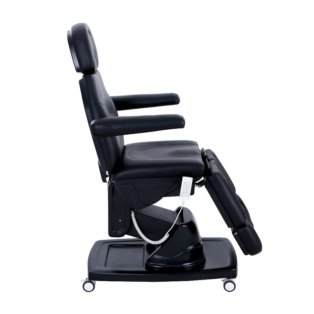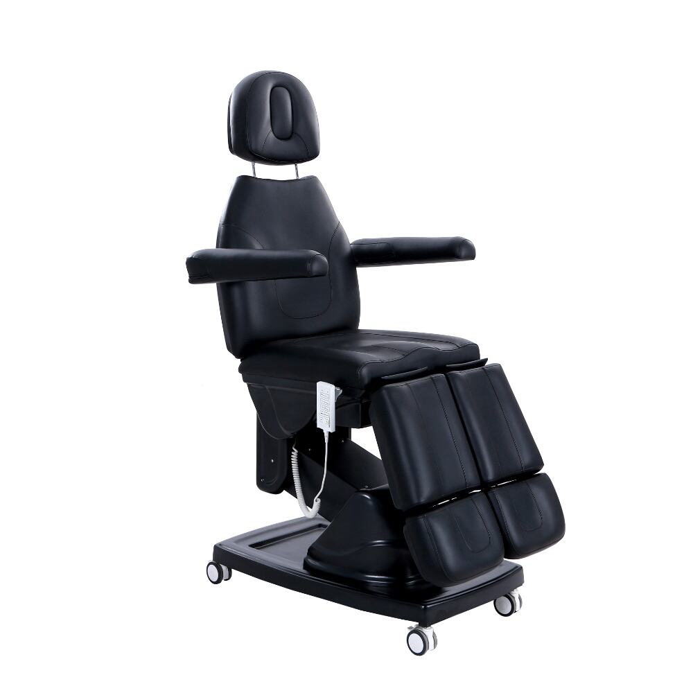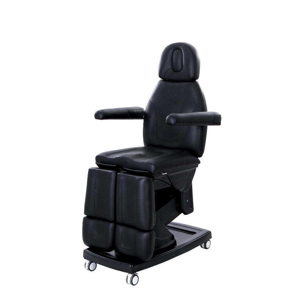 This state-of-the-art massage chair-bed, a pinnacle of innovation, comfort, and versatility designed to transform any wellness or beauty setting.Upholstered in premium black leather with ergonomic contouring, it provides exceptional support and comfort for clients during massages, aesthetic treatments, or relaxation sessions. The chair features a fully electric adjustable system—with intuitive controls, the headrest, backrest, and segmented footrest can be precisely positioned to countless angles, ensuring a customized experience that caters to individual needs and various therapeutic modalities.Equipped with smooth-rolling wheels, it offers effortless mobility, allowing for easy rearrangement within your spa, salon, or clinic. Its robust yet sleek black frame not only guarantees durability but also adds a touch of modern luxury to your space. The integrated electric mechanism enables seamless height and angle adjustments, empowering therapists to work with utmost efficiency while clients enjoy unparalleled relaxation.Whether you’re delivering advanced massage therapies, cosmetic procedures, or simply providing a tranquil retreat, this chair-bed sets a new standard for comfort and functionality. It’s an investment that blends cutting-edge technology with sophisticated design, elevating the client experience and enhancing the professionalism of your wellness establishment.
