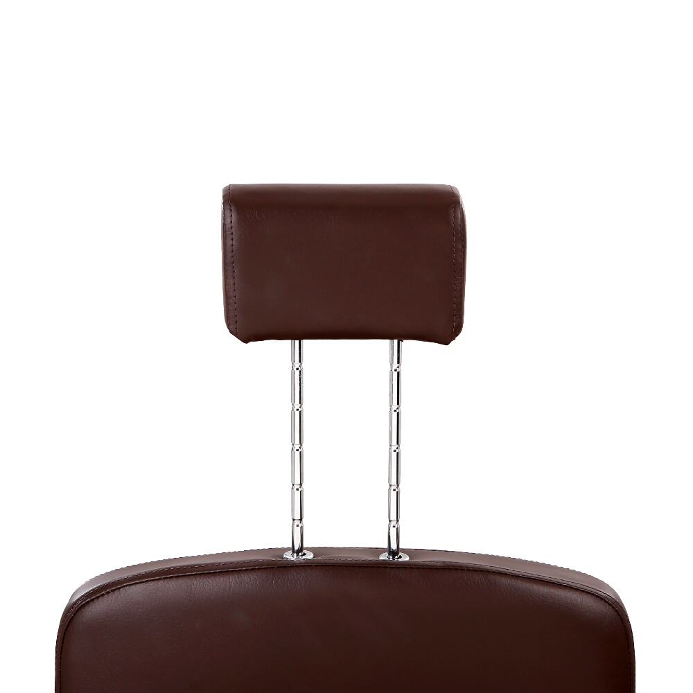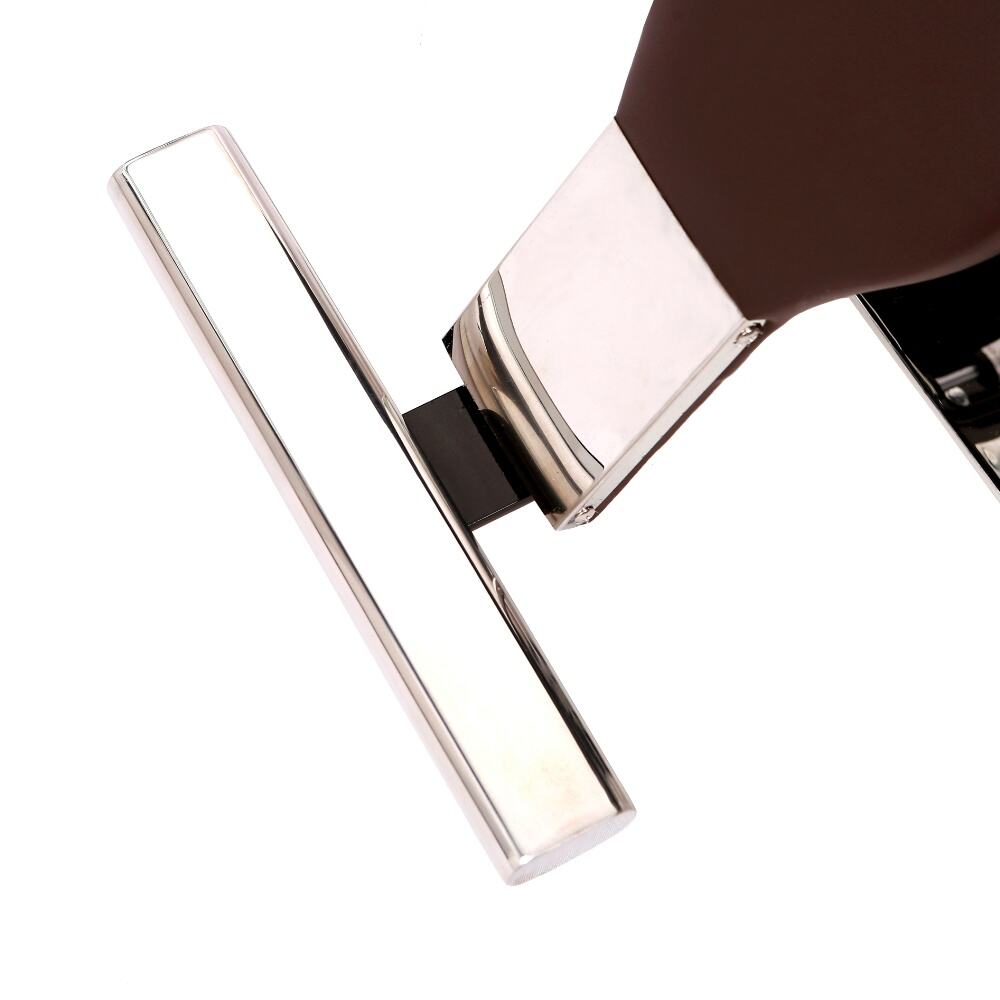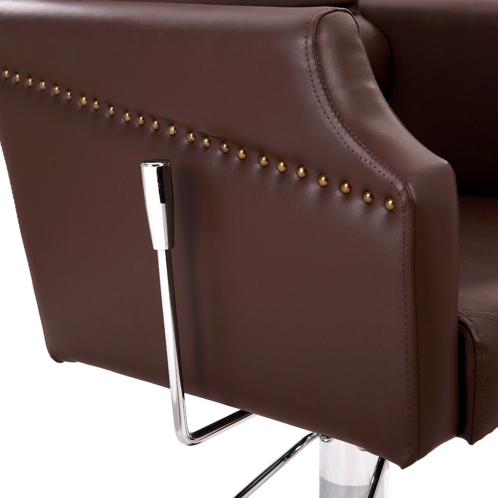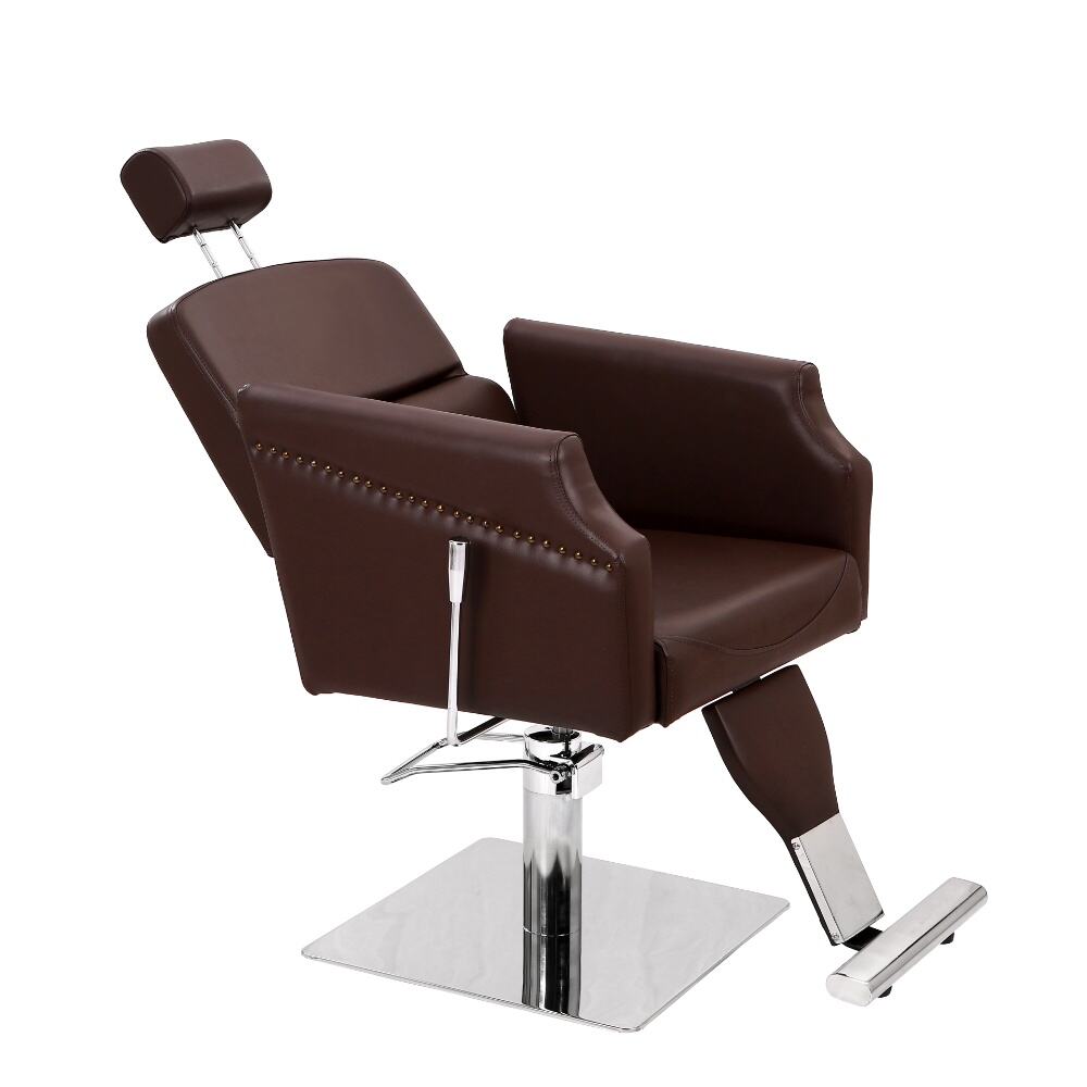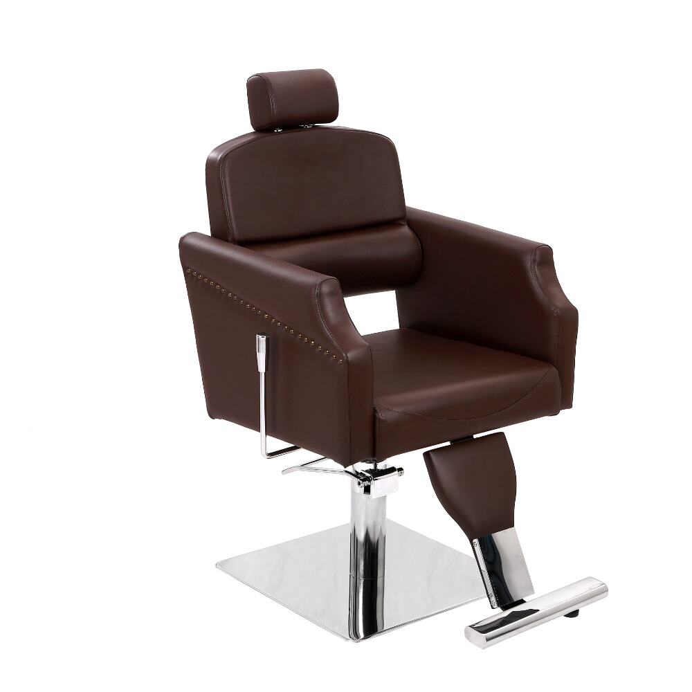 The barber chair, a perfect blend of elegance, comfort, and functionality designed for modern barbershops and salons.Upholstered in high-quality brown leather, it boasts a luxurious look and feel, while the meticulous stitching and decorative rivets on the armrests add a touch of classic sophistication. The adjustable headrest ensures optimal support for clients during any grooming service.Equipped with a smooth hydraulic lifting system and a sturdy chrome-plated base, it allows for effortless height adjustment to suit barbers of all statures. The integrated footrest, also wrapped in matching leather, enhances client comfort, especially during longer sessions.Whether you’re aiming to elevate the ambiance of your space or provide an unparalleled experience for your clients, this barber chair is a standout choice that marries style and practicality seamlessly.