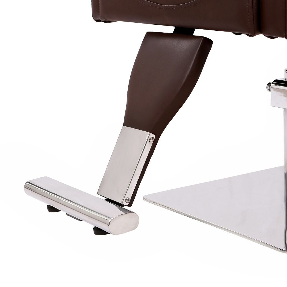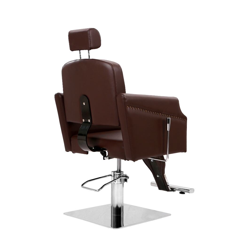 The barber chair, a perfect blend of elegance, comfort, and functionality designed for modern barbershops and salons.Upholstered in high-quality brown leather, it boasts a luxurious look and feel, while the meticulous stitching and decorative rivets on the armrests add a touch of classic sophistication.