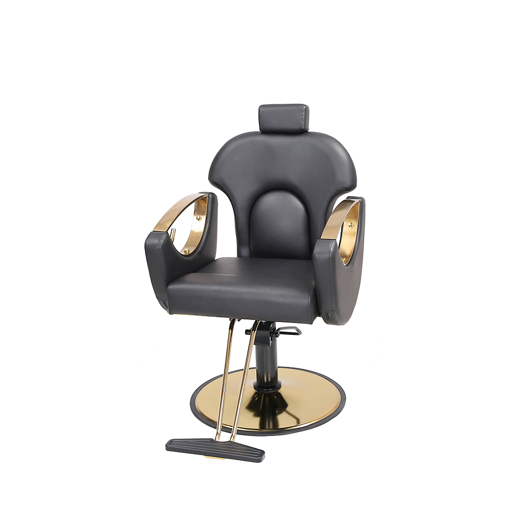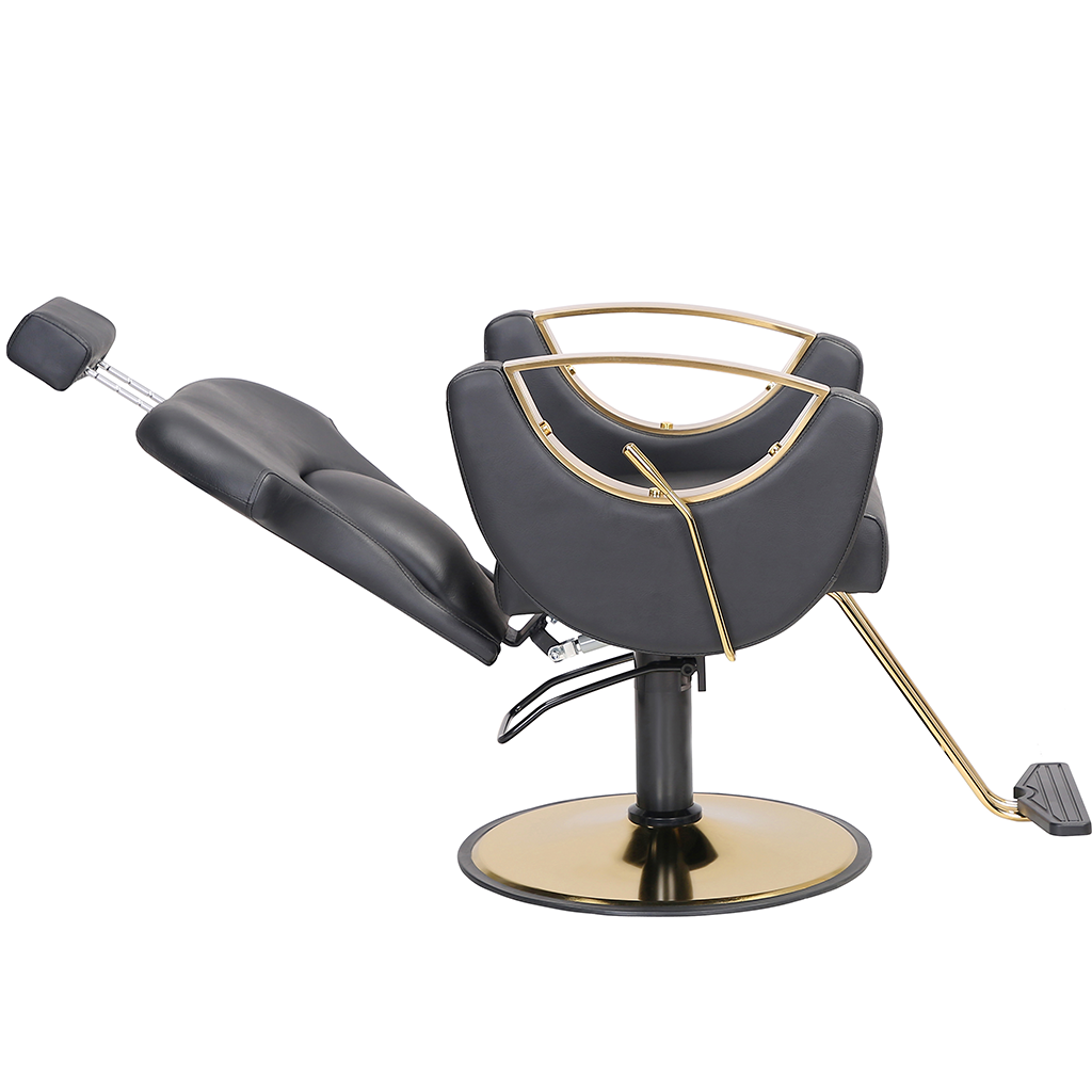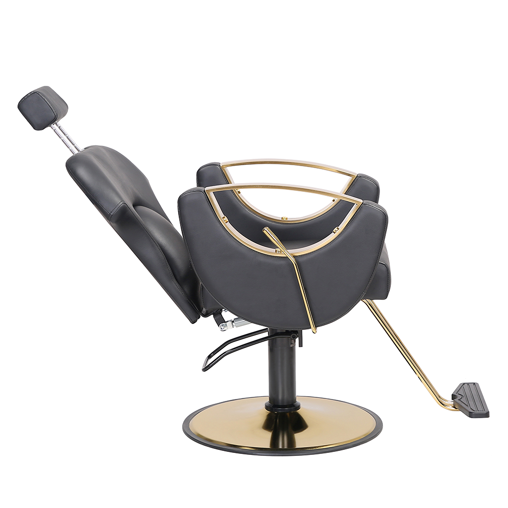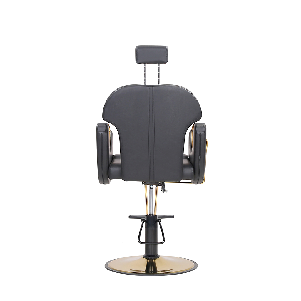 This barber chair, with classic black as the main color, is matched with exquisite gold trim, which is calm and gorgeous. The leather seat is soft and skin-friendly, fits the curve of the human body, and creates a comfortable experience for customers. Adjustable headrest, flexible lifting and lowering functions, adapting to a variety of hairdressing needs, and helping hairdressers to operate, it is a high-quality choice for hairdressing salons to improve their style and practicality.