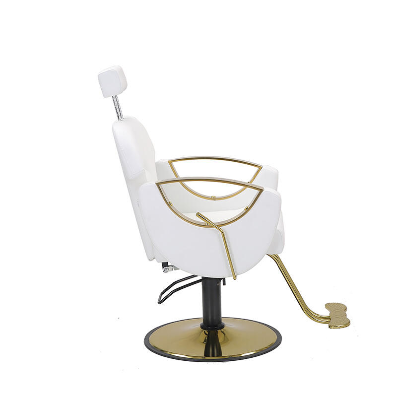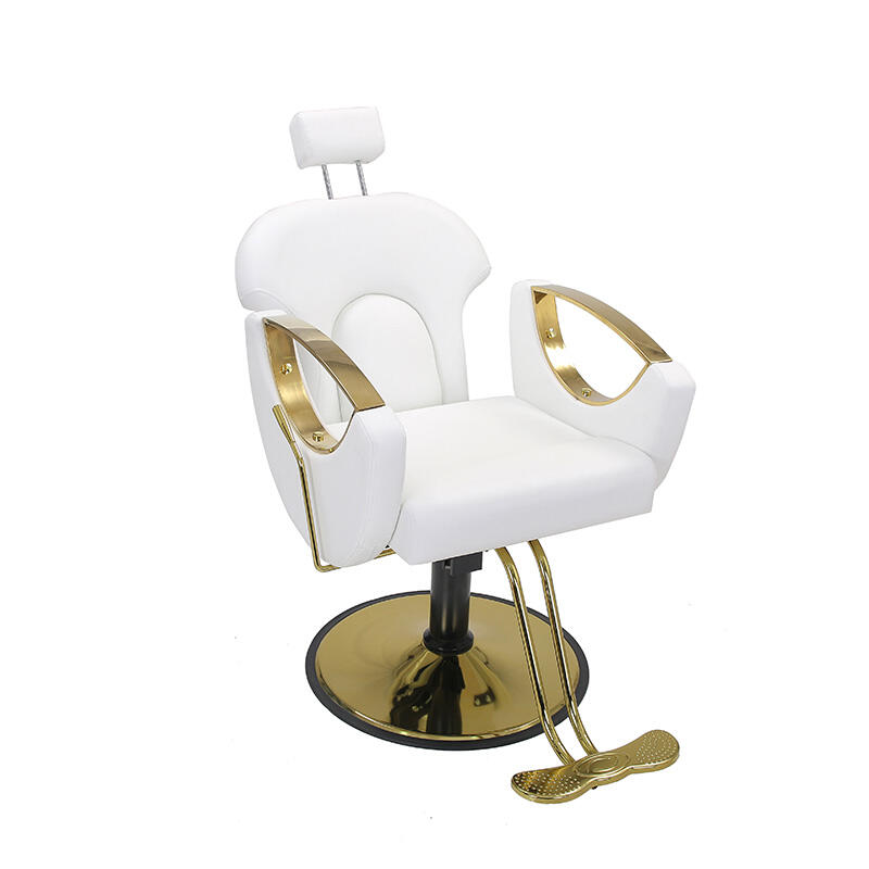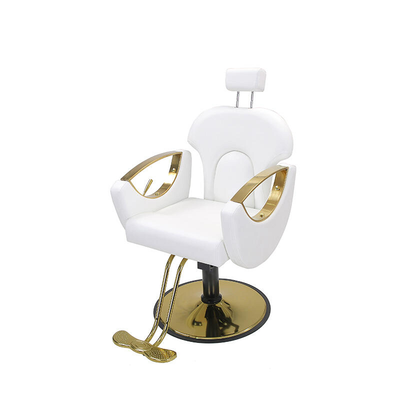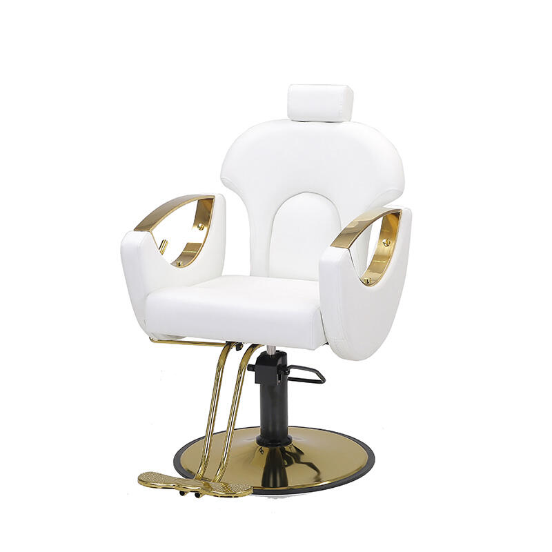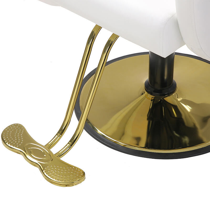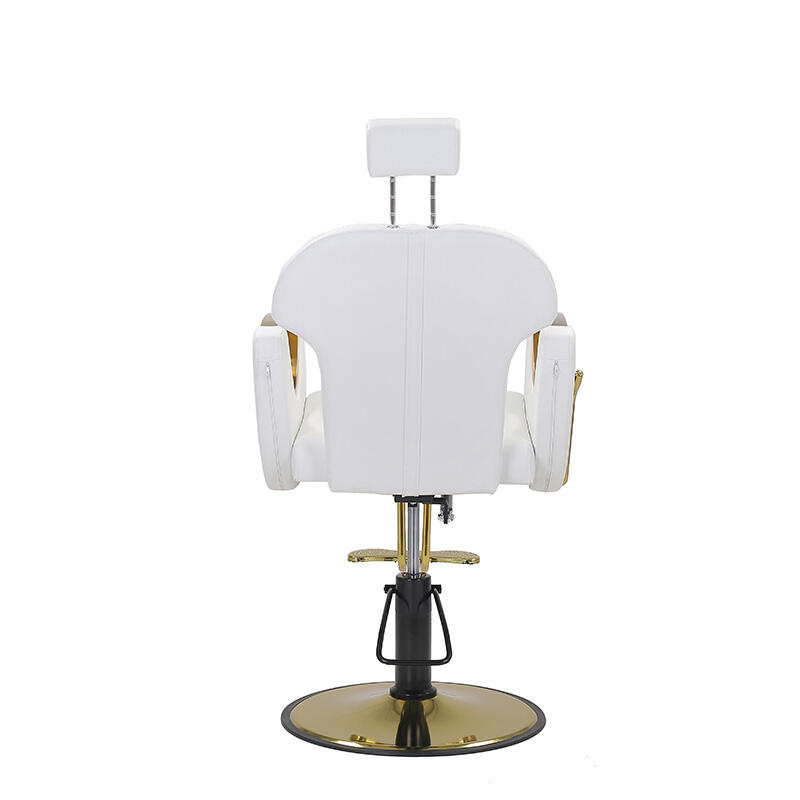 This barber chair is a perfect blend of elegance and functionality. Upholstered in smooth, pristine white faux leather, it boasts a sleek and ergonomic design that ensures maximum comfort for clients.The chair features exquisite gold - toned armrests and a matching gold circular base, adding a touch of luxury and sophistication. An adjustable headrest further enhances the personalized comfort experience.Equipped with a seamless hydraulic mechanism, adjusting the height is effortless, catering to the needs of both barbers and customers. Whether in a high - end salon or a modern barbershop, this chair elevates the grooming experience with its stylish appearance, superior comfort, and practical design.
