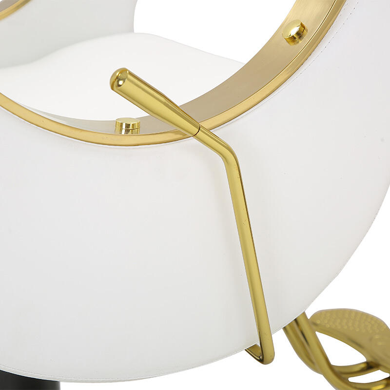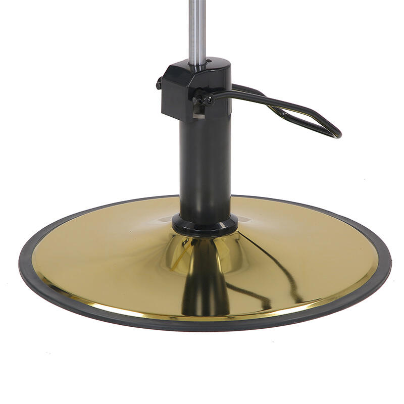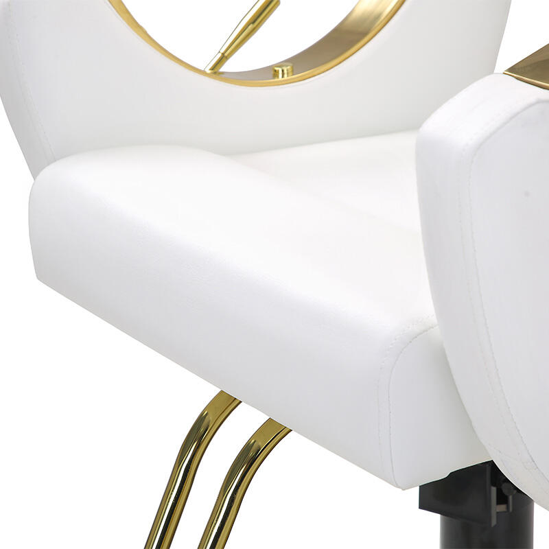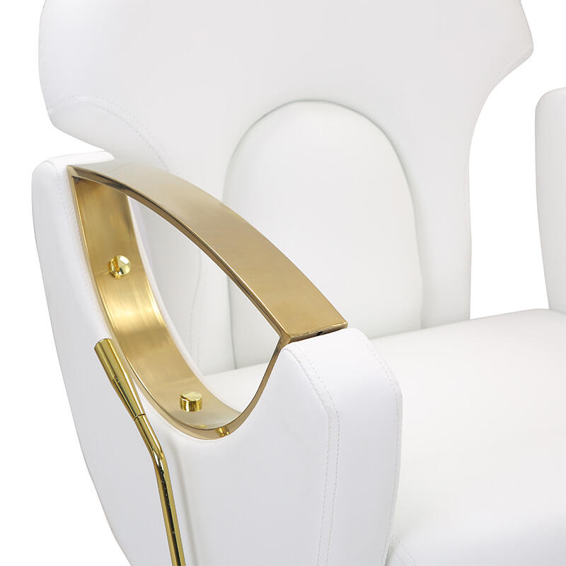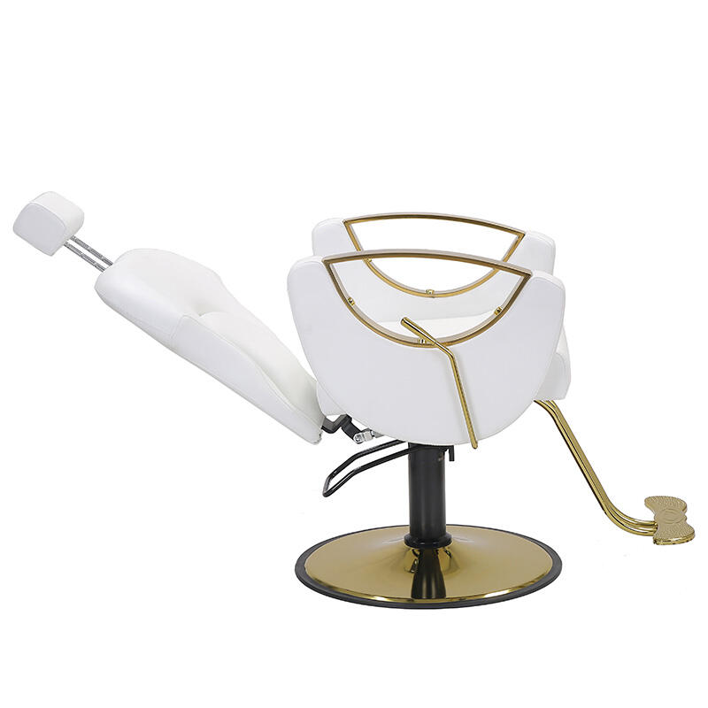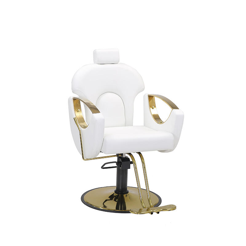 This barber chair is a perfect blend of elegance and functionality. Upholstered in smooth, pristine white faux leather, it boasts a sleek and ergonomic design that ensures maximum comfort for clients.The chair features exquisite gold - toned armrests and a matching gold circular base, adding a touch of luxury and sophistication. An adjustable headrest further enhances the personalized comfort experience.Equipped with a seamless hydraulic mechanism, adjusting the height is effortless, catering to the needs of both barbers and customers. Whether in a high - end salon or a modern barbershop, this chair elevates the grooming experience with its stylish appearance, superior comfort, and practical design.