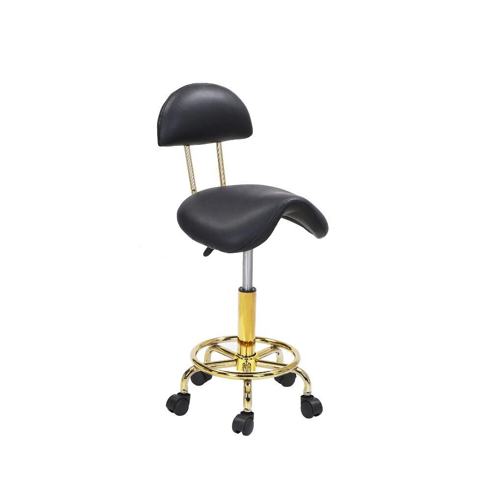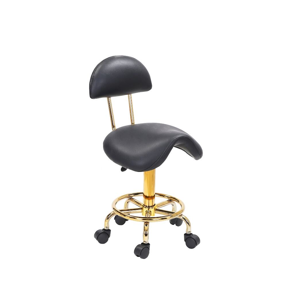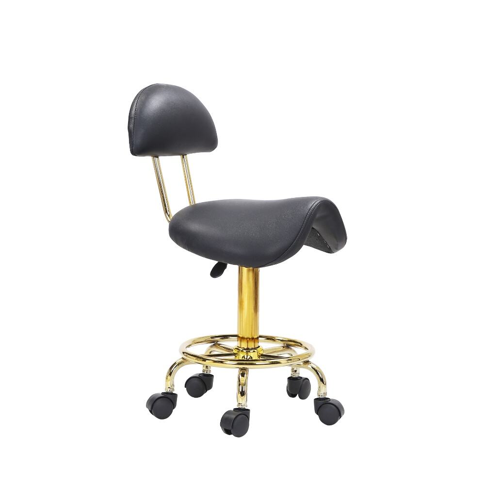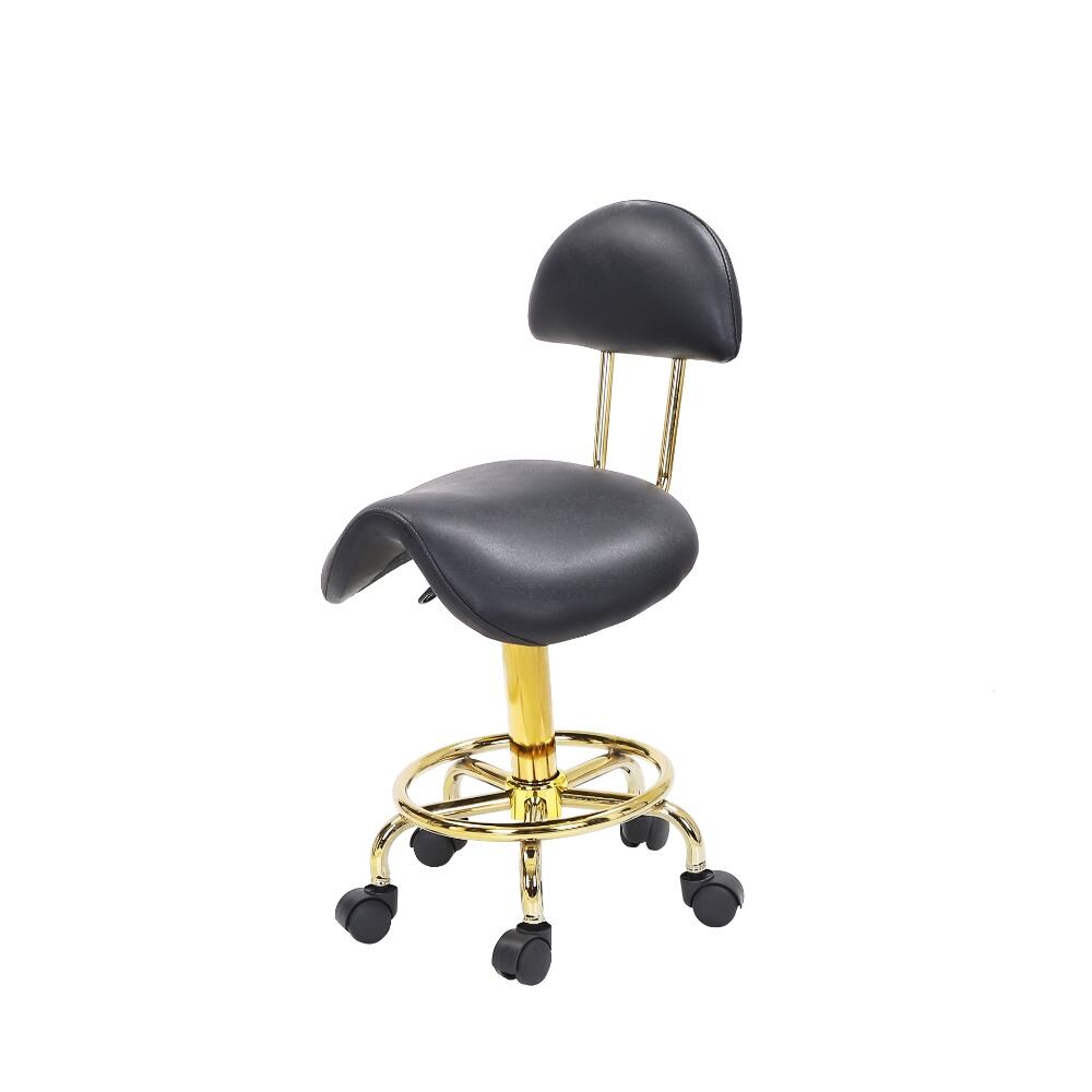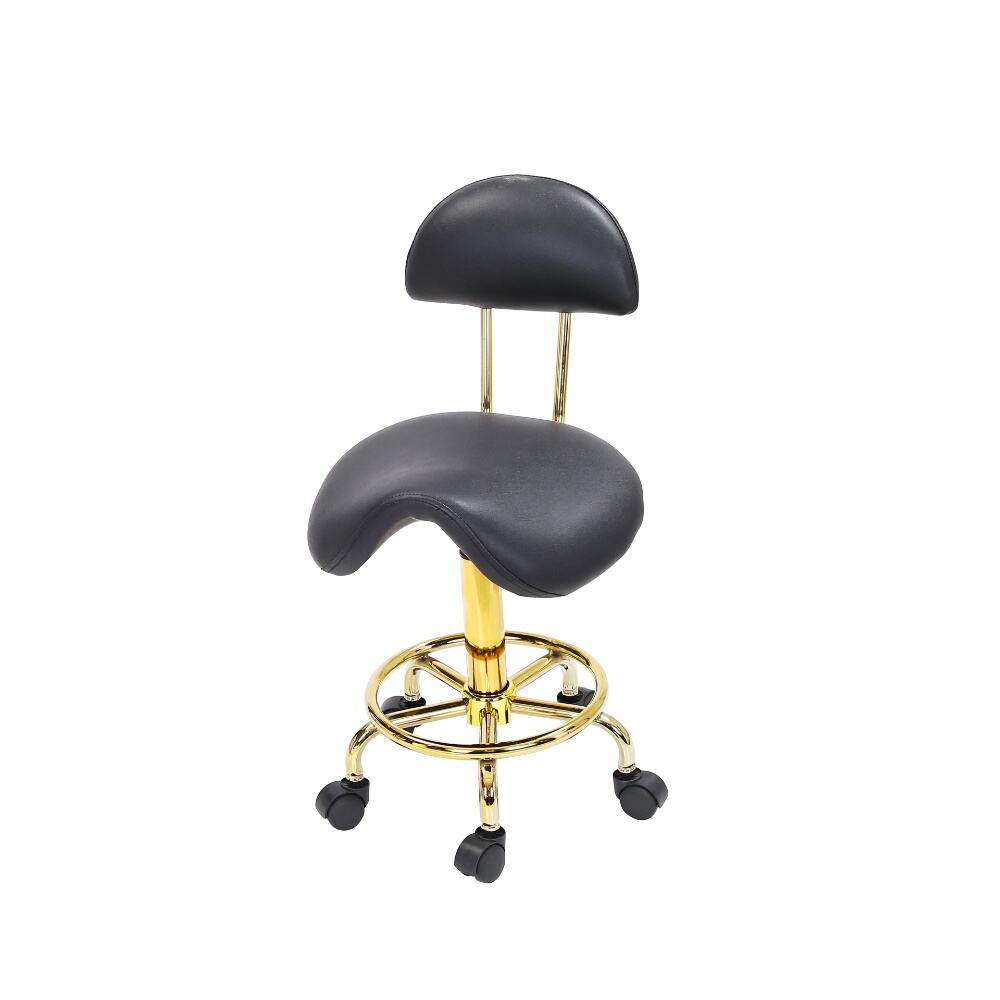 This exceptional salon chair, a perfect fusion of ergonomic design, luxury, and practicality tailored for salon professionals.Upholstered in premium black faux leather, it offers a plush and durable seating experience. The ergonomically shaped saddle seat and the curved backrest work in tandem to provide optimal lumbar and pelvic support, effectively reducing fatigue during long hours of styling, manicuring, or other beauty services.The chair features a glamorous gold-toned metal frame that adds a touch of opulence to any salon space. Its smooth height-adjustment mechanism, controlled by a side lever, allows for easy customization to match different workstations and personal preferences. The five-wheel caster base ensures smooth 360-degree mobility, enabling stylists to move around effortlessly while attending to clients.Whether in a hair salon, nail studio, or spa, this chair combines sleek aesthetics, superior comfort, and functional design, making it an ideal choice for professionals who value both style and performance in their workspace.