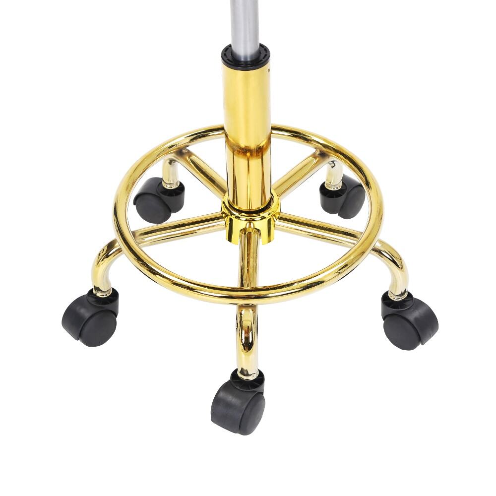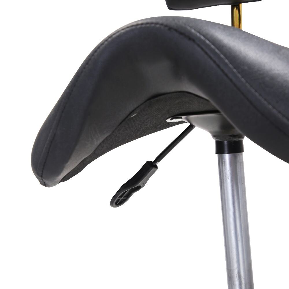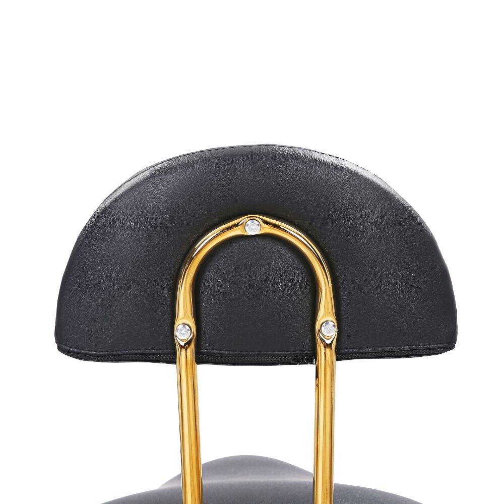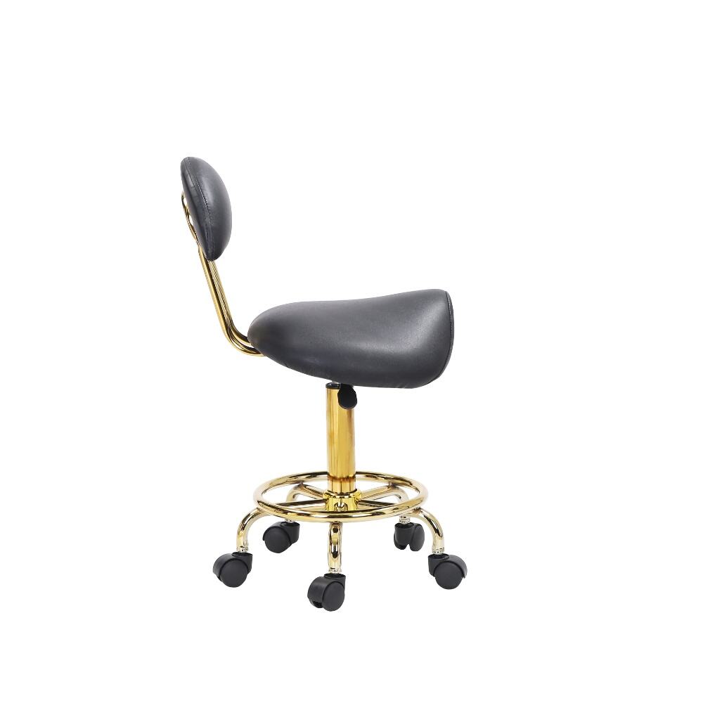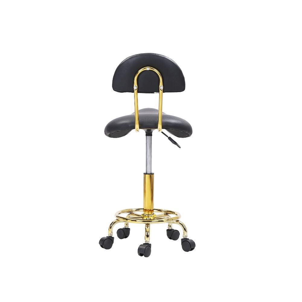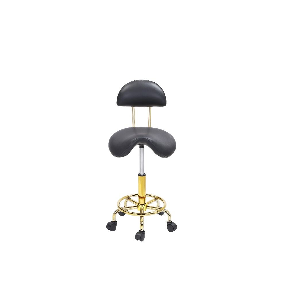 This exceptional salon chair, a perfect fusion of ergonomic design, luxury, and practicality tailored for salon professionals.Upholstered in premium black faux leather, it offers a plush and durable seating experience. The ergonomically shaped saddle seat and the curved backrest work in tandem to provide optimal lumbar and pelvic support, effectively reducing fatigue during long hours of styling, manicuring, or other beauty services.The chair features a glamorous gold-toned metal frame that adds a touch of opulence to any salon space. Its smooth height-adjustment mechanism, controlled by a side lever, allows for easy customization to match different workstations and personal preferences. The five-wheel caster base ensures smooth 360-degree mobility, enabling stylists to move around effortlessly while attending to clients.Whether in a hair salon, nail studio, or spa, this chair combines sleek aesthetics, superior comfort, and functional design, making it an ideal choice for professionals who value both style and performance in their workspace.