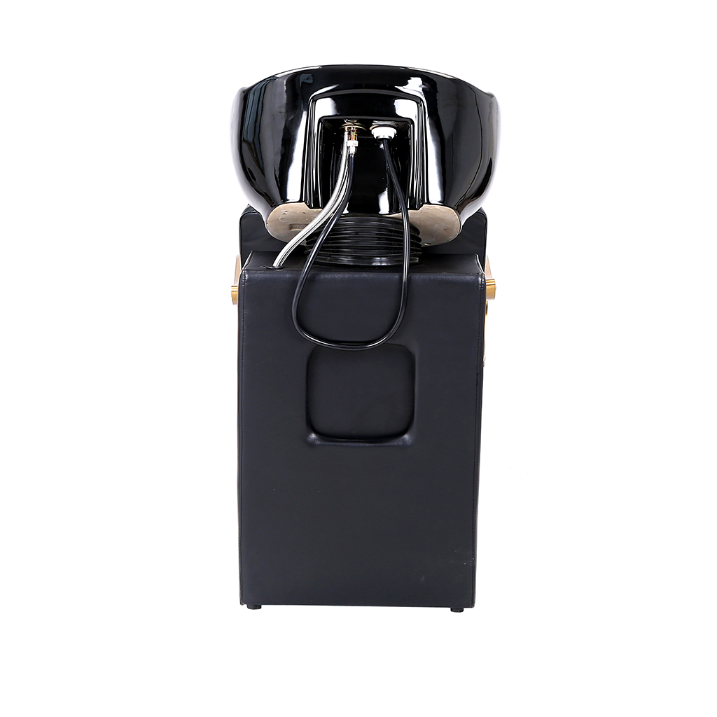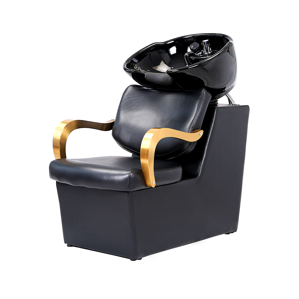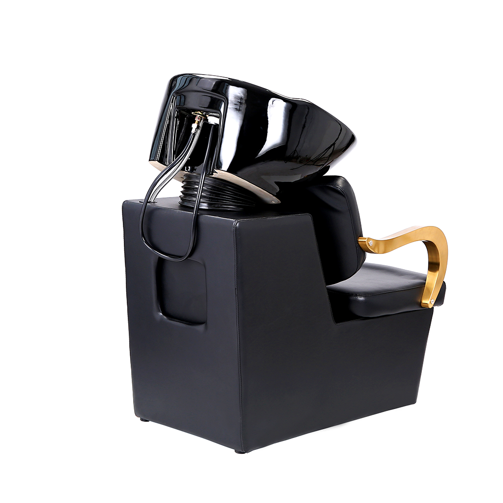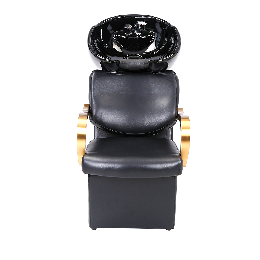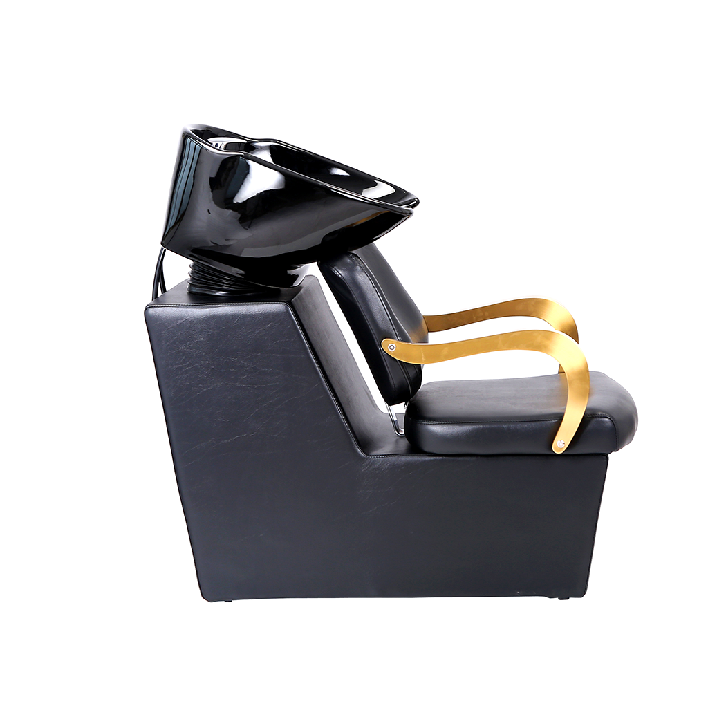 The overall design of this shampoo chair shows the high-end atmosphere. The main body is made of black leather, which is not only excellent in texture and easy to clean, but also brings customers a comfortable sitting feeling. The armrest part adopts bright gold, which contrasts sharply with the black body, enhancing the visual sense of exquisiteness and luxury. The black shampoo basin is ergonomic, so that customers can maintain a comfortable head posture during the washing process.