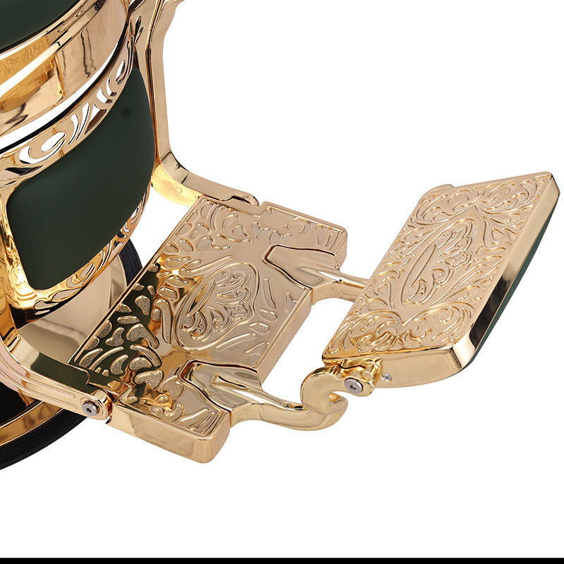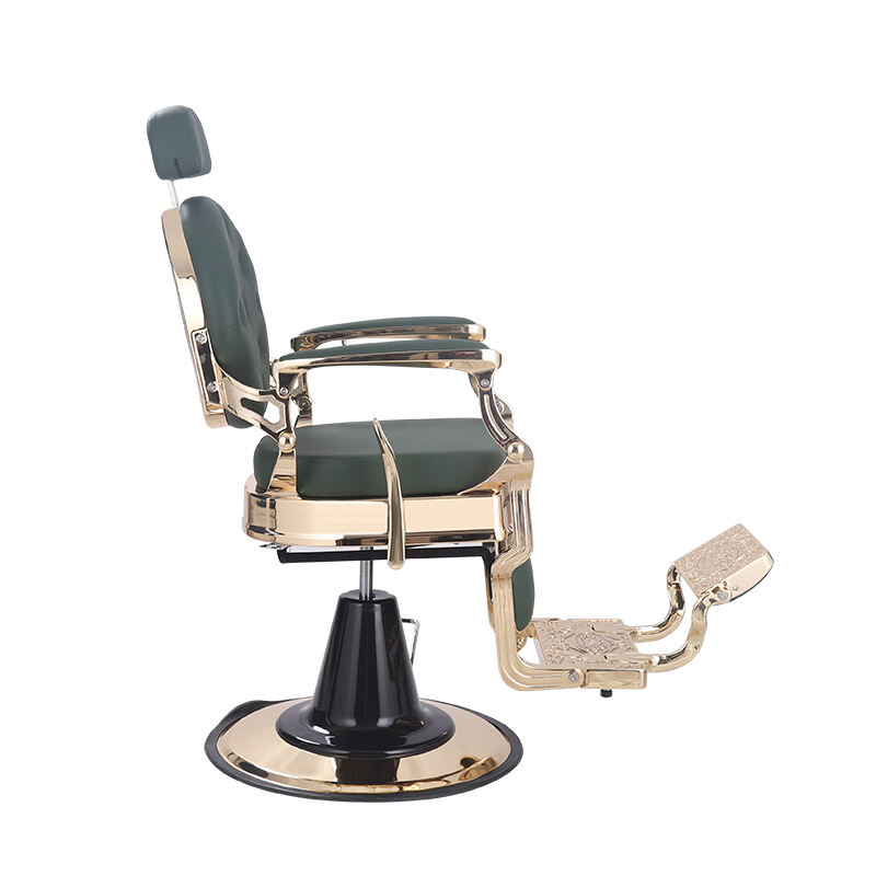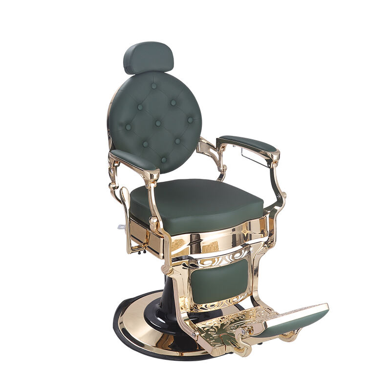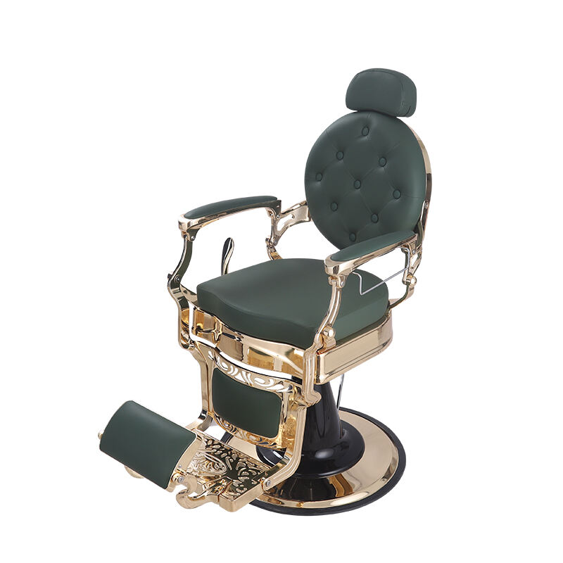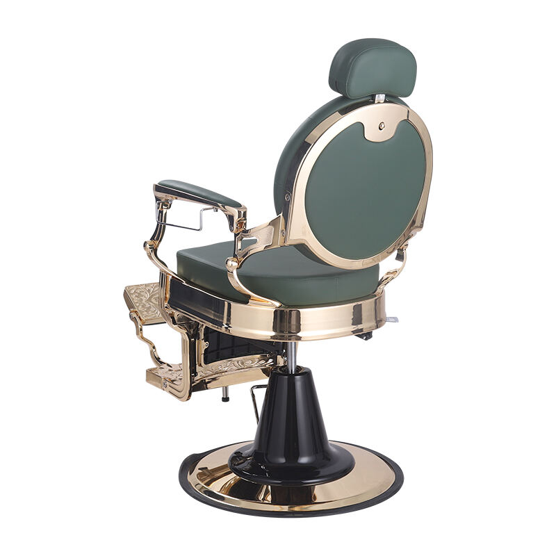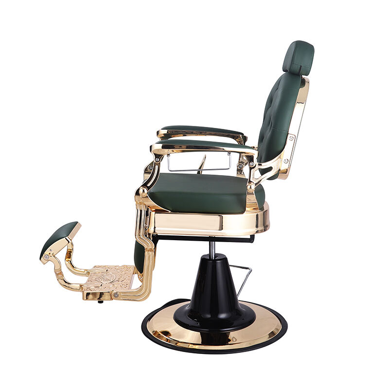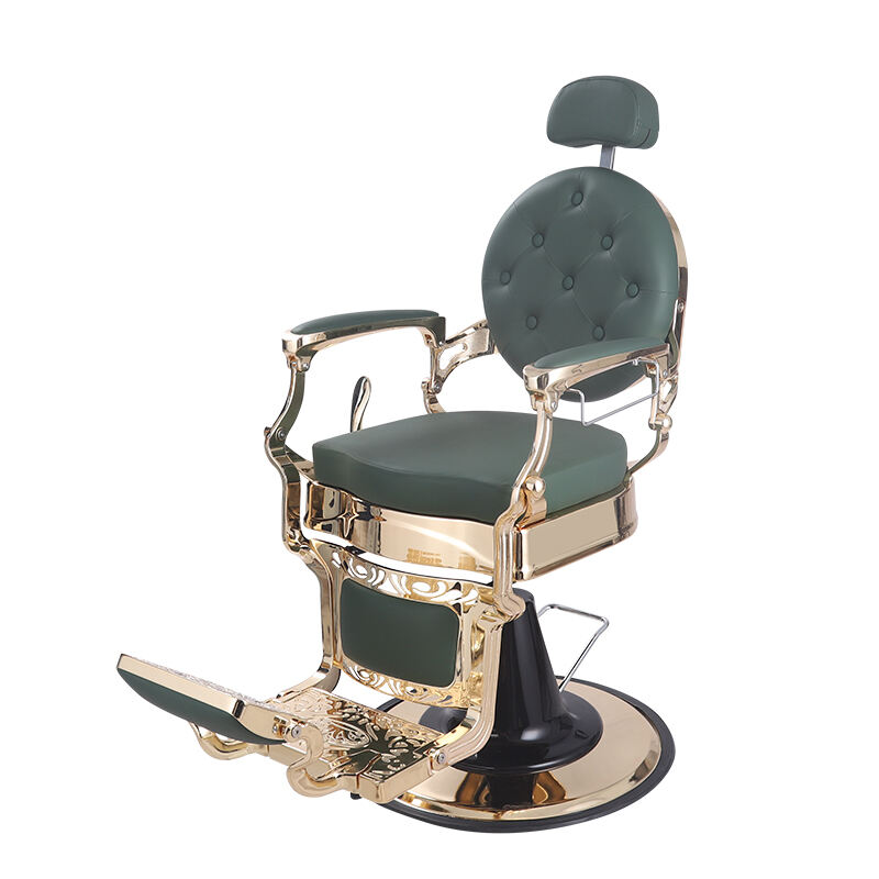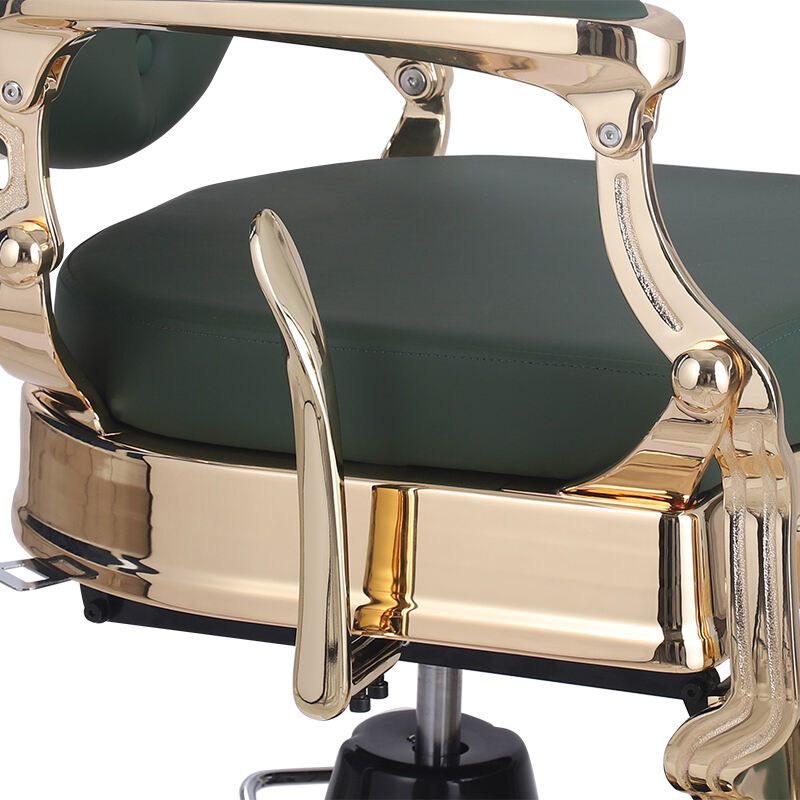 Denna frisörstol är en magnifik kombination av lyx och funktionalitet. Den visar upp en glänsande gyllene metallram som utstrålar storhet. Sätet och ryggstödet är klädda i exquisit mörkgrön läder, med en broderad design som inte bara ser stilfull ut utan också säkerställer överlägsen komfort. Utrustad med justerbara delar såsom huvudstöd och fotstöd kan den tillgodosa de olika behoven hos olika kunder och garantera en bekväm upplevelse under hårklippning. Oavsett om den placeras i en högklassig frisörsalong eller ett chikt frisörbesvärd, kommer denna stol att förhöja skönhetsupplevelsen och sticka ut som ett märkvärdigt möbelstycke.