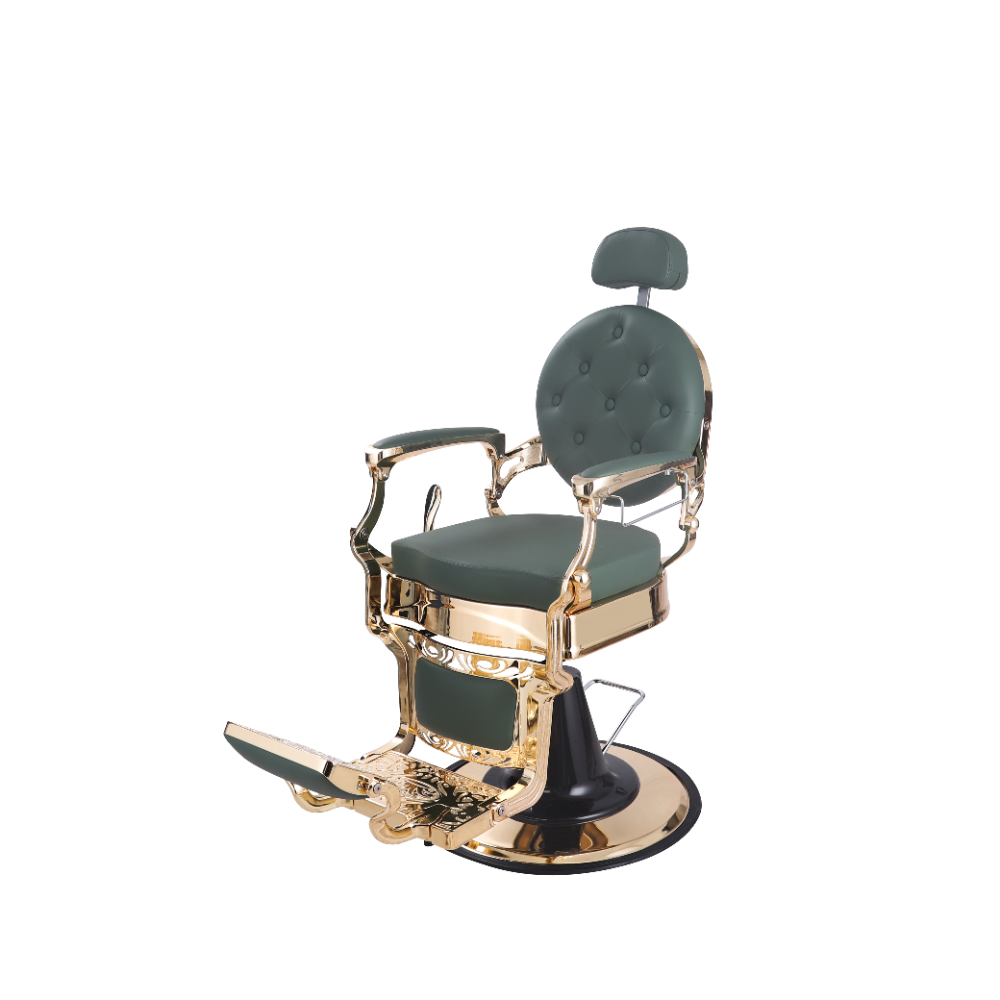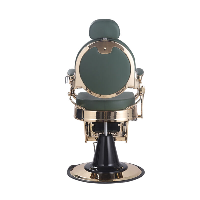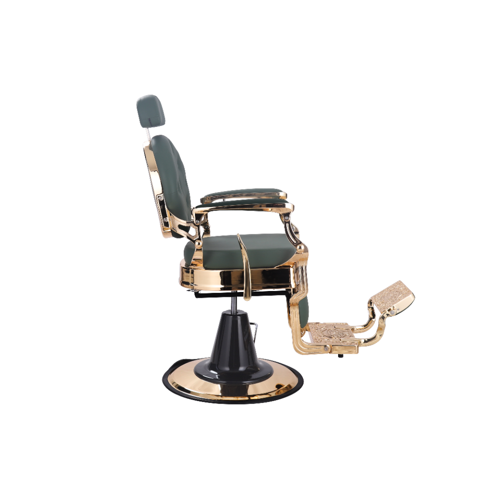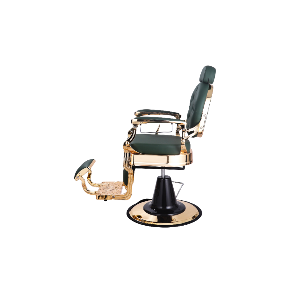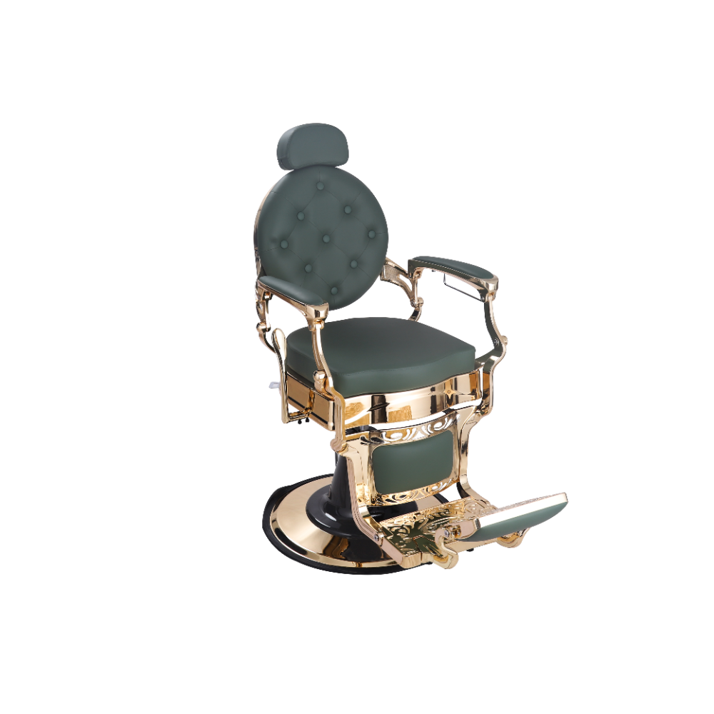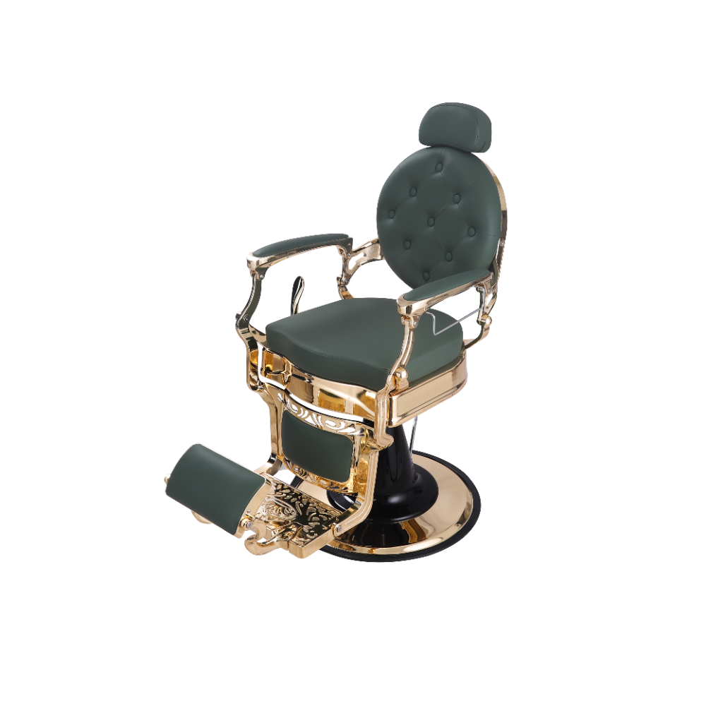 Denna frisörstol är en magnifik kombination av lyx och funktionalitet. Den visar upp en glänsande gyllene metallram som utstrålar storhet. Sätet och ryggstödet är klädda i exquisit mörkgrön läder, med en broderad design som inte bara ser stilfull ut utan också säkerställer överlägsen komfort. Utrustad med justerbara delar såsom huvudstöd och fotstöd kan den tillgodosa de olika behoven hos olika kunder och garantera en bekväm upplevelse under hårklippning. Oavsett om den placeras i en högklassig frisörsalong eller ett chikt frisörbesvärd, kommer denna stol att förhöja skönhetsupplevelsen och sticka ut som ett märkvärdigt möbelstycke.