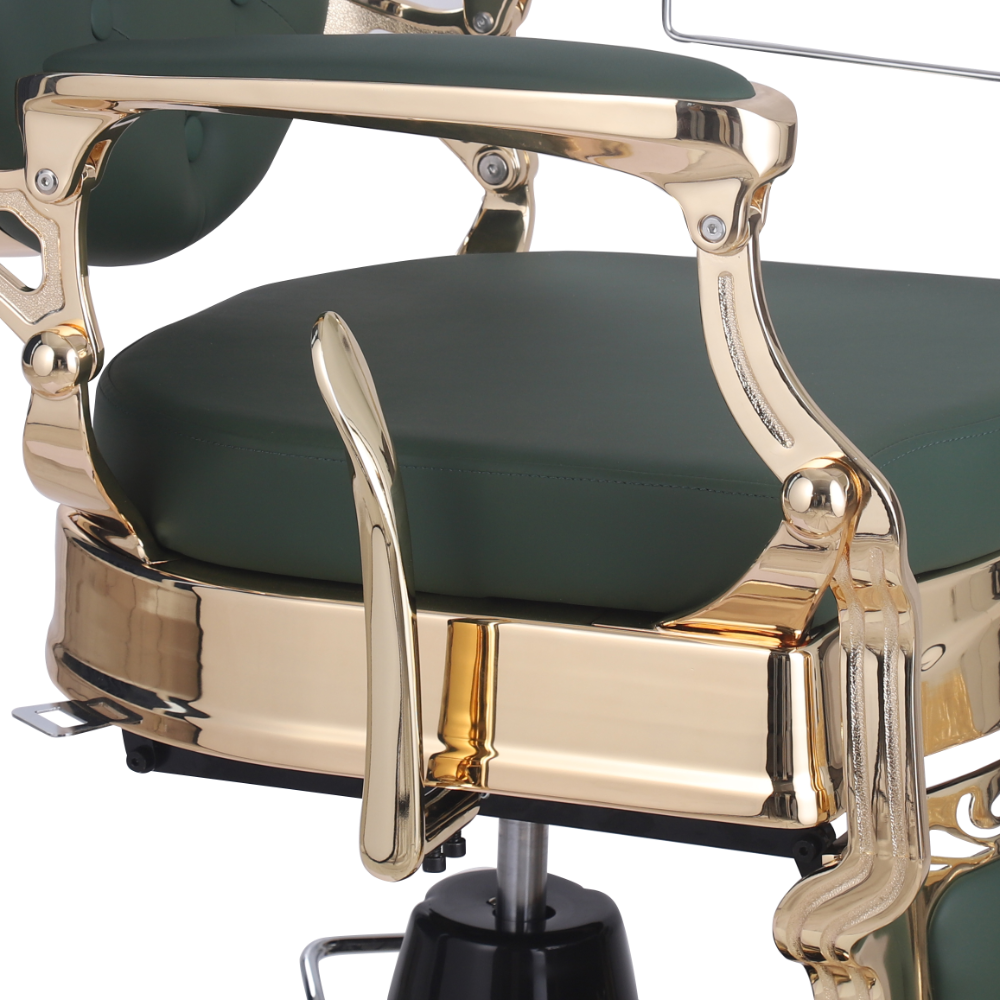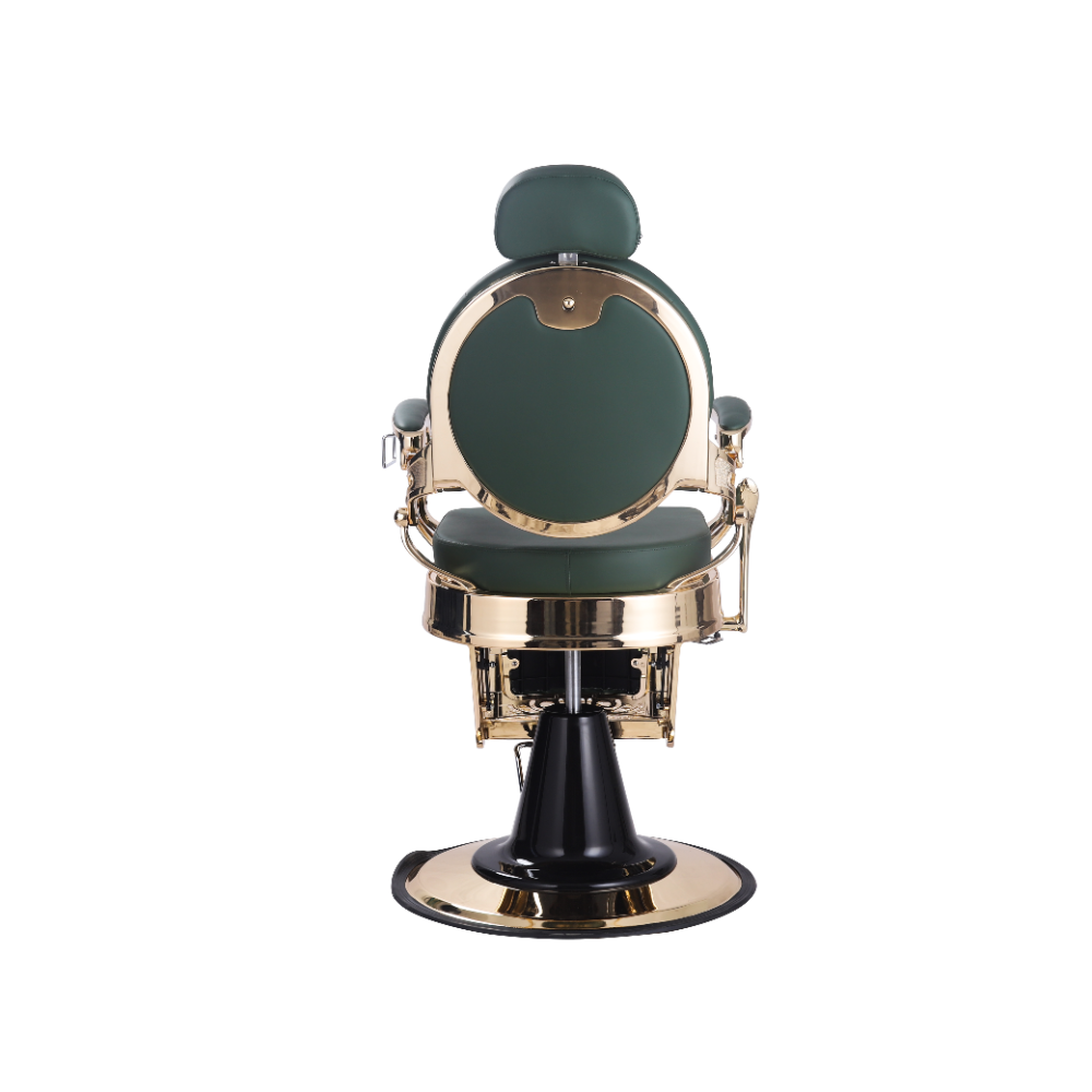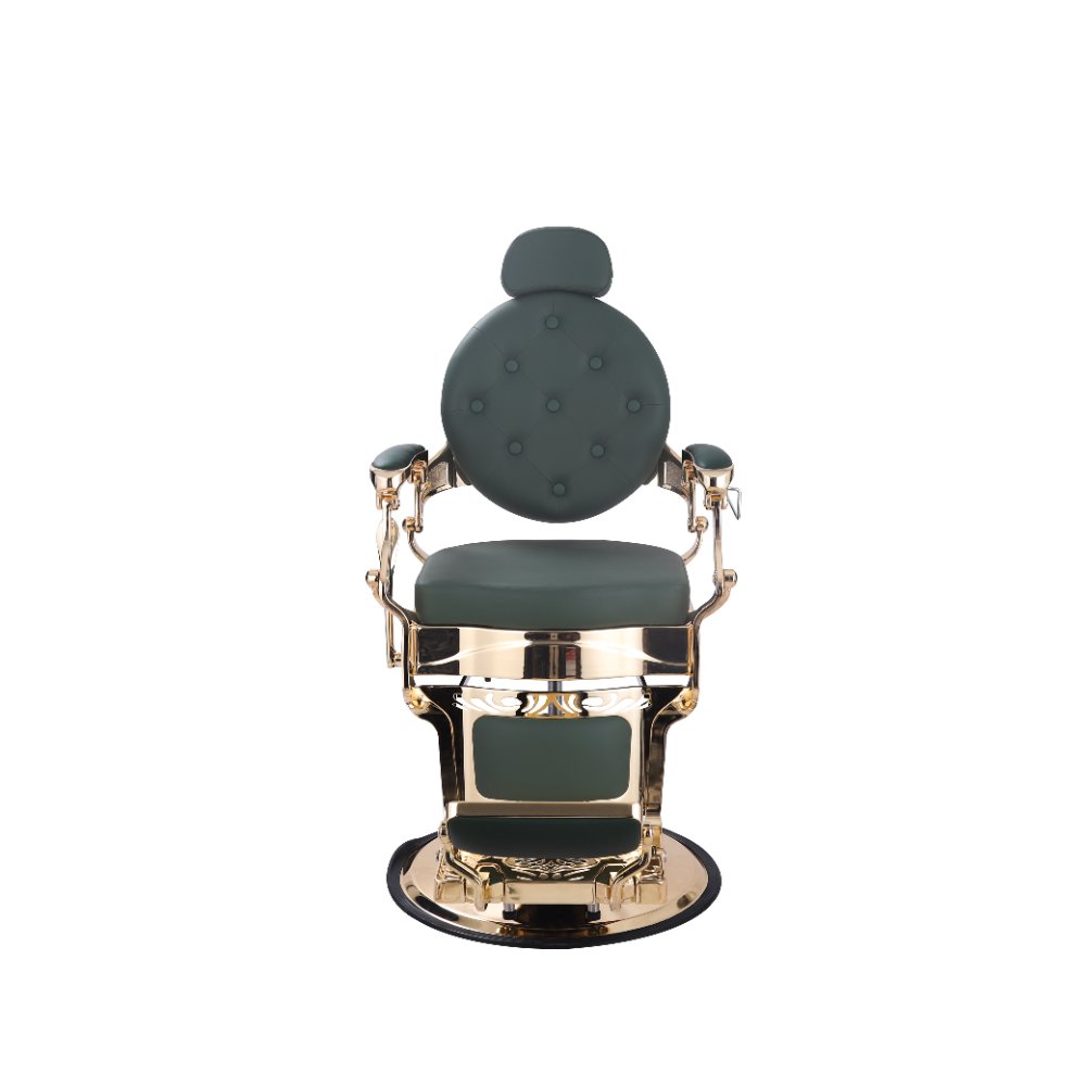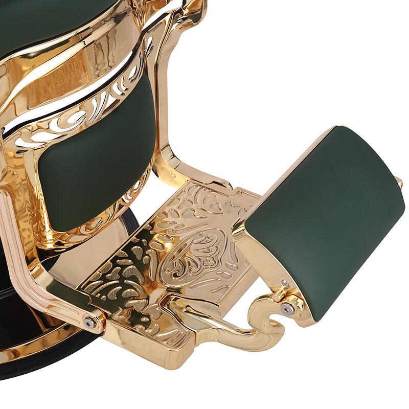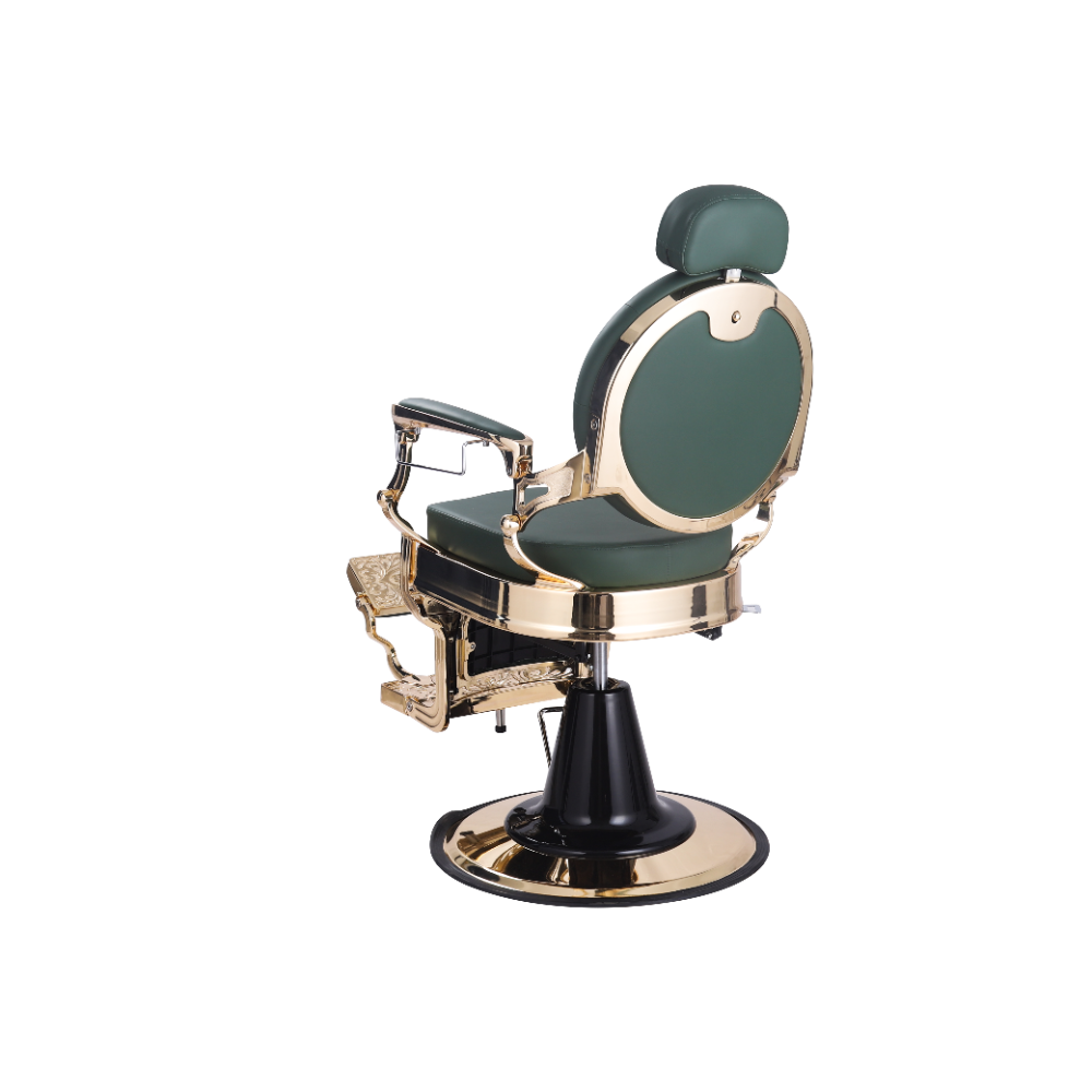 Denna frisörstol är en magnifik kombination av lyx och funktionalitet. Den visar upp en glänsande gyllene metallram som utstrålar storhet. Sätet och ryggstödet är klädda i exquisit mörkgrön läder, med en broderad design som inte bara ser stilfull ut utan också säkerställer överlägsen komfort. Utrustad med justerbara delar såsom huvudstöd och fotstöd kan den tillgodosa de olika behoven hos olika kunder och garantera en bekväm upplevelse under hårklippning. Oavsett om den placeras i en högklassig frisörsalong eller ett chikt frisörbesvärd, kommer denna stol att förhöja skönhetsupplevelsen och sticka ut som ett märkvärdigt möbelstycke.