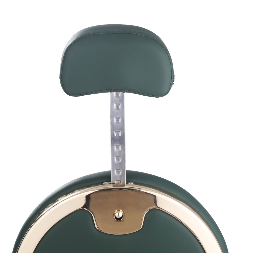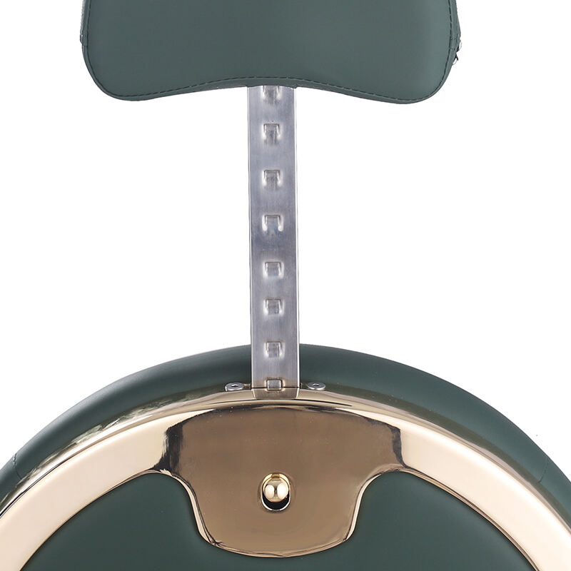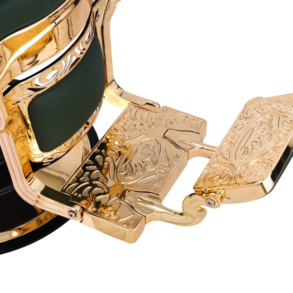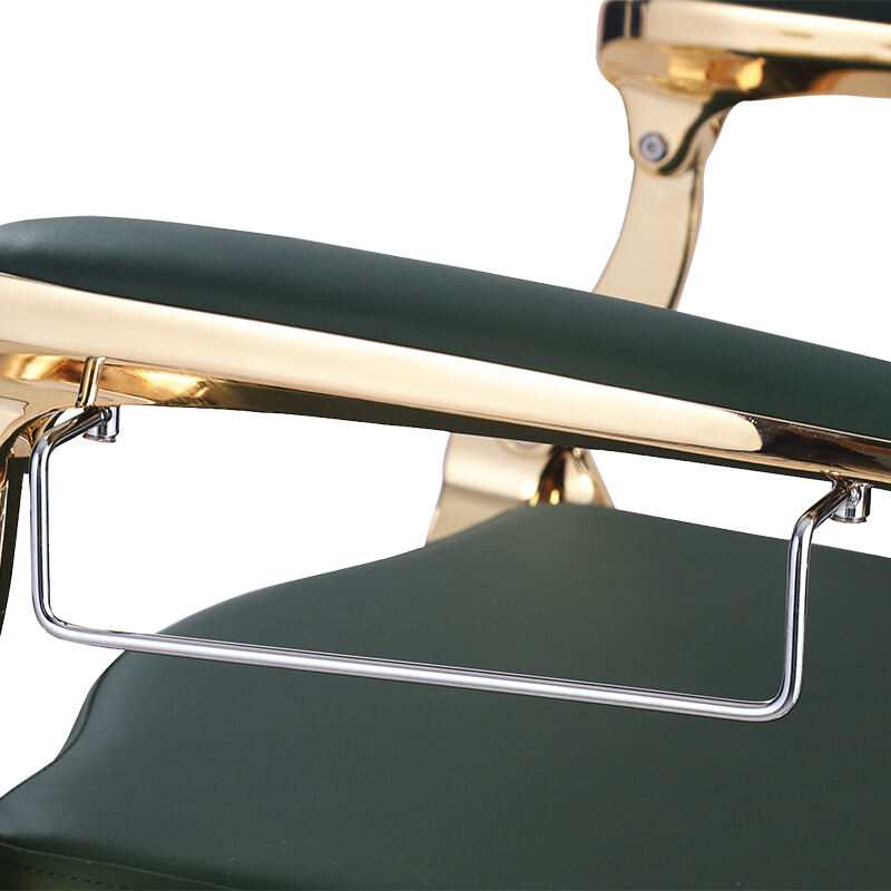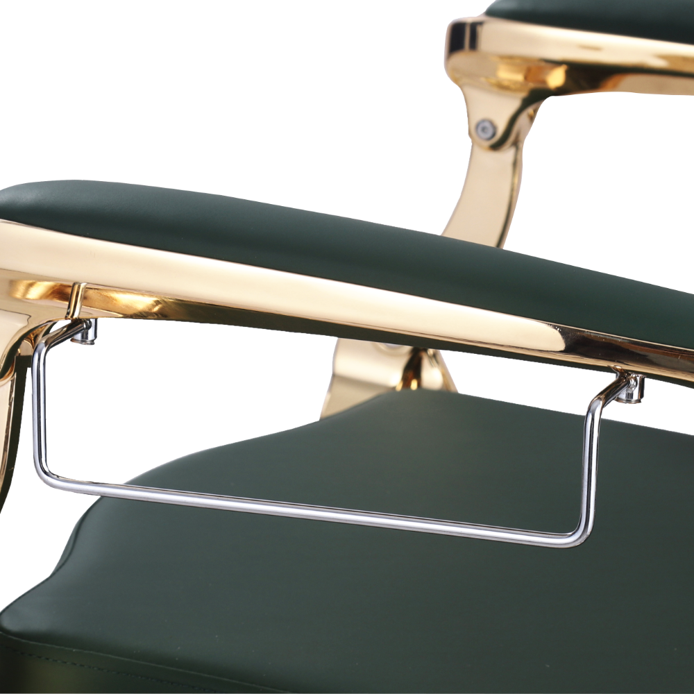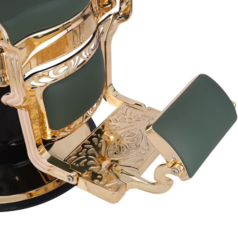Denna frisörstol är en magnifik kombination av lyx och funktionalitet. Den visar upp en glänsande gyllene metallram som utstrålar storhet. Sätet och ryggstödet är klädda i exquisit mörkgrön läder, med en broderad design som inte bara ser stilfull ut utan också säkerställer överlägsen komfort. Utrustad med justerbara delar såsom huvudstöd och fotstöd kan den tillgodosa de olika behoven hos olika kunder och garantera en bekväm upplevelse under hårklippning. Oavsett om den placeras i en högklassig frisörsalong eller ett chikt frisörbesvärd, kommer denna stol att förhöja skönhetsupplevelsen och sticka ut som ett märkvärdigt möbelstycke.