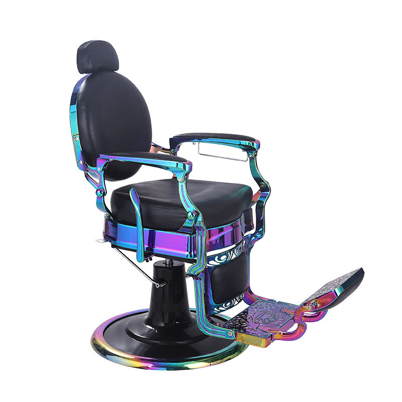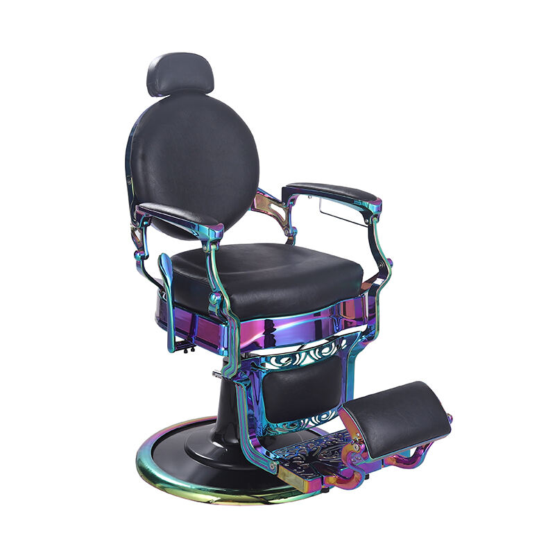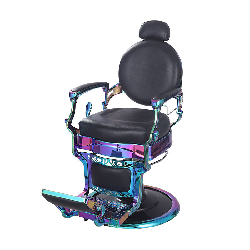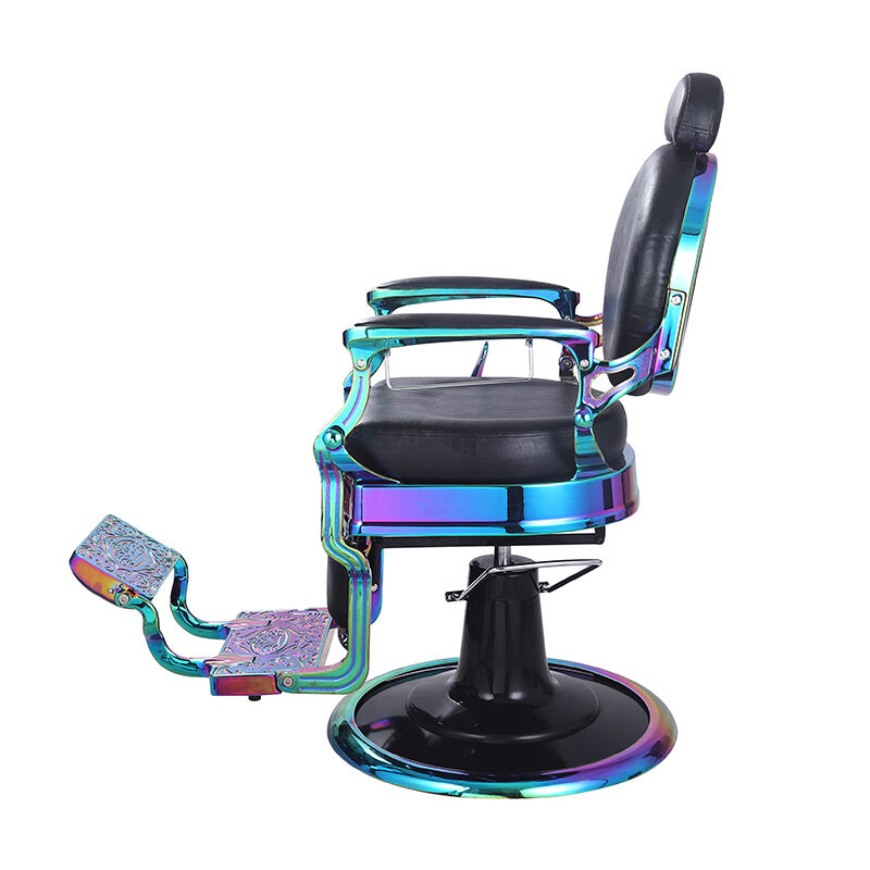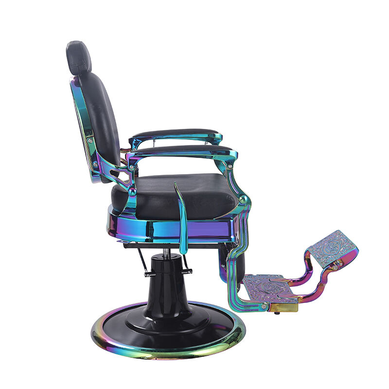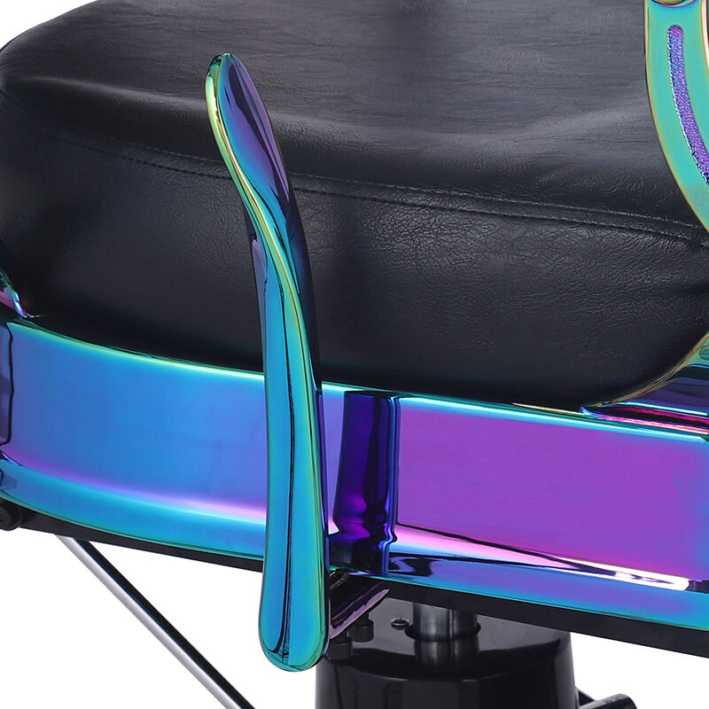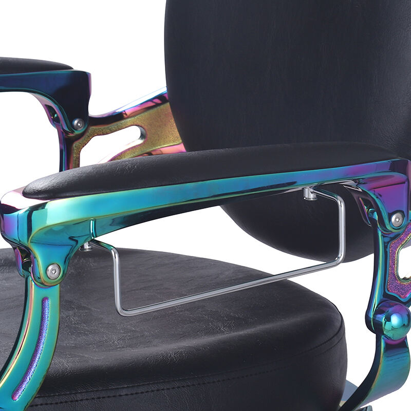 Denna frisörstol är en slående kombination av modern estetik och praktiskhet. Den har en bländande iriserande metallram som reflekterar ett färgspektrum, vilket gör den till en riktig showstopper. Sätet och ryggstödet är klädda med slät svart läder, vilket ger en elegant och bekväm yta. Med justerbara delar som huvudstöd och fotstöd kan stolen anpassas efter olika kunders behov, vilket säkerställer en behaglig och avslappnad upplevelse under friseringen. Oavsett om den placeras i en modern frisörsalong eller ett stilrent frisörbesvärd, kommer denna stol att lägga till en skärpa i modern stil och bli en centraliserad plats som drar blickarna.