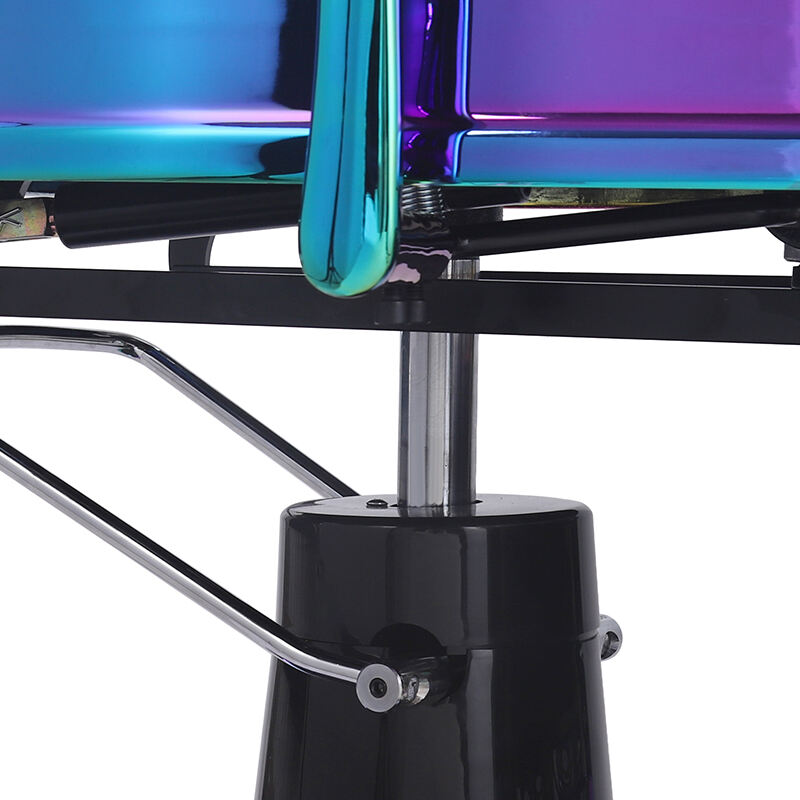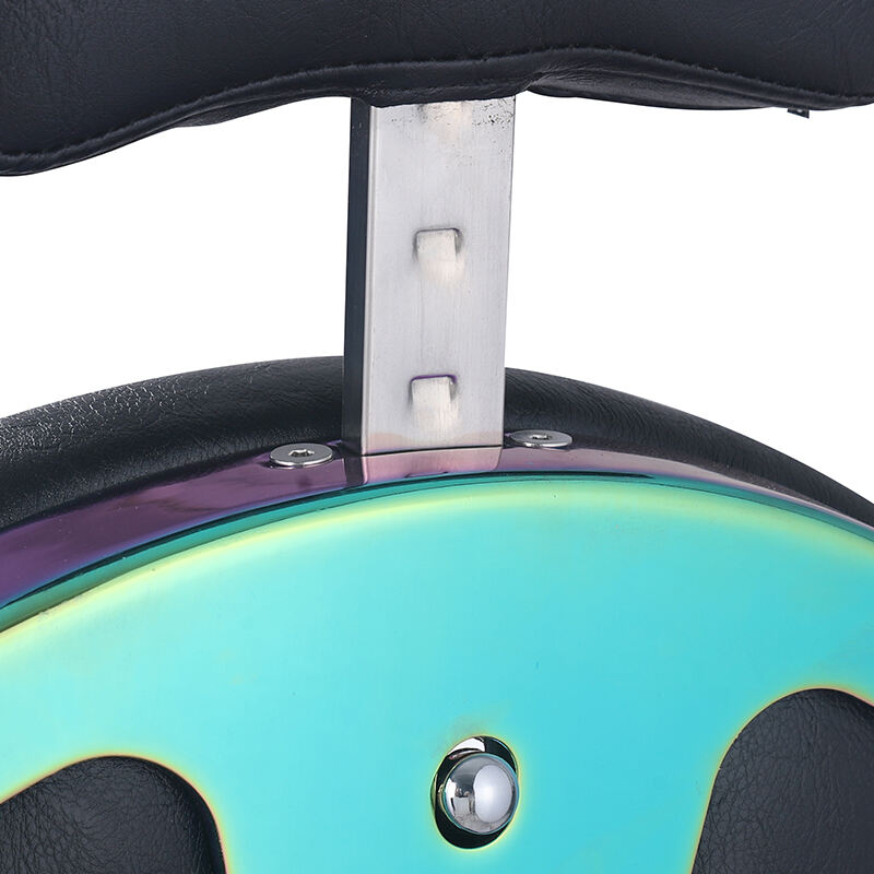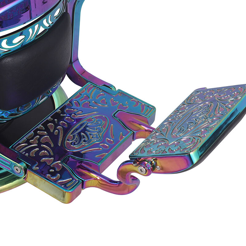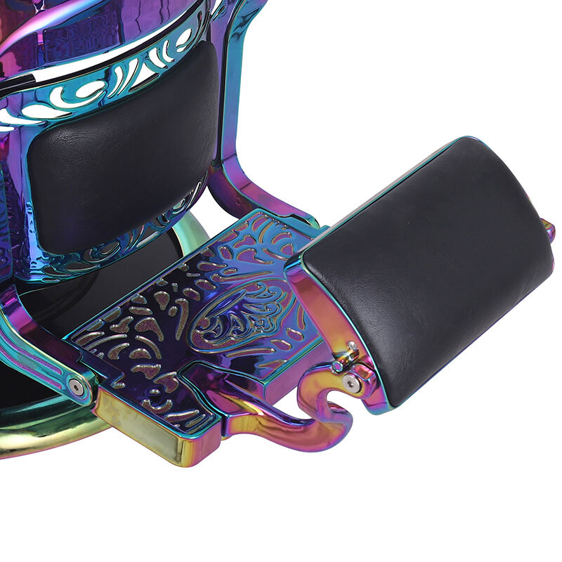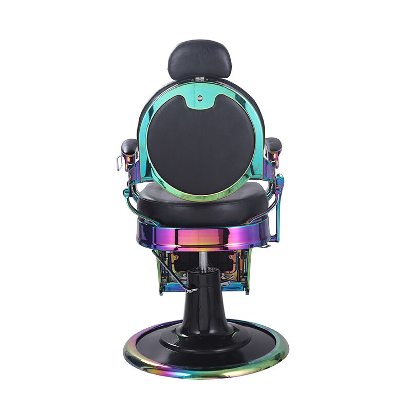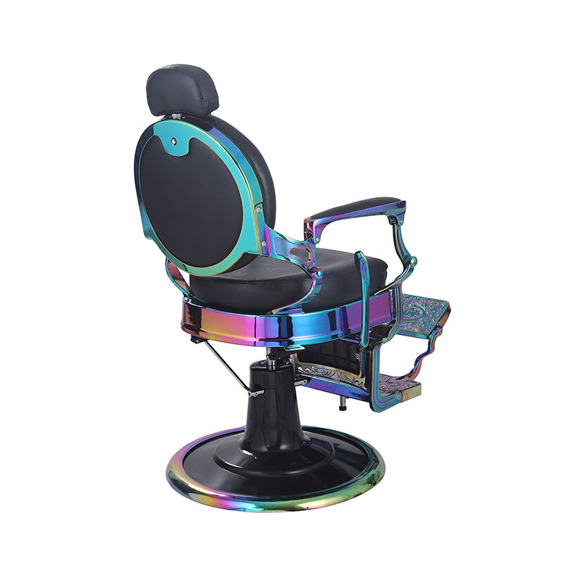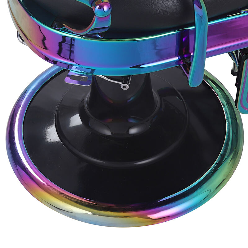 Denna frisörstol är en slående kombination av modern estetik och praktiskhet. Den har en bländande iriserande metallram som reflekterar ett färgspektrum, vilket gör den till en riktig showstopper. Sätet och ryggstödet är klädda med slät svart läder, vilket ger en elegant och bekväm yta. Med justerbara delar som huvudstöd och fotstöd kan stolen anpassas efter olika kunders behov, vilket säkerställer en behaglig och avslappnad upplevelse under friseringen. Oavsett om den placeras i en modern frisörsalong eller ett stilrent frisörbesvärd, kommer denna stol att lägga till en skärpa i modern stil och bli en centraliserad plats som drar blickarna.