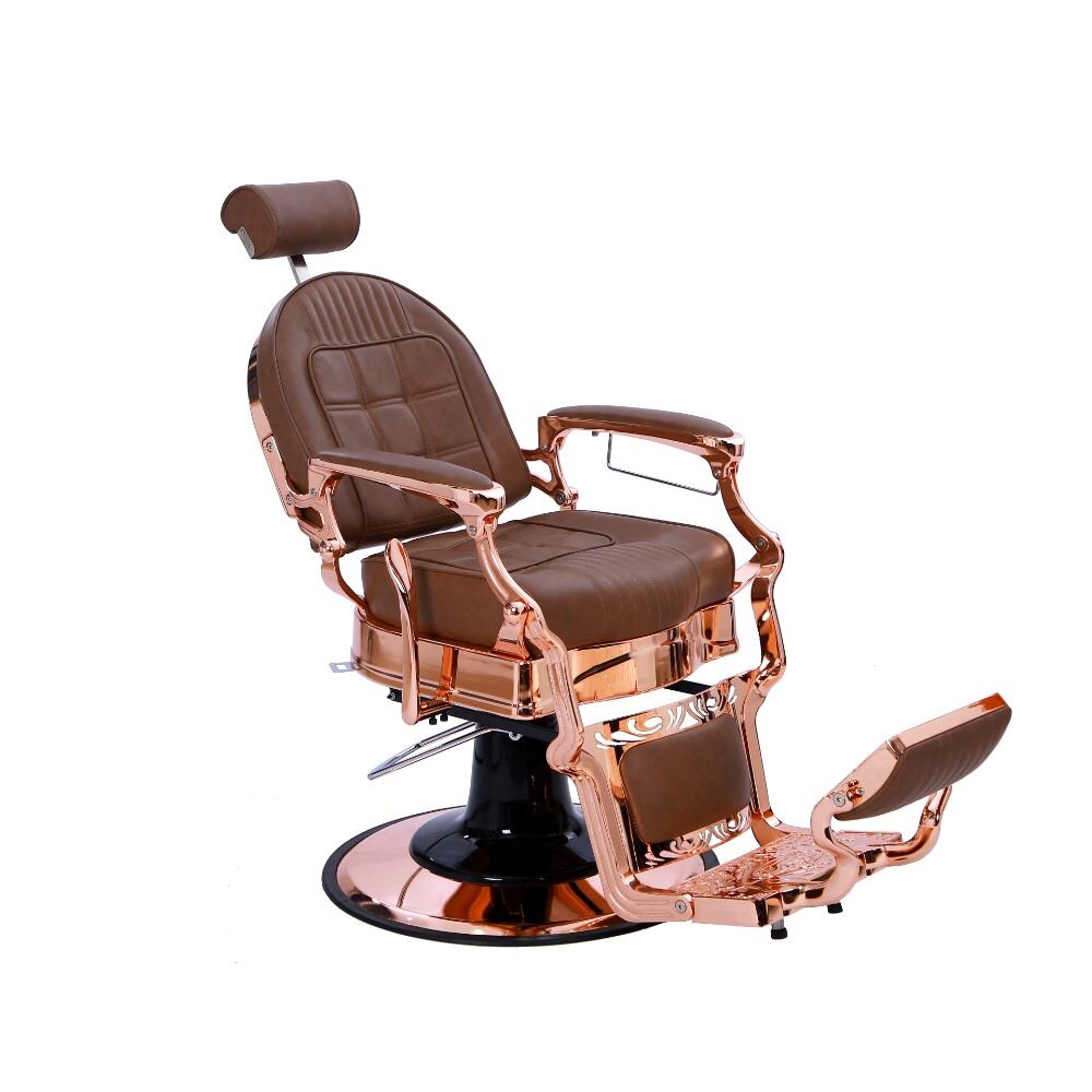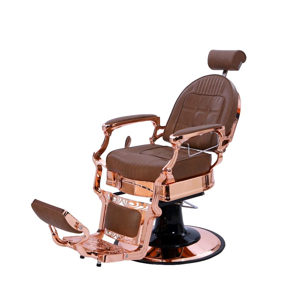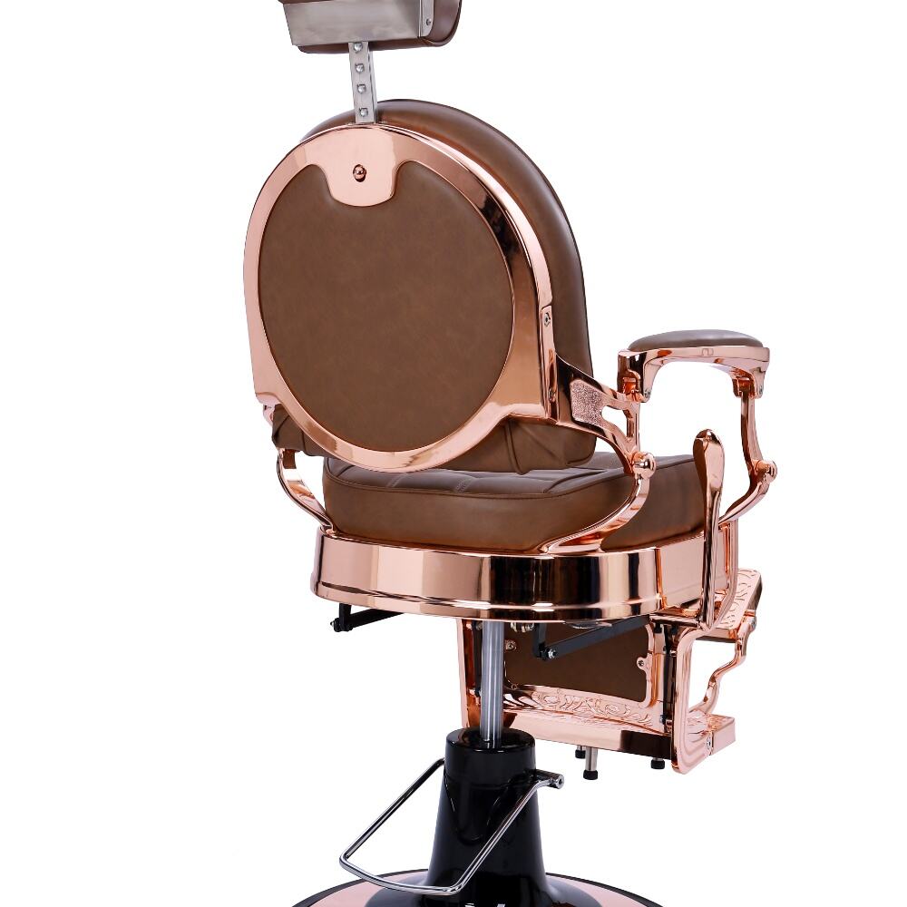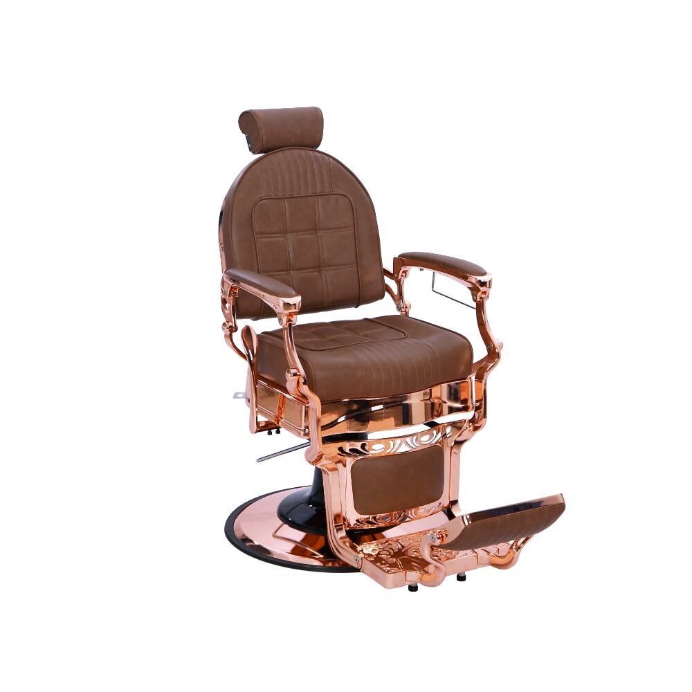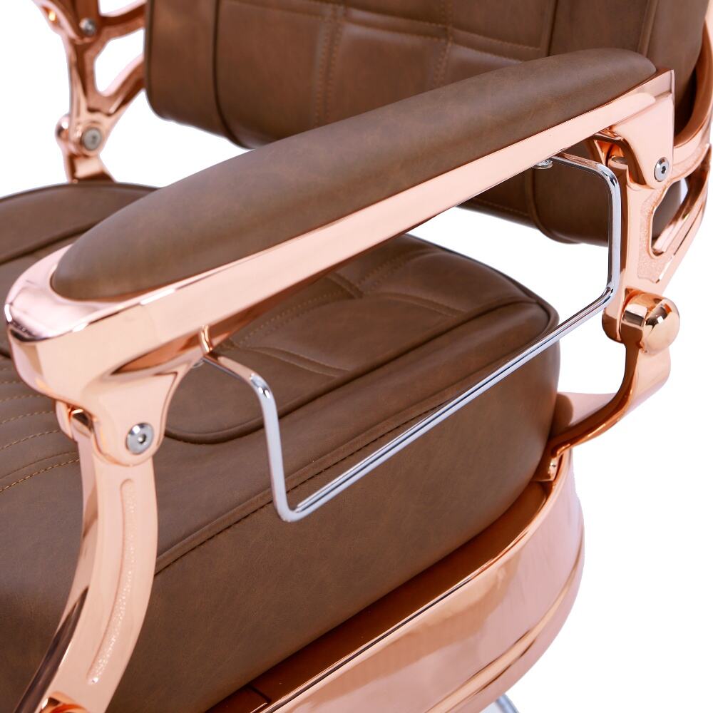 This barber chair is a stunning combination of elegance and practicality. The seat and backrest are covered with high - grade brown leather, featuring a neat grid pattern that looks both classic and cozy.The metal parts boast a beautiful copper finish, adding a touch of luxury and sophistication. It is equipped with adjustable functions, such as a reclining back and a height - adjustable base, which can meet the diverse needs of clients during various grooming procedures like haircuts and shaves.With its durable construction and ergonomic design, this chair not only ensures a comfortable experience for users but also serves as a stylish centerpiece that can elevate the ambiance of any barbershop or salon.