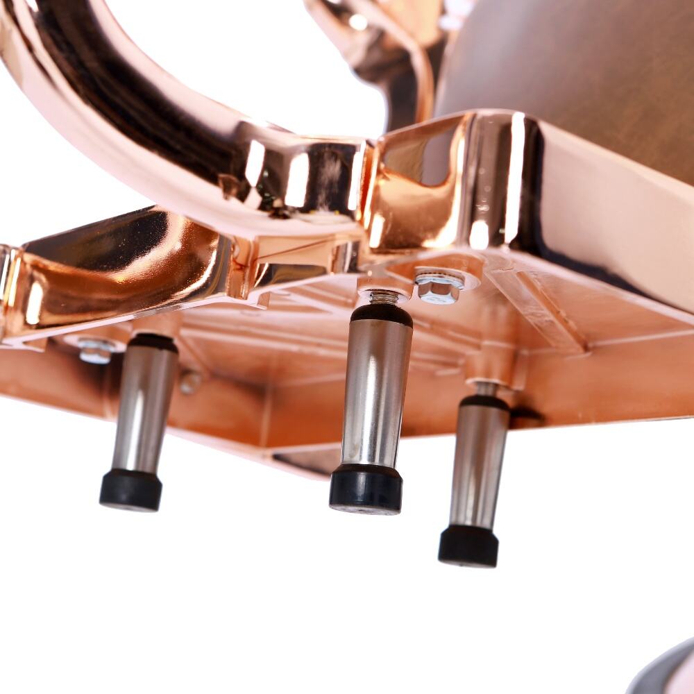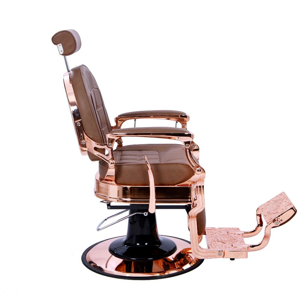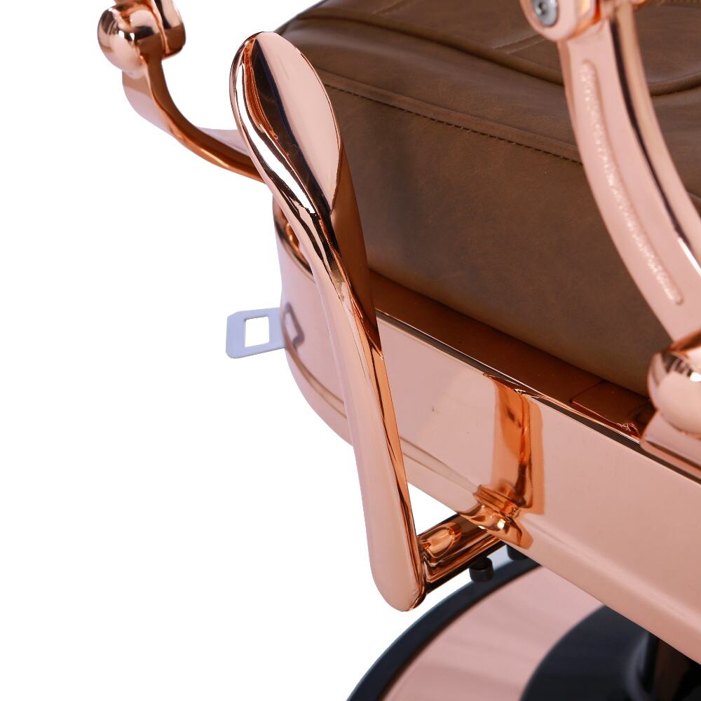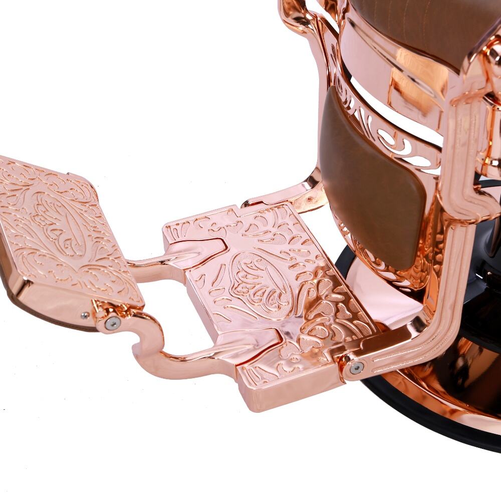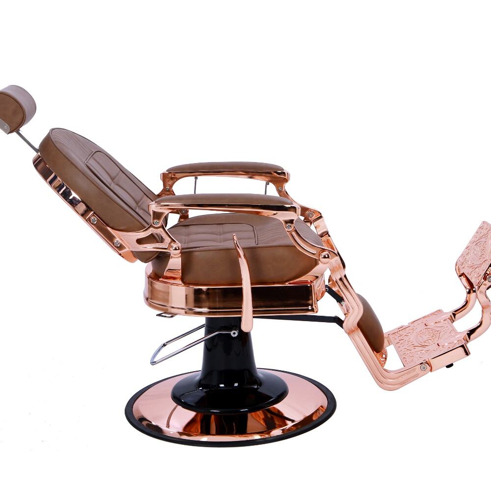 This barber chair is a stunning combination of elegance and practicality. The seat and backrest are covered with high - grade brown leather, featuring a neat grid pattern that looks both classic and cozy.The metal parts boast a beautiful copper finish, adding a touch of luxury and sophistication. It is equipped with adjustable functions, such as a reclining back and a height - adjustable base, which can meet the diverse needs of clients during various grooming procedures like haircuts and shaves.With its durable construction and ergonomic design, this chair not only ensures a comfortable experience for users but also serves as a stylish centerpiece that can elevate the ambiance of any barbershop or salon.