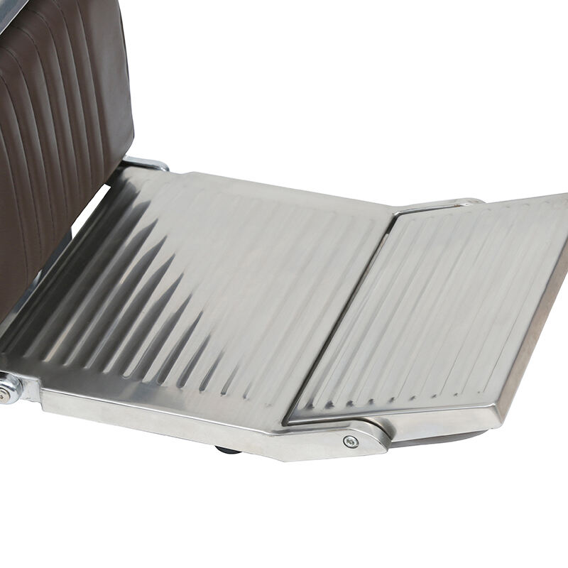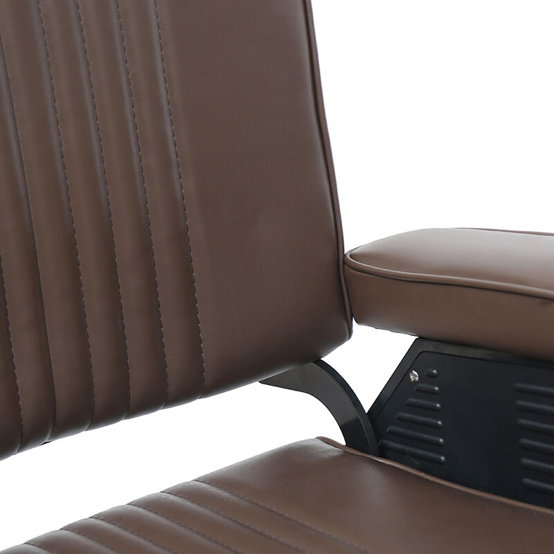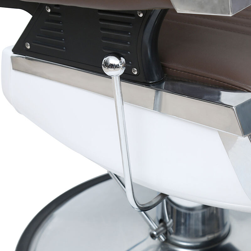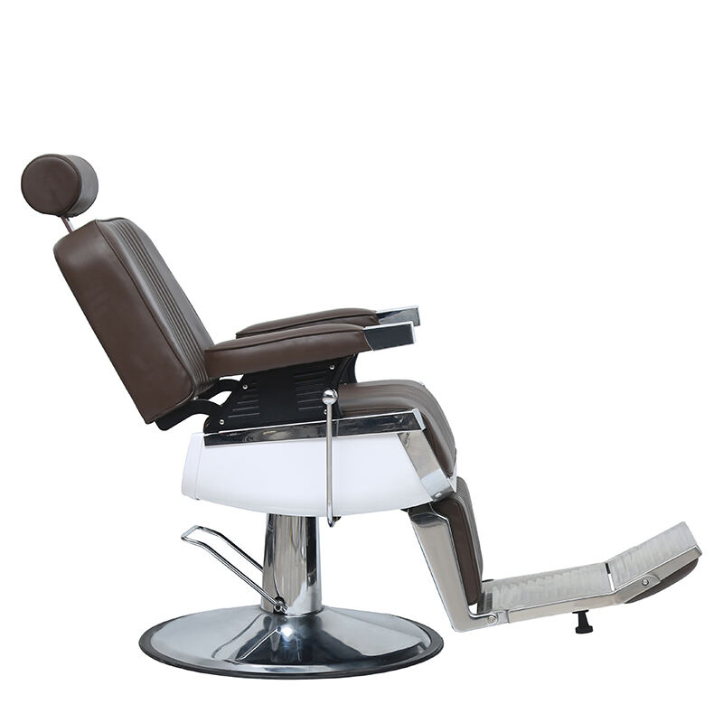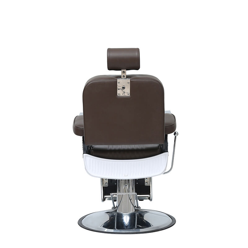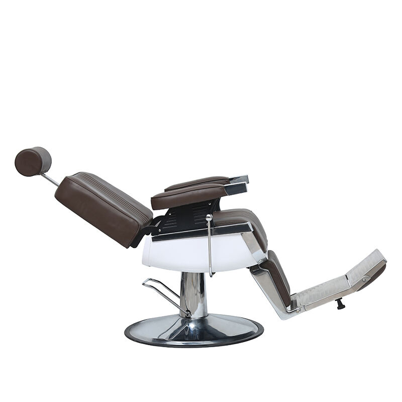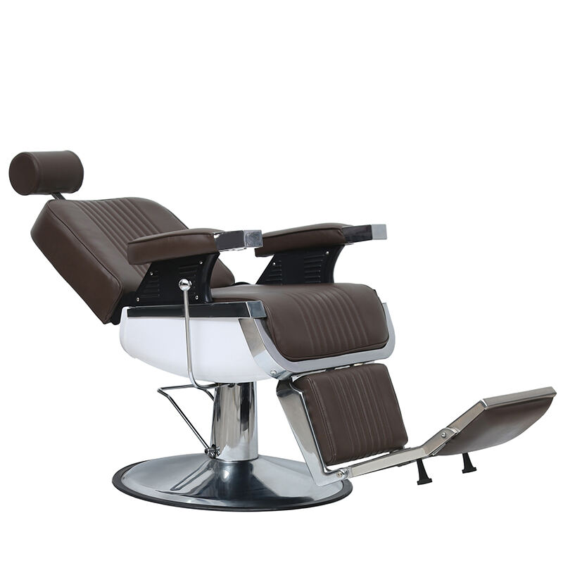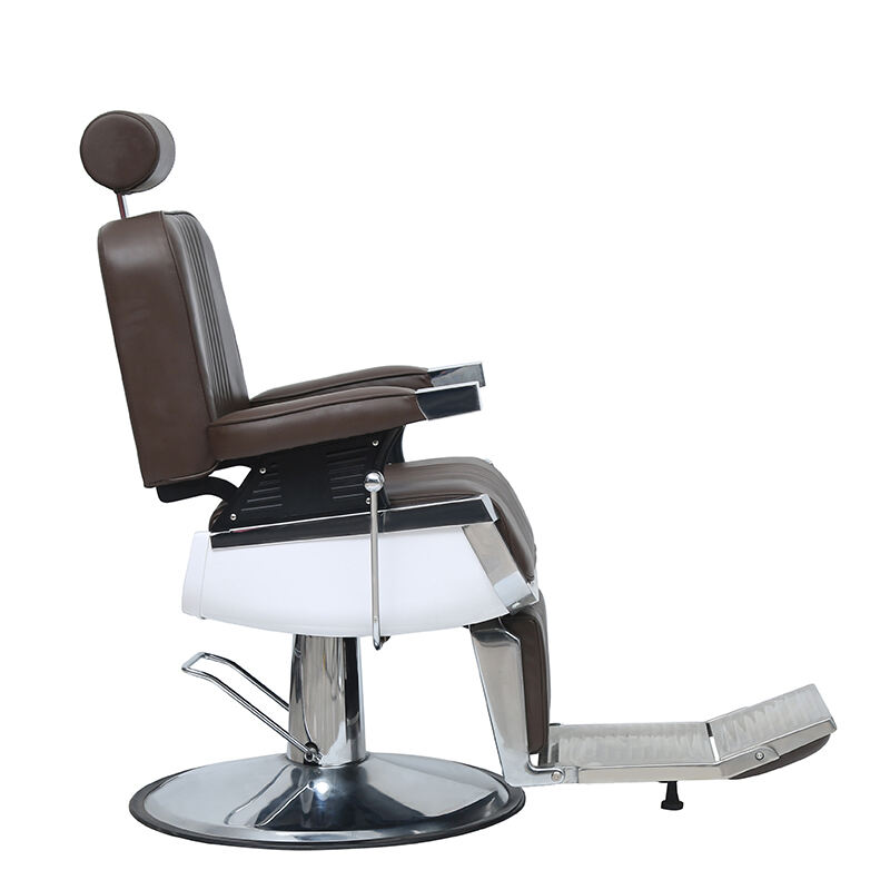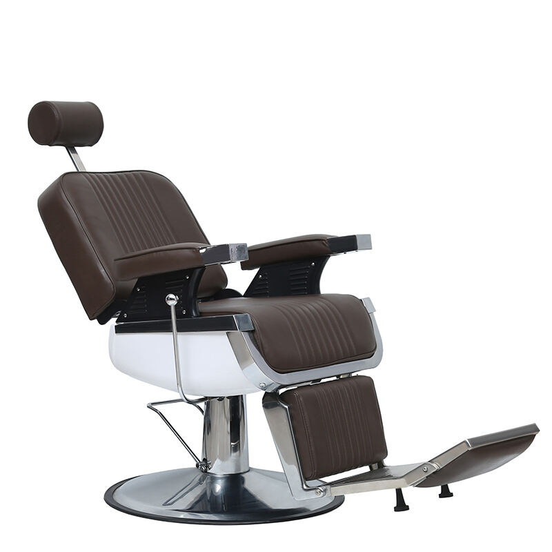 This barber chair is a remarkable combination of elegance and practicality. Upholstered in premium brown leather, it provides superior comfort, allowing clients to relax throughout their grooming process. The polished metal parts not only give it a sophisticated look but also ensure long - lasting durability.It comes with adjustable elements such as a reclining back and a movable footrest, which can be customized to suit different requirements. This ensures a smooth and pleasant experience for both barbers and customers. Whether placed in a contemporary salon or a classic barbershop, this chair is sure to enhance the overall atmosphere of the grooming space.