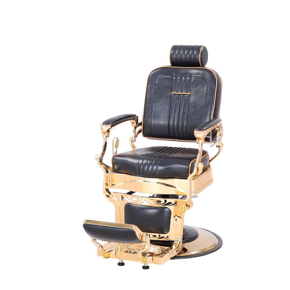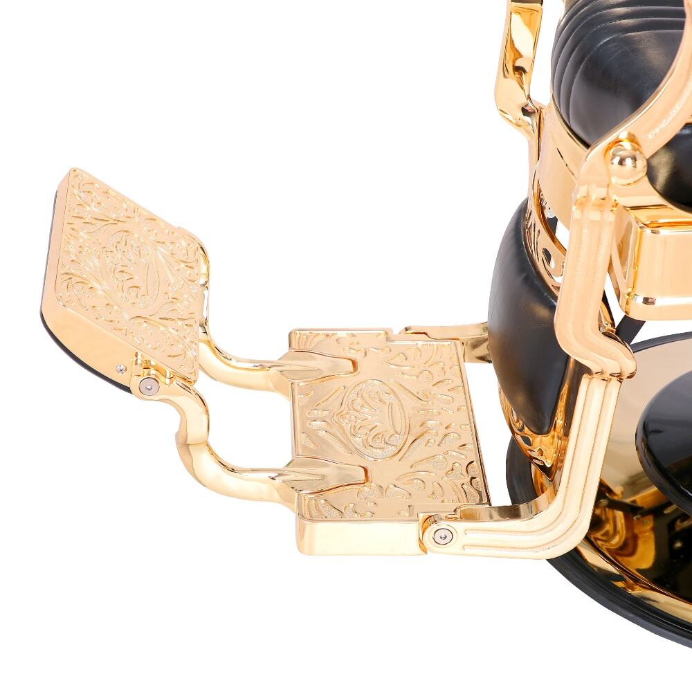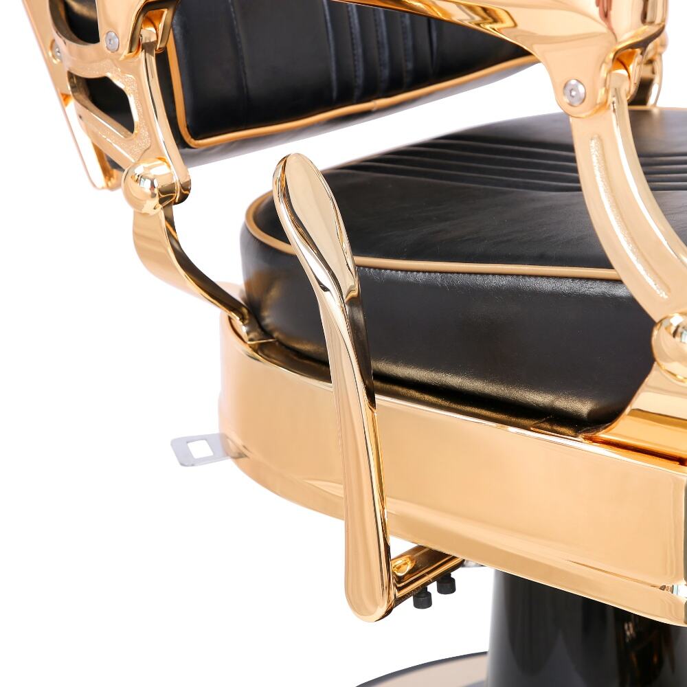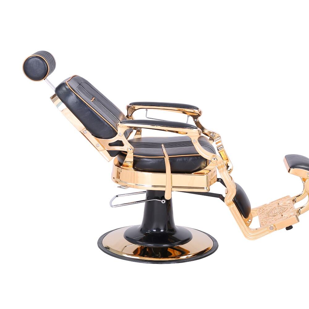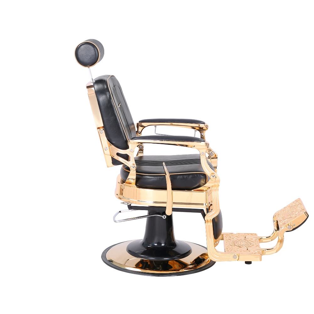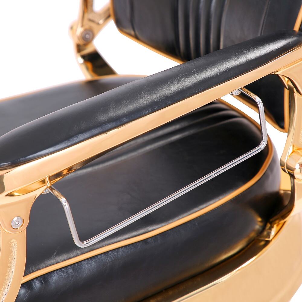 The barber chair embodies luxury and superior craftsmanship.It features a sleek black leather upholstery with subtle stitching details, exuding an air of timeless elegance. The chair is lavishly adorned with gleaming gold - plated metal components, from the intricately designed armrests to the ornate base, creating a striking contrast that instantly elevates the aesthetic of any barbershop.For comfort, the generously padded seat and backrest, along with the adjustable headrest, ensure clients can unwind during their grooming sessions. Functionally, it boasts a smooth hydraulic lifting system for easy height adjustment, a 360 - degree swivel function for precise positioning, and a reclining backrest with an extendable footrest to meet various barbering requirements.Built to endure, with high - quality materials and a robust base, this chair is not just a piece of salon equipment but a statement of luxury, offering both barbers and clients an unparalleled experience.