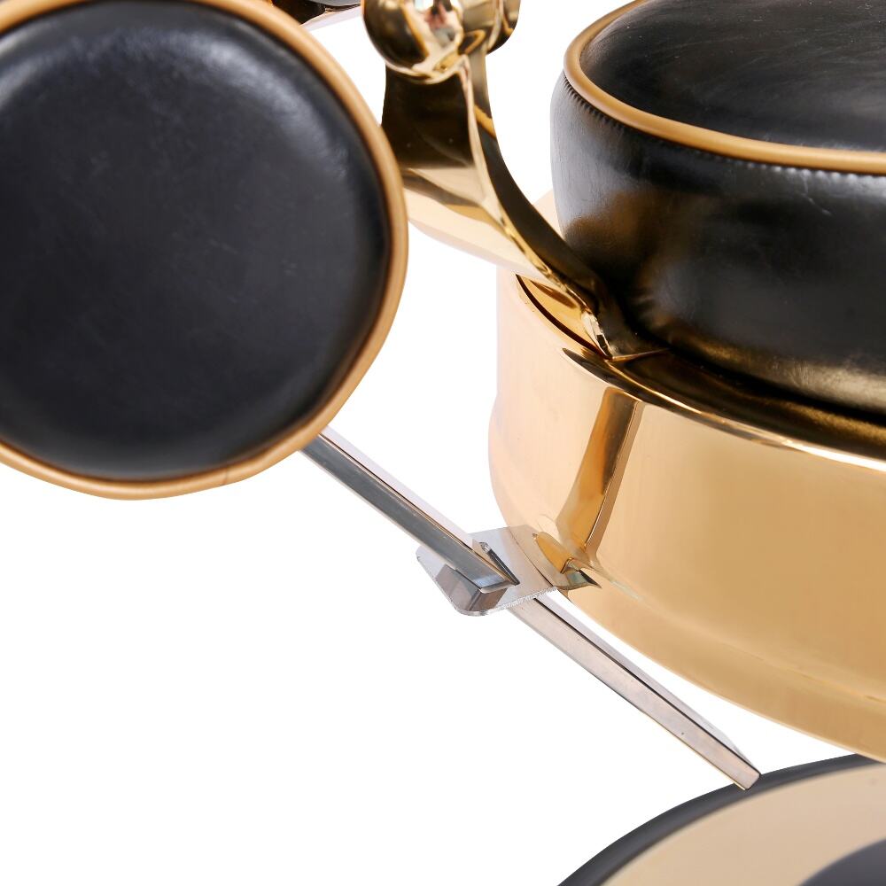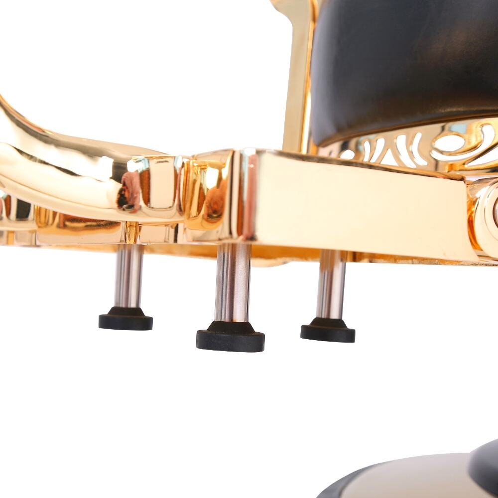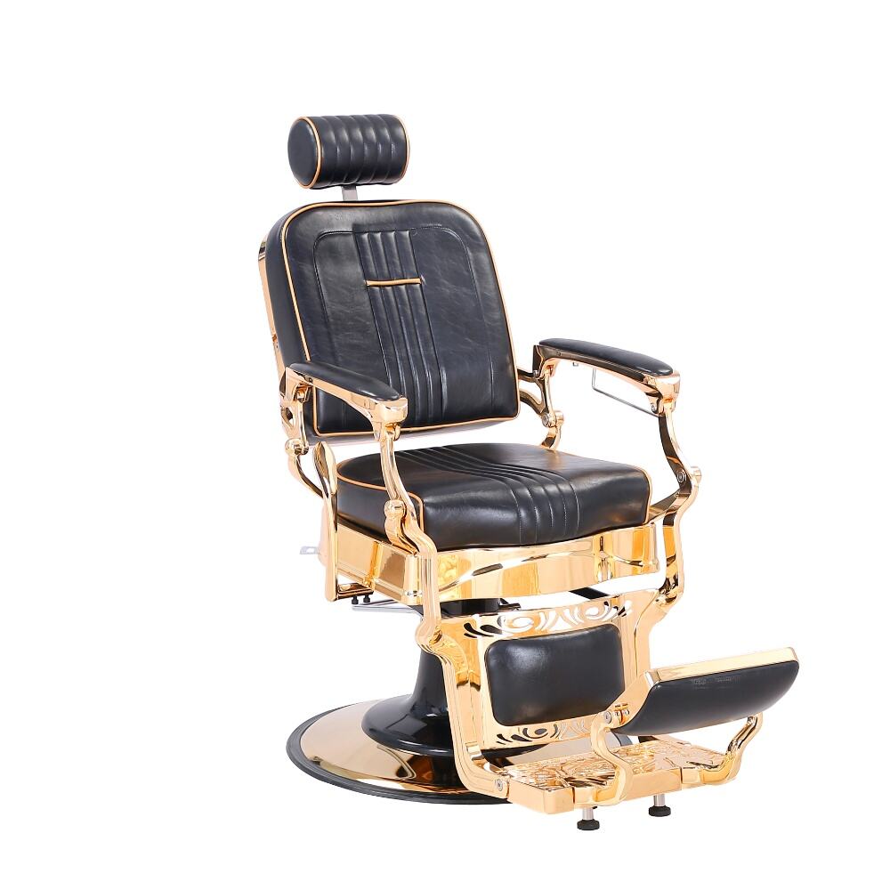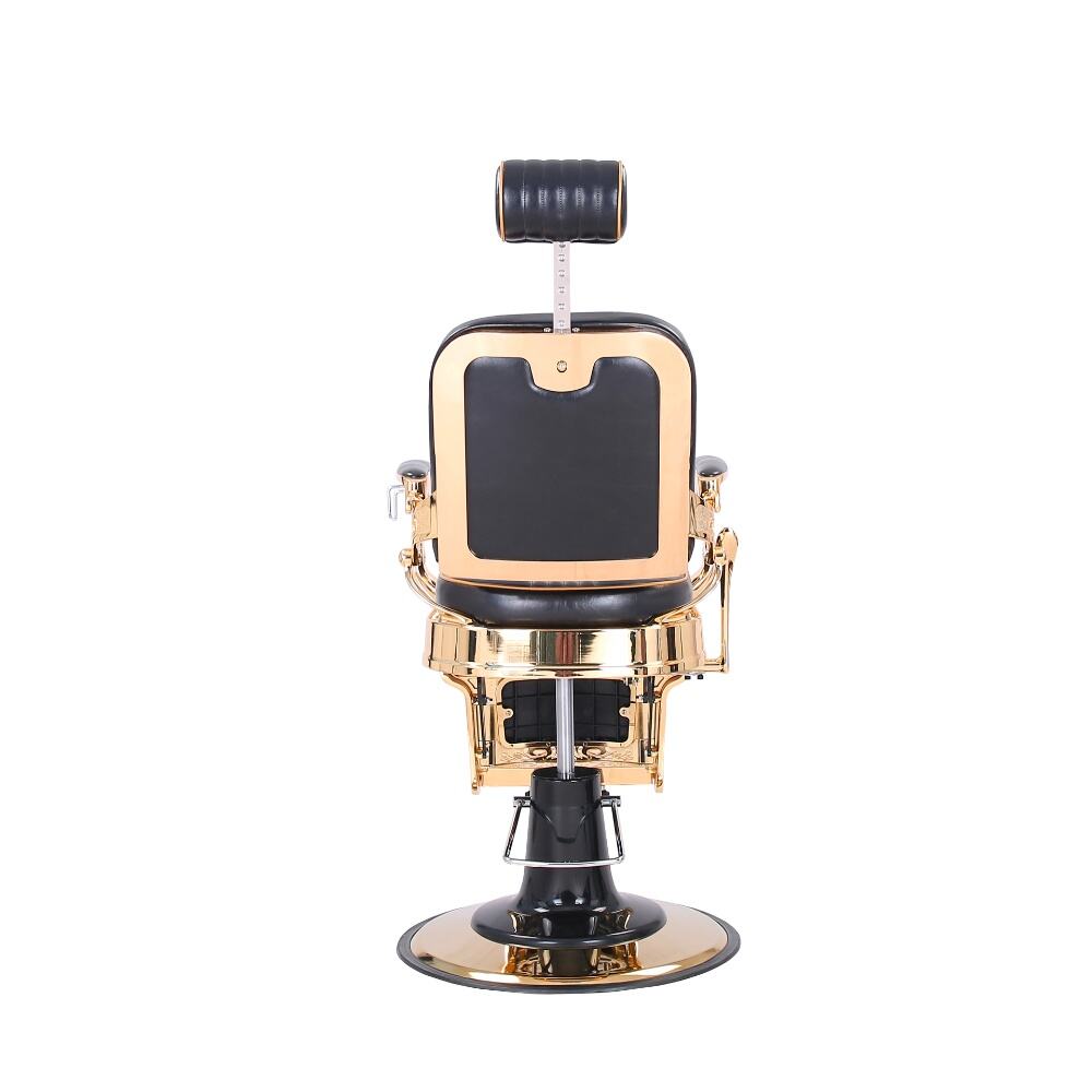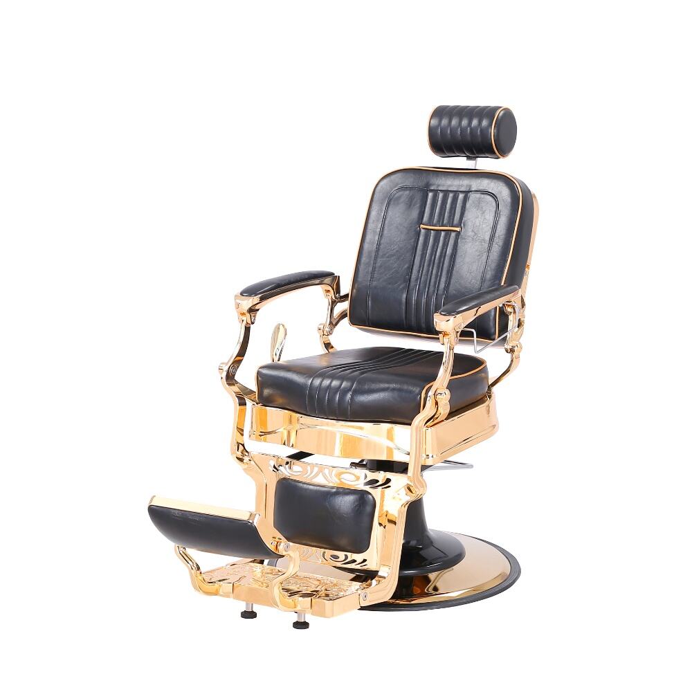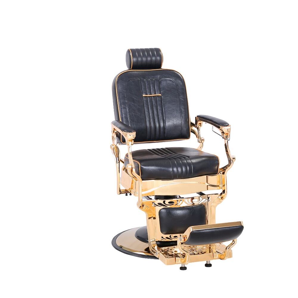 The barber chair embodies luxury and superior craftsmanship.It features a sleek black leather upholstery with subtle stitching details, exuding an air of timeless elegance. The chair is lavishly adorned with gleaming gold - plated metal components, from the intricately designed armrests to the ornate base, creating a striking contrast that instantly elevates the aesthetic of any barbershop.For comfort, the generously padded seat and backrest, along with the adjustable headrest, ensure clients can unwind during their grooming sessions. Functionally, it boasts a smooth hydraulic lifting system for easy height adjustment, a 360 - degree swivel function for precise positioning, and a reclining backrest with an extendable footrest to meet various barbering requirements.Built to endure, with high - quality materials and a robust base, this chair is not just a piece of salon equipment but a statement of luxury, offering both barbers and clients an unparalleled experience.