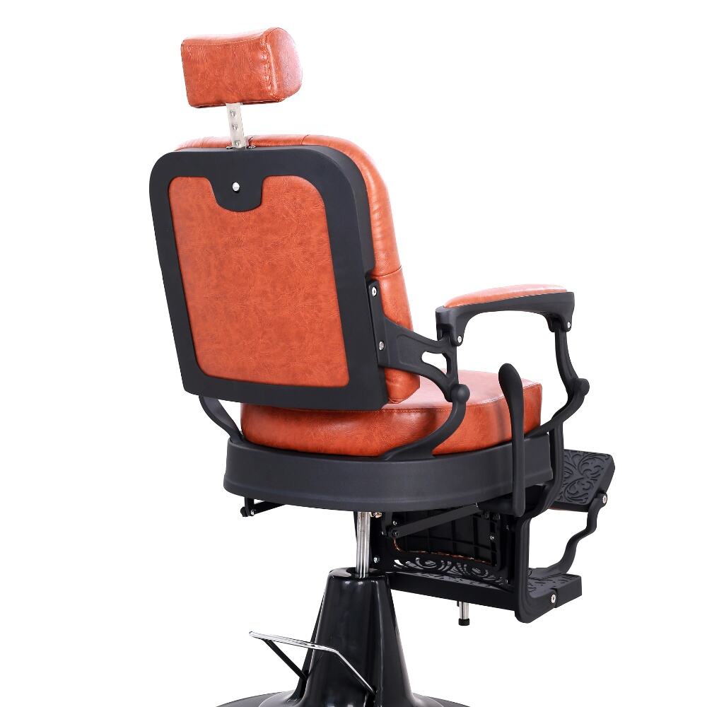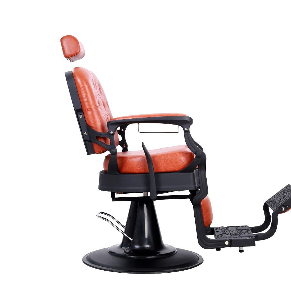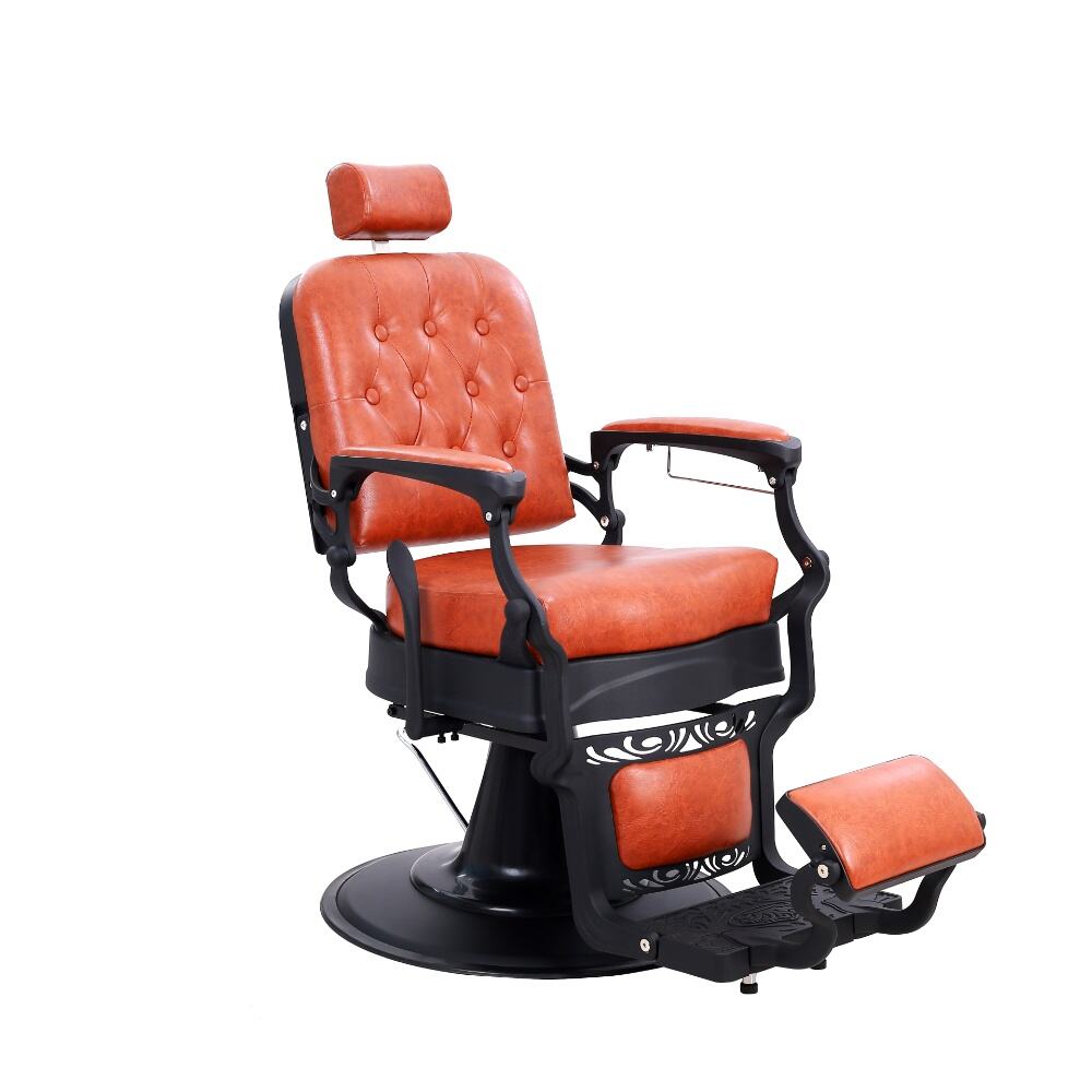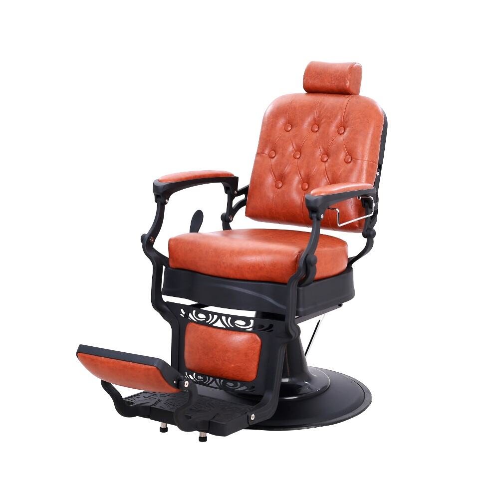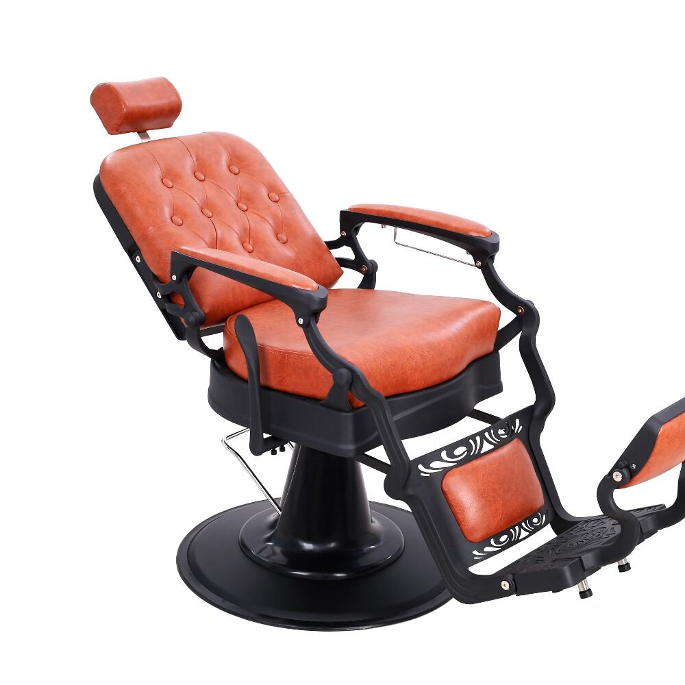 The barber chair that perfectly combines vintage charm with modern functionality.It features a warm orange leather upholstery with classic button tufting on the backrest, bringing a touch of retro elegance. The black metal frame, with its sleek lines and subtle decorative cutouts, adds a contemporary edge, creating a harmonious blend of old - timey and modern aesthetics.For comfort, the generously padded seat and backrest, along with the adjustable headrest, ensure clients can relax throughout their grooming sessions. Functionally, it comes with a smooth hydraulic system for easy height adjustment, a 360 - degree swivel function for optimal positioning, and a reclining backrest with an extendable footrest to meet various barbering needs, whether it's a haircut or a shave.Built to last with a sturdy base and high - quality materials, this chair is not only a practical tool for barbers but also a visually appealing piece that can enhance the atmosphere of any barbershop.