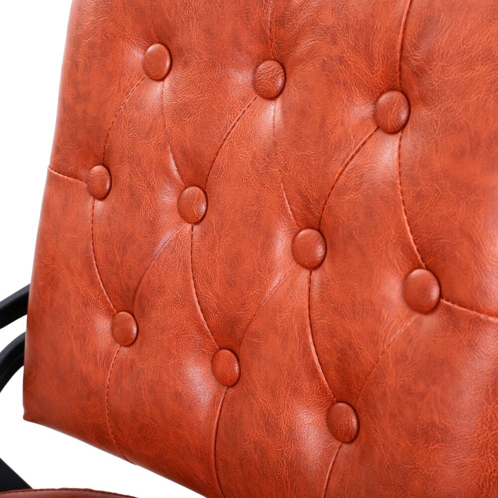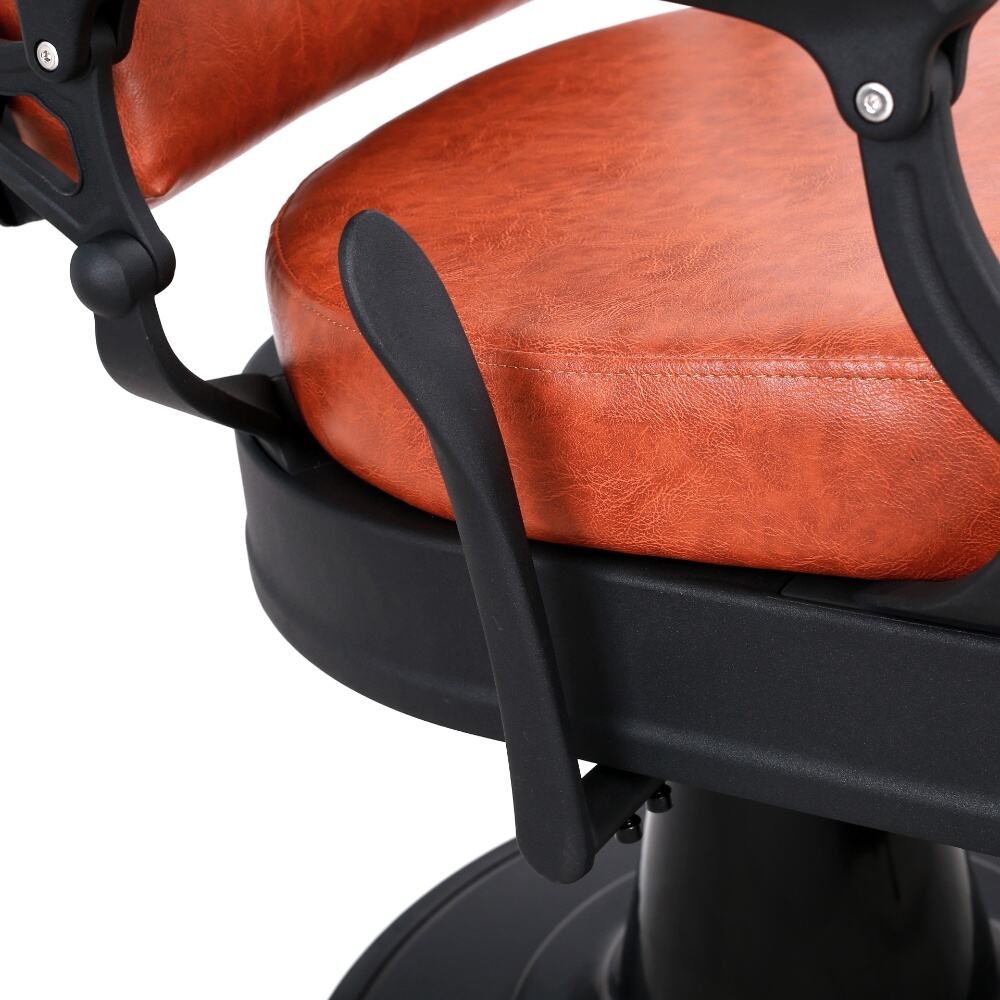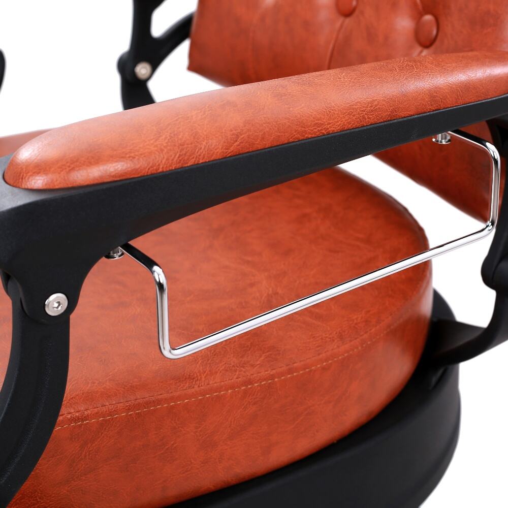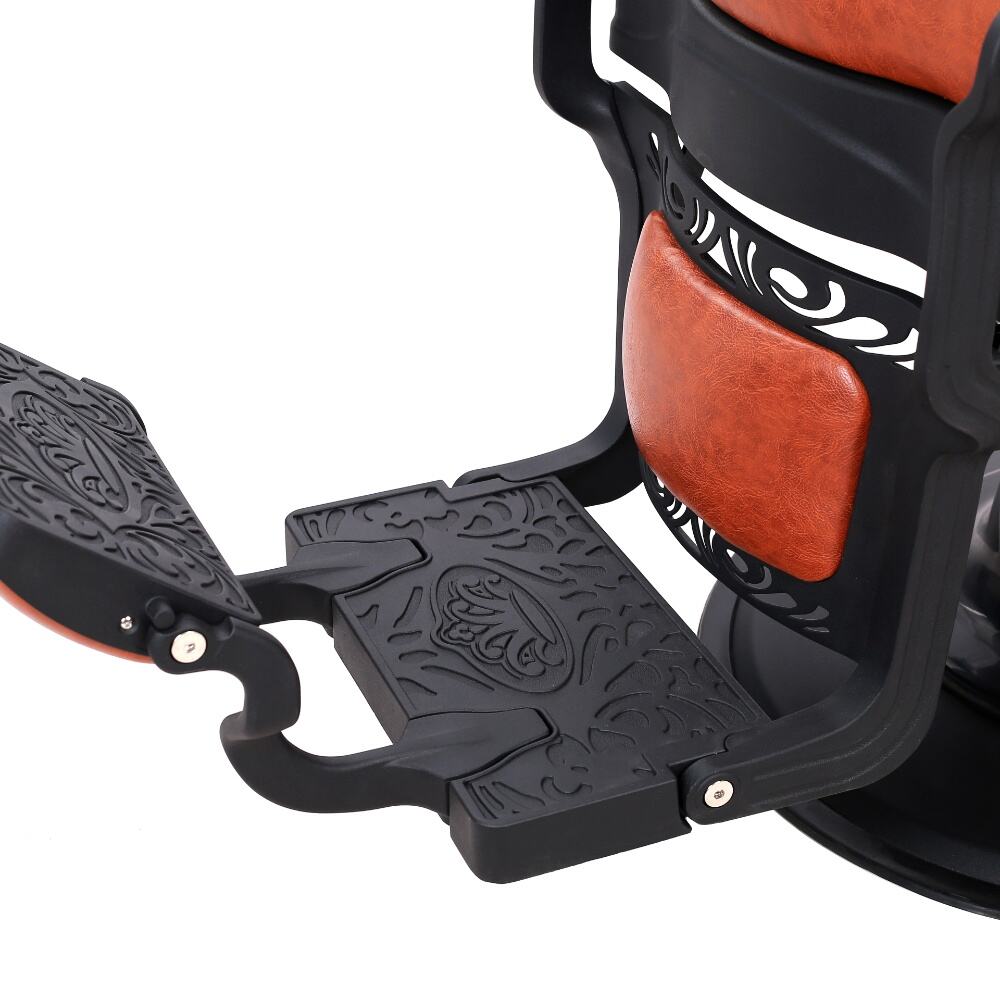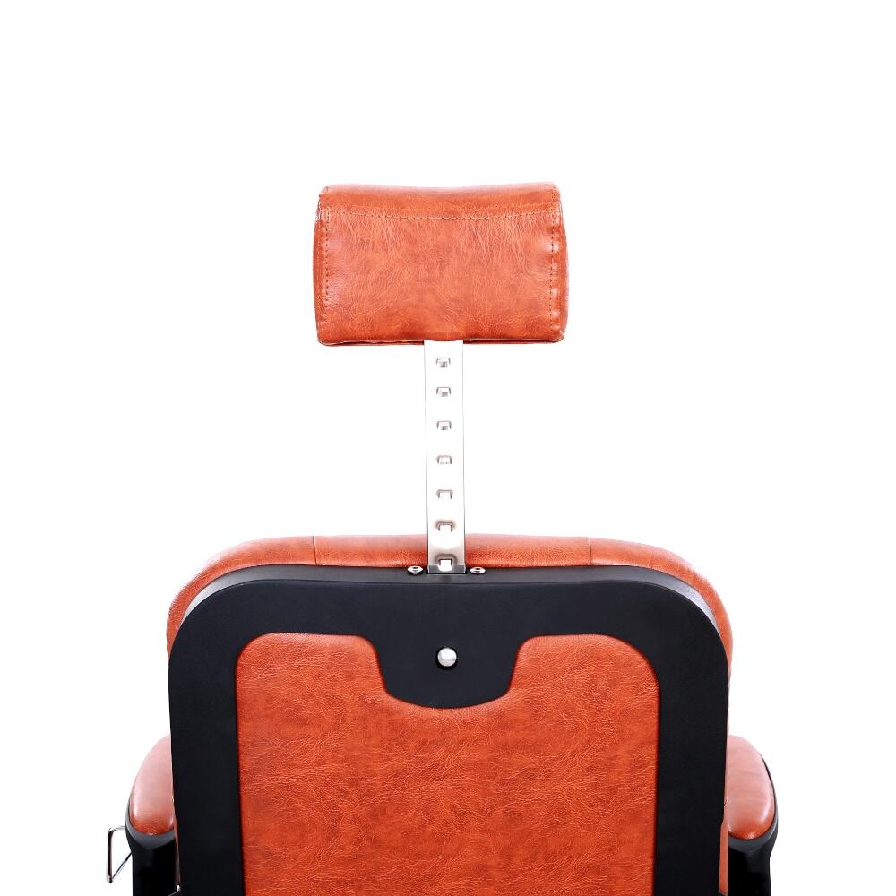 The barber chair that perfectly combines vintage charm with modern functionality.It features a warm orange leather upholstery with classic button tufting on the backrest, bringing a touch of retro elegance. The black metal frame, with its sleek lines and subtle decorative cutouts, adds a contemporary edge, creating a harmonious blend of old - timey and modern aesthetics.For comfort, the generously padded seat and backrest, along with the adjustable headrest, ensure clients can relax throughout their grooming sessions. Functionally, it comes with a smooth hydraulic system for easy height adjustment, a 360 - degree swivel function for optimal positioning, and a reclining backrest with an extendable footrest to meet various barbering needs, whether it's a haircut or a shave.Built to last with a sturdy base and high - quality materials, this chair is not only a practical tool for barbers but also a visually appealing piece that can enhance the atmosphere of any barbershop.
