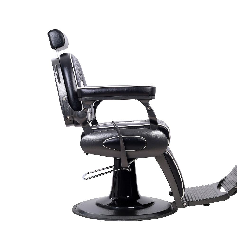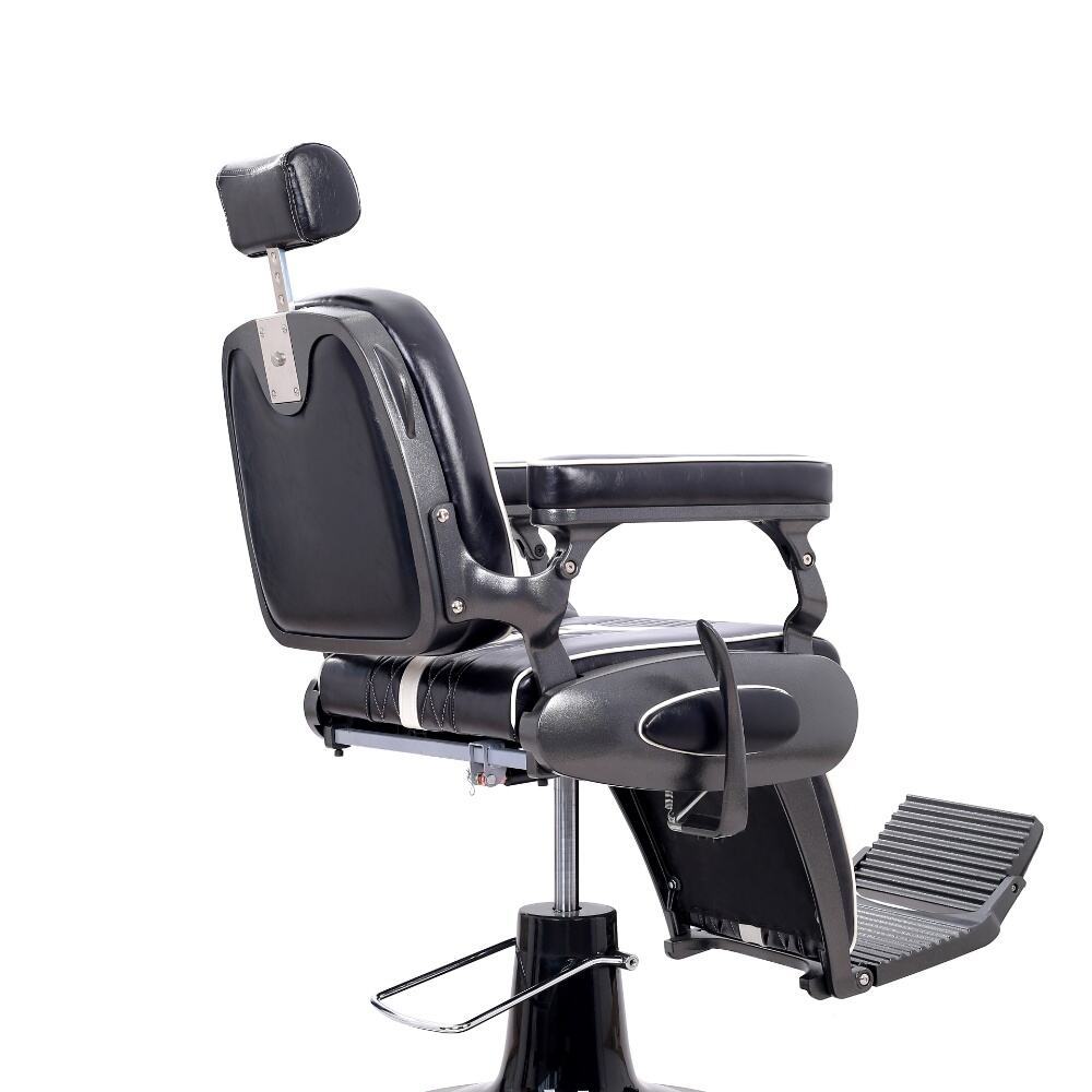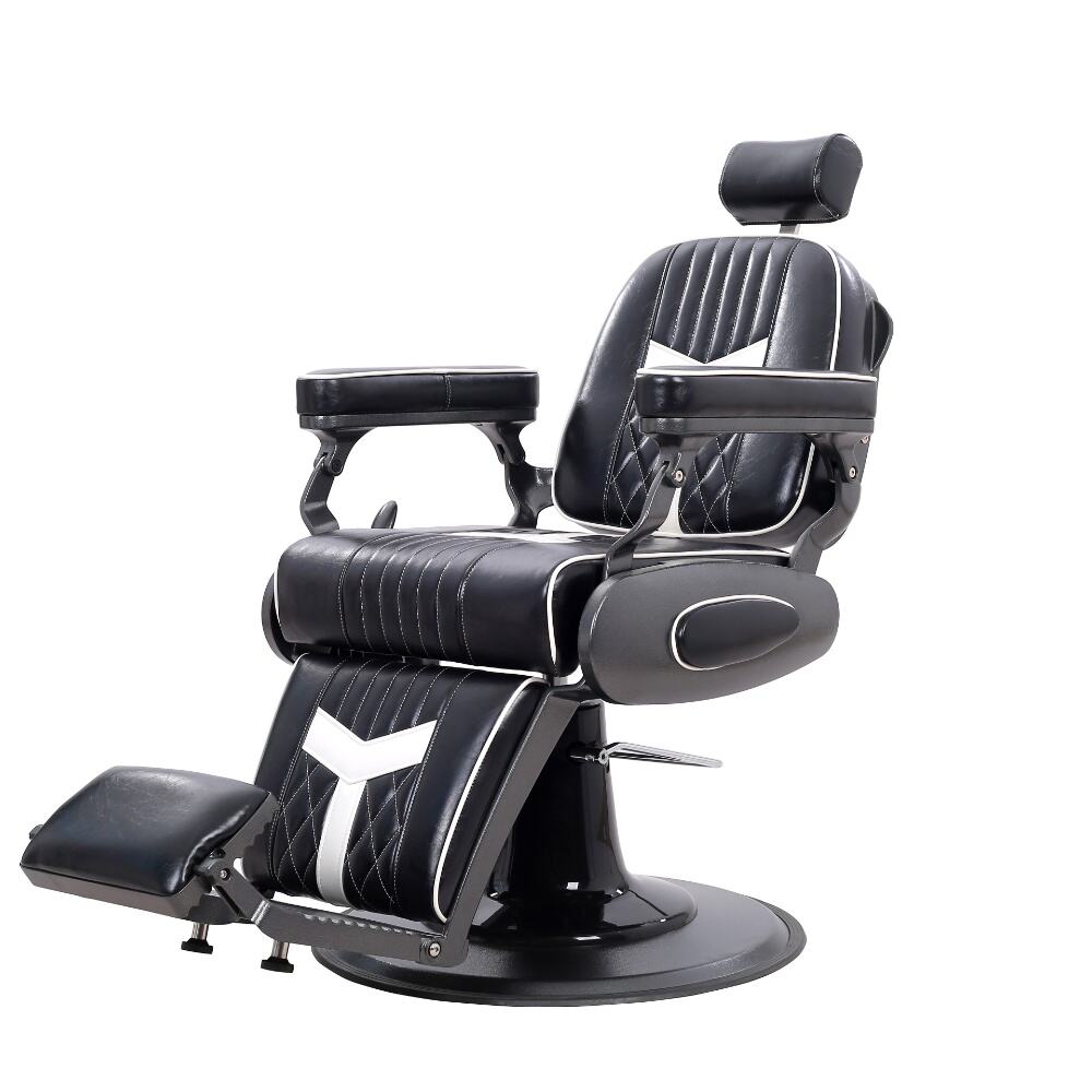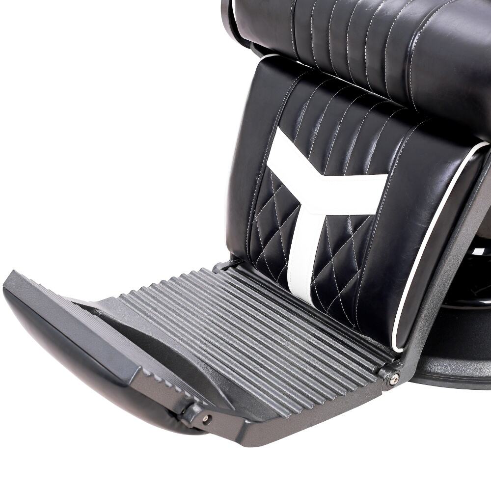 This barber chair is a perfect blend of style and functionality. Upholstered in sleek black leather with elegant white accents, it boasts a classic yet modern design that can elevate the aesthetic of any barbershop.It is equipped with adjustable features, including a reclining backrest and an extendable footrest, ensuring maximum comfort for clients during their haircut or shave. The sturdy armrests and headrest add to the overall comfort and support.Crafted with high-quality materials, this chair is not only durable but also easy to clean and maintain, making it an ideal choice for professional barbers who prioritize both client comfort and the longevity of their equipment.