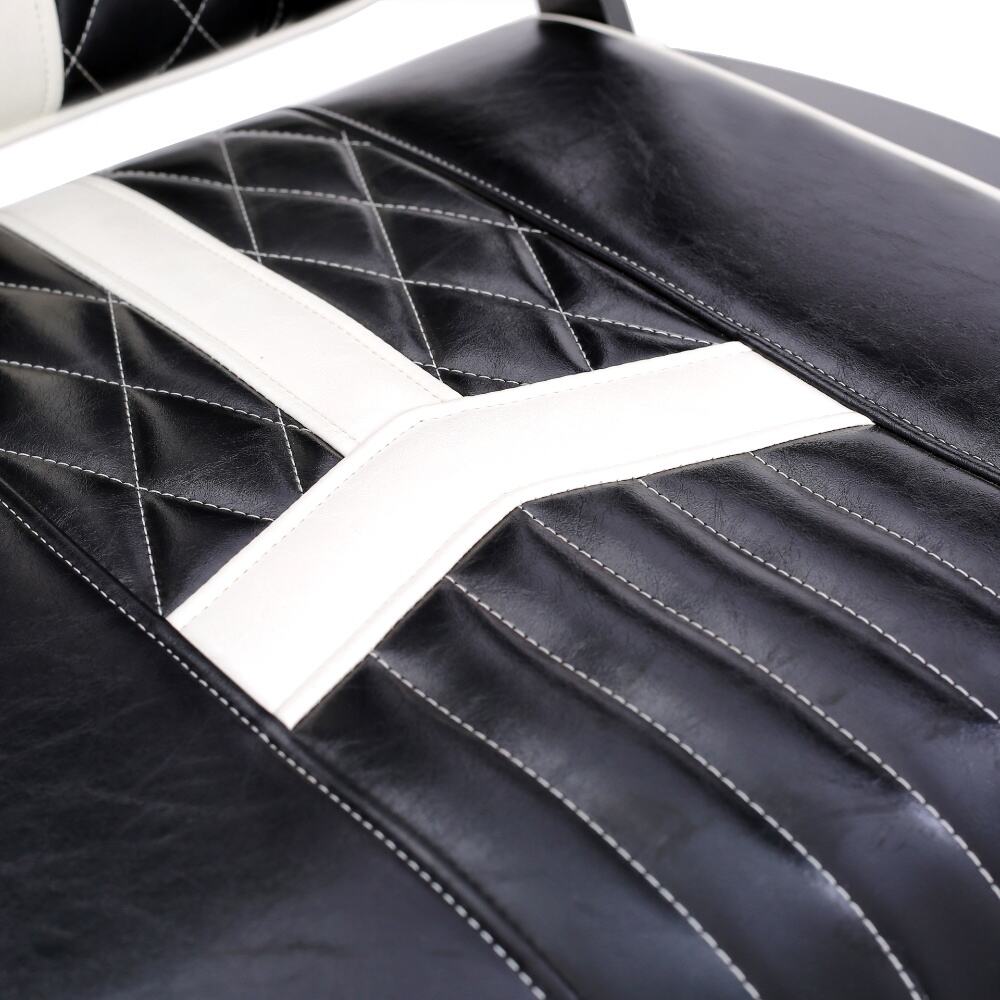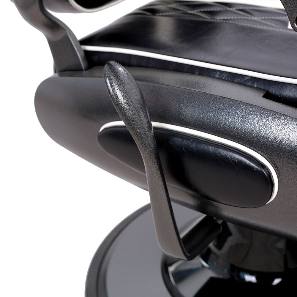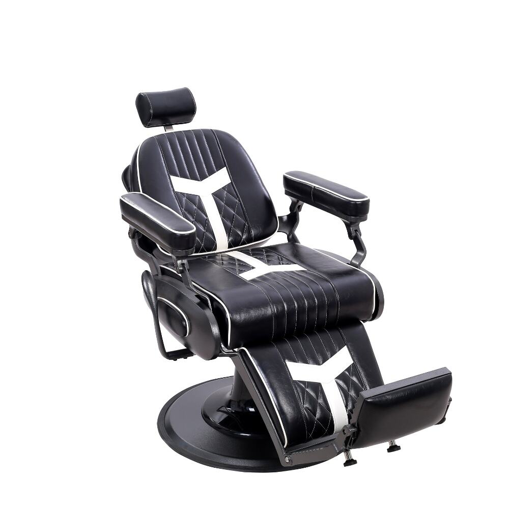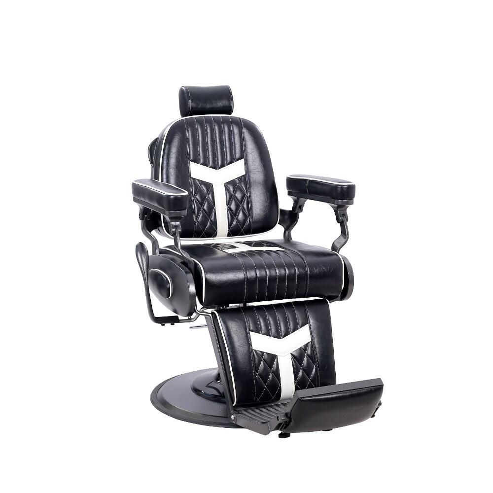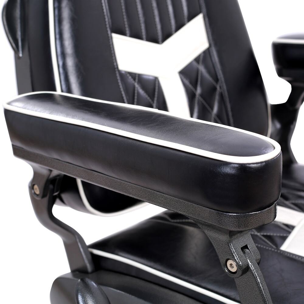 This barber chair is a perfect blend of style and functionality. Upholstered in sleek black leather with elegant white accents, it boasts a classic yet modern design that can elevate the aesthetic of any barbershop.It is equipped with adjustable features, including a reclining backrest and an extendable footrest, ensuring maximum comfort for clients during their haircut or shave. The sturdy armrests and headrest add to the overall comfort and support.Crafted with high-quality materials, this chair is not only durable but also easy to clean and maintain, making it an ideal choice for professional barbers who prioritize both client comfort and the longevity of their equipment.
