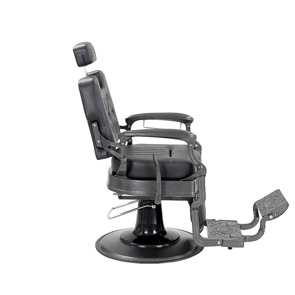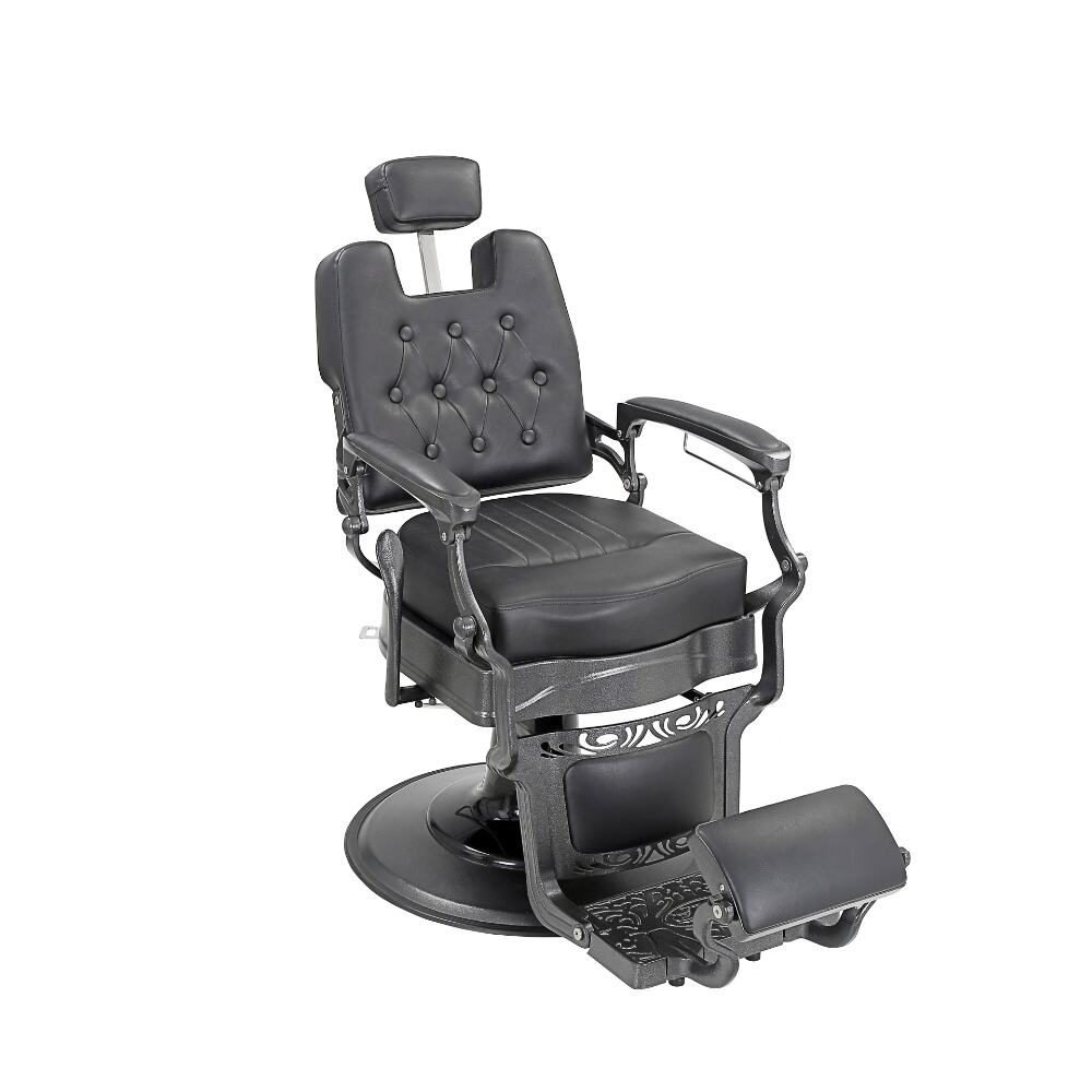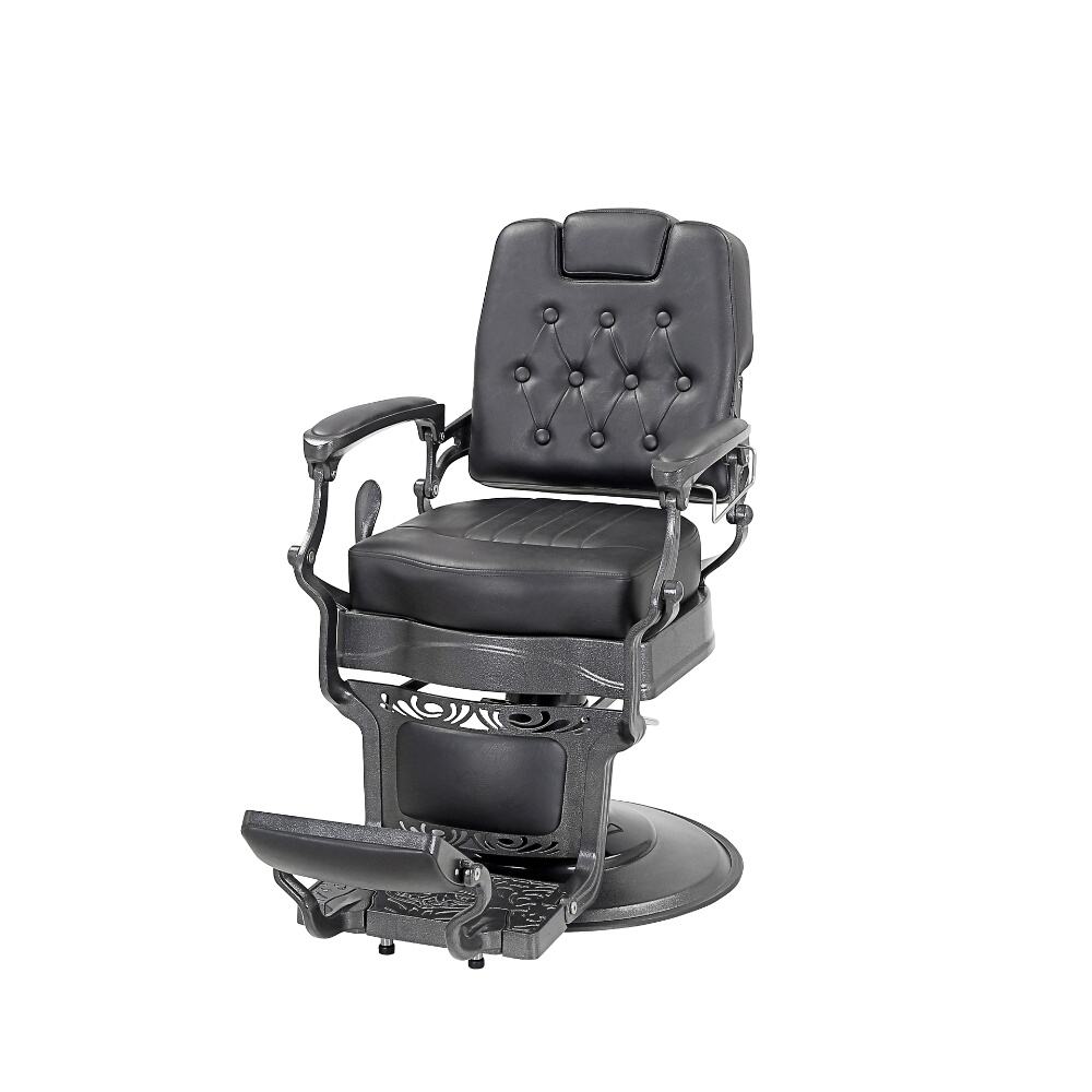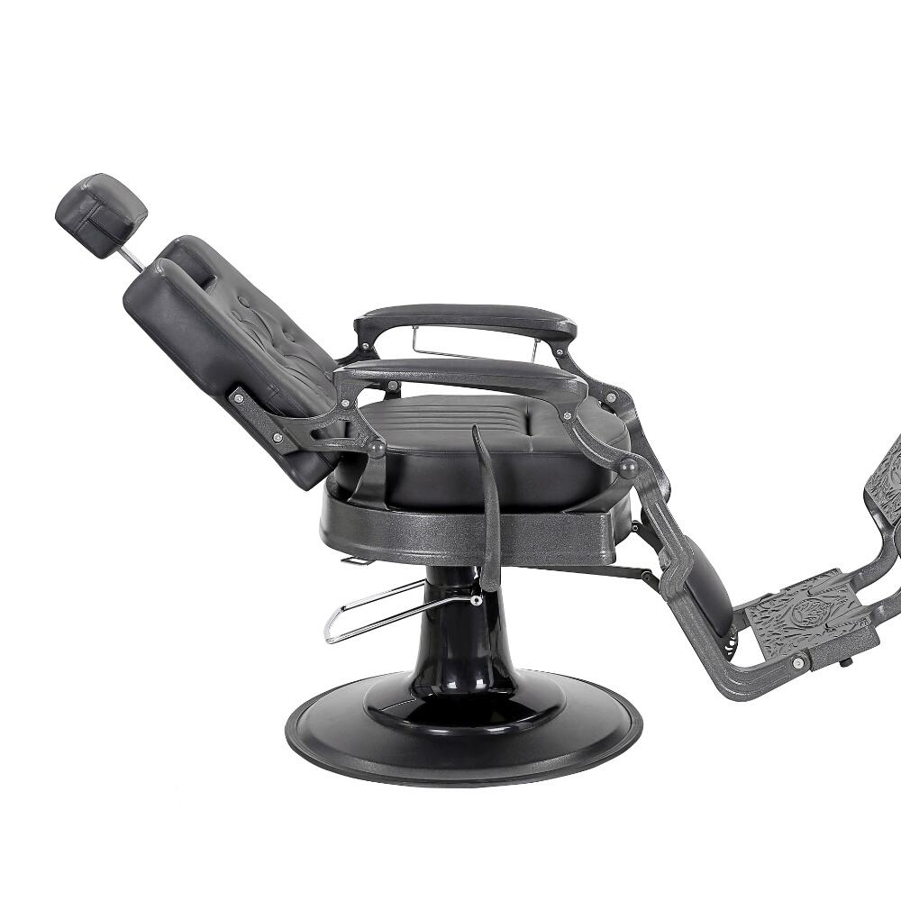 This barber chair is a perfect embodiment of understated elegance and practicality. Upholstered in smooth black leather with a classic tufted design on the backrest, it offers a timeless and sophisticated look.The chair comes with adjustable features, including a reclining back and an adjustable headrest, ensuring clients can relax in utmost comfort during haircuts, shaves, or other grooming services. Its sturdy metal frame and comfortable armrests not only guarantee durability but also provide a secure and pleasant seating experience.Whether in a traditional barbershop or a modern salon, this chair seamlessly combines style and functionality, enhancing the overall atmosphere while delivering a comfortable service for every client.