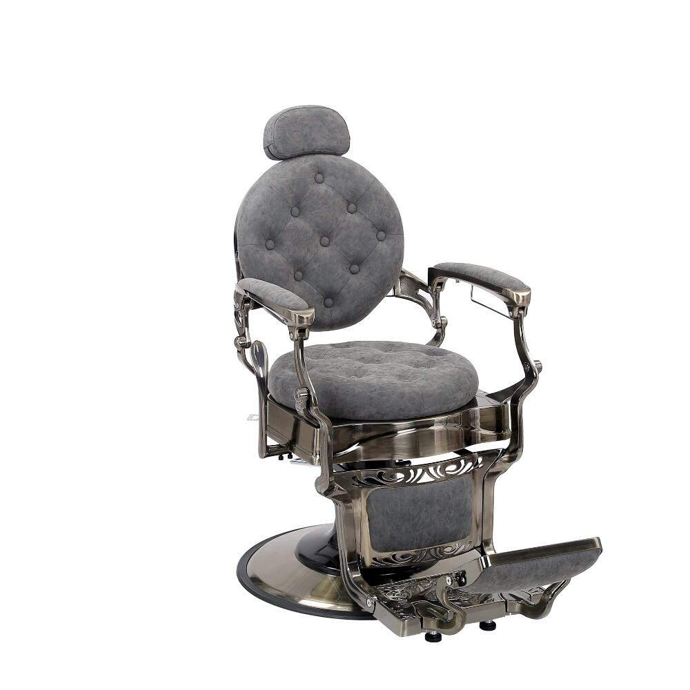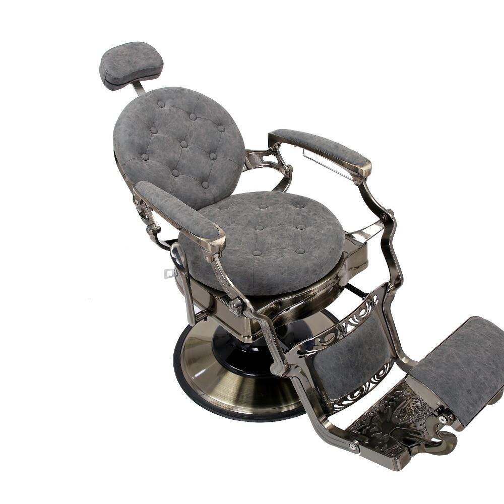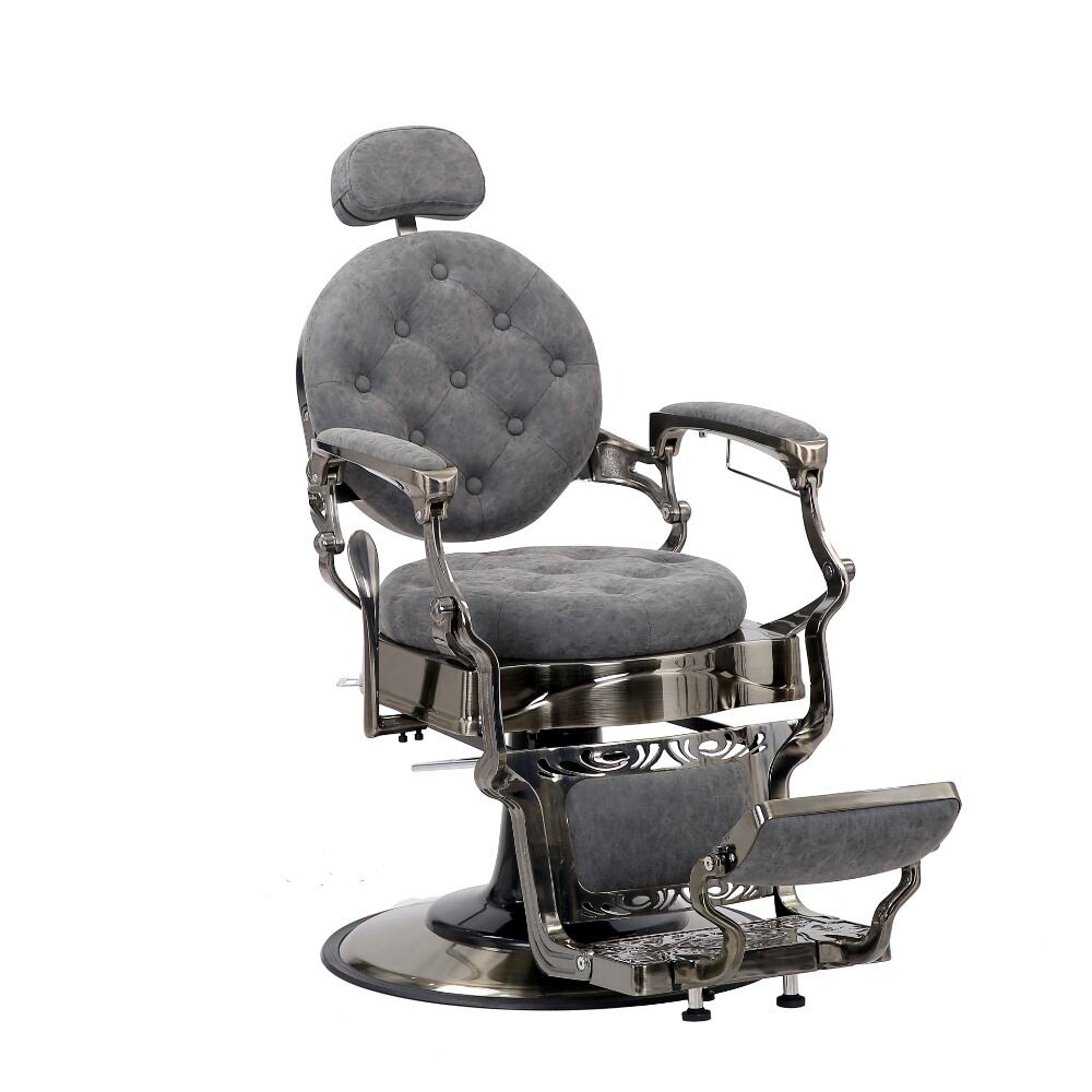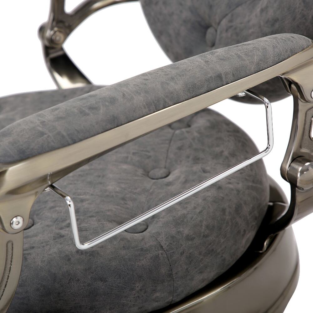 This barber chair is a stunning blend of elegance and comfort. The gray upholstery, featuring a tufted design, not only looks refined but also offers a plush and cozy seating experience.The sleek, metallic frame adds a touch of modern sophistication, complementing the gray fabric perfectly. It comes with adjustable components, enabling easy customization to suit different customers' height and angle preferences.Whether for a quick haircut or a more leisurely grooming session, this chair ensures that clients can relax in style. It's an excellent addition to any barbershop, elevating both the aesthetic and the level of comfort provided.