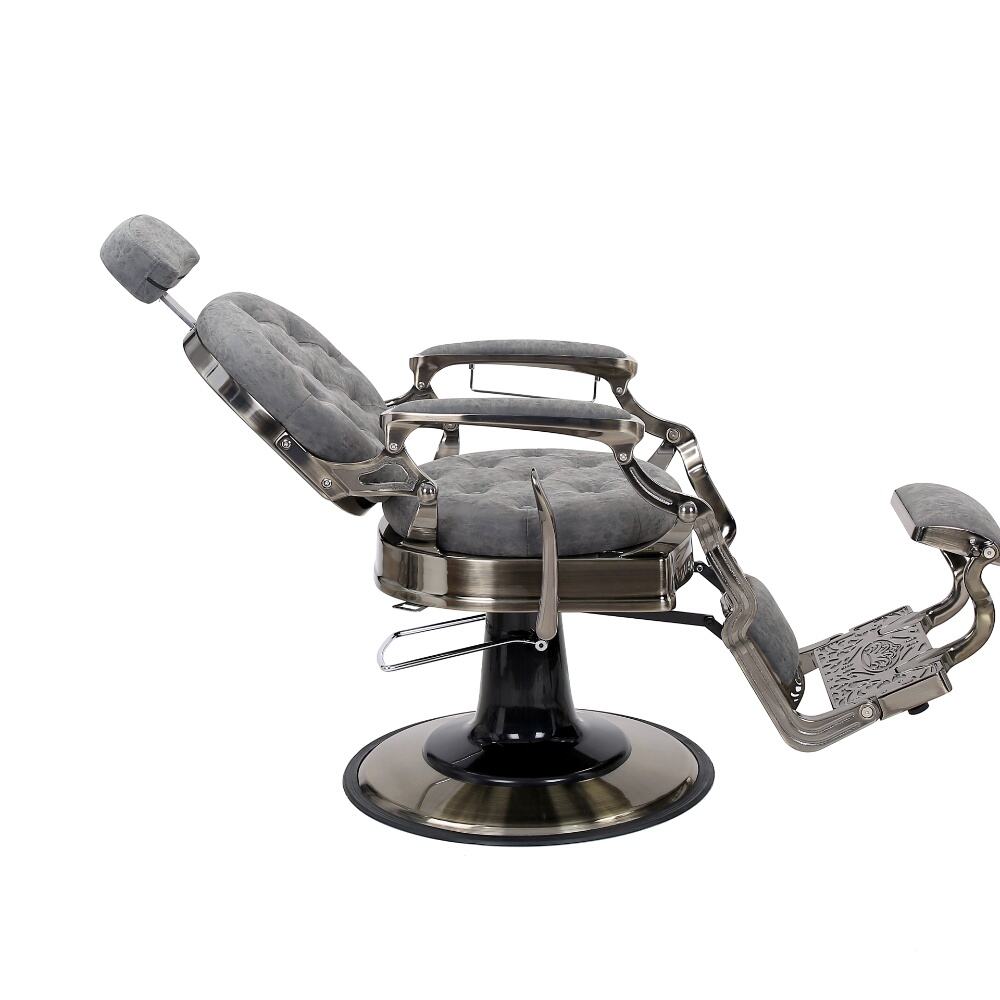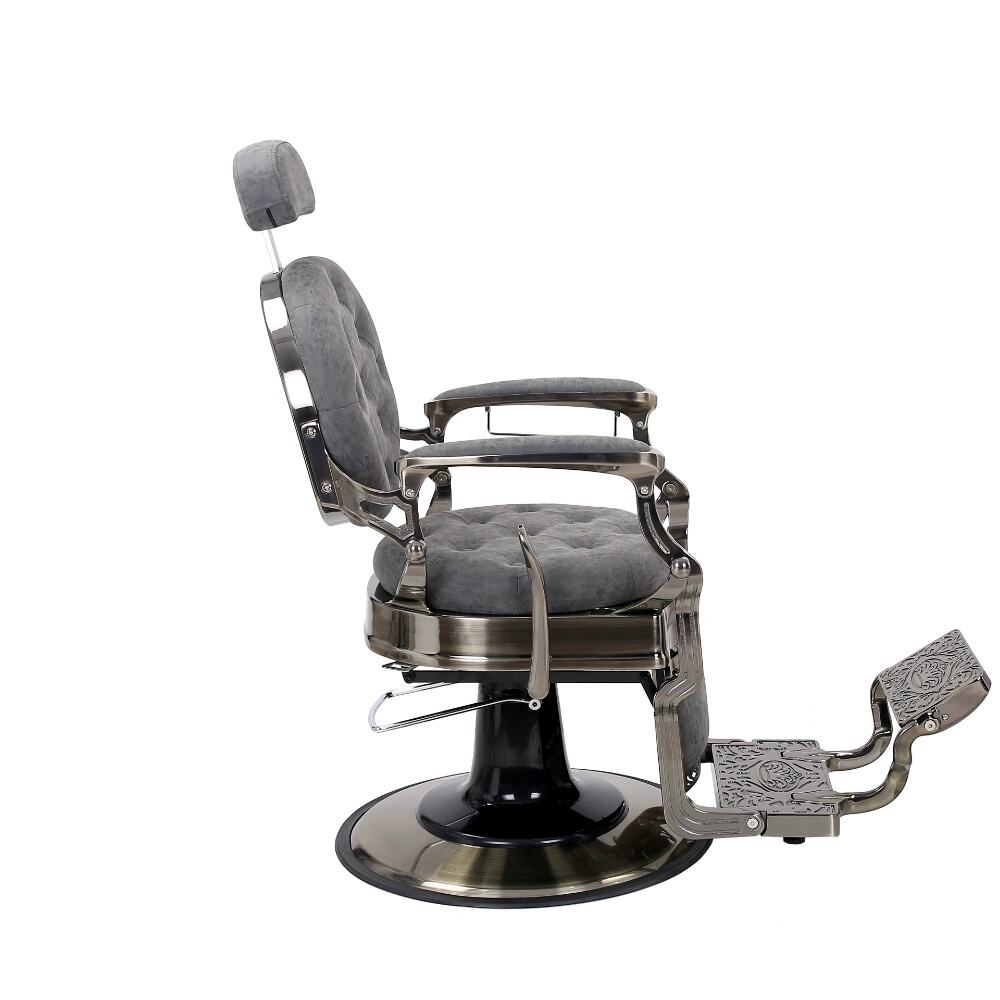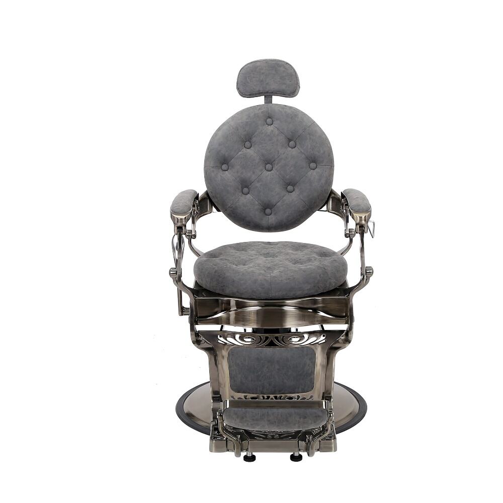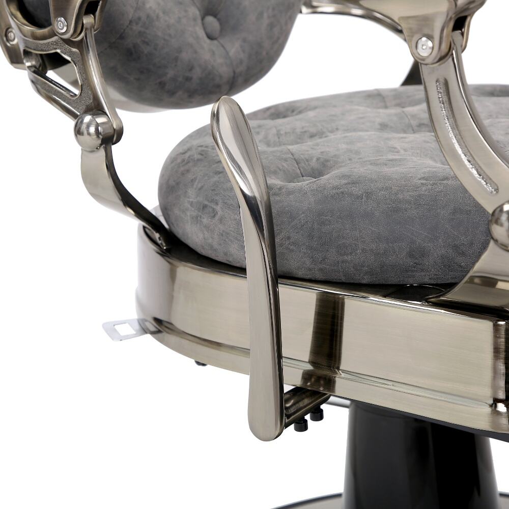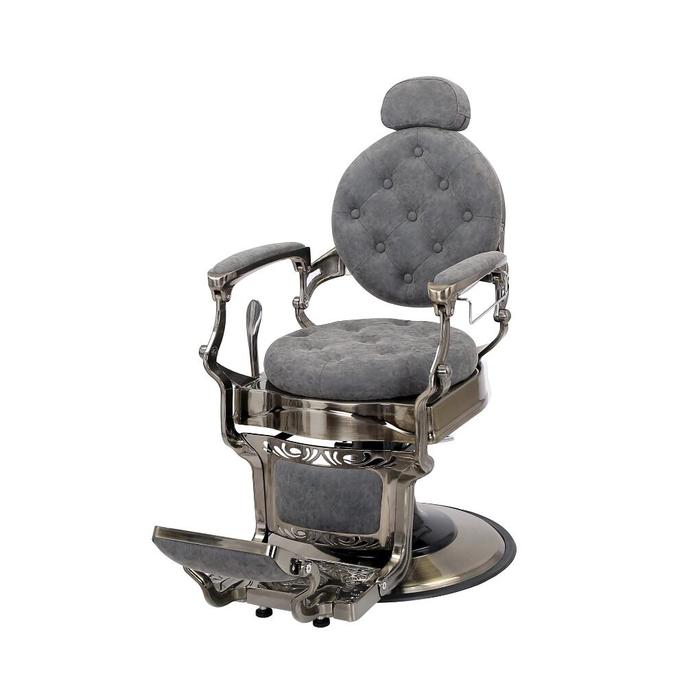 This barber chair is a stunning blend of elegance and comfort. The gray upholstery, featuring a tufted design, not only looks refined but also offers a plush and cozy seating experience.The sleek, metallic frame adds a touch of modern sophistication, complementing the gray fabric perfectly. It comes with adjustable components, enabling easy customization to suit different customers' height and angle preferences.Whether for a quick haircut or a more leisurely grooming session, this chair ensures that clients can relax in style. It's an excellent addition to any barbershop, elevating both the aesthetic and the level of comfort provided.